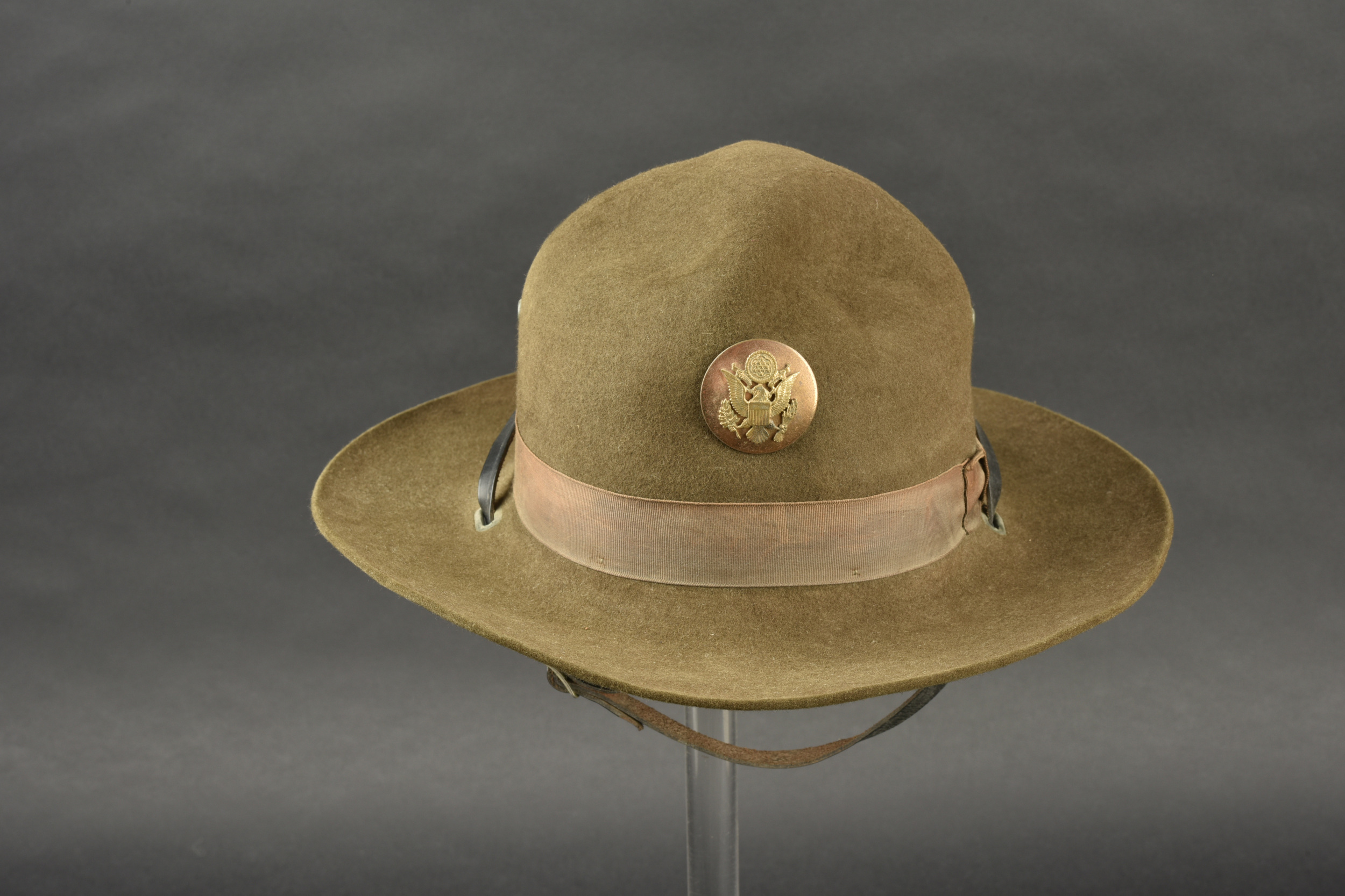 Détails de la vente >Campaign Hat. En feutrine kaki. Bandeau en tissu coton marron. Insigne troupe US en métal doré, fermoir à vis. Fausse jugulaire en cuir complète. Bandeau de sudation en simili cuir marron.... en savoir plus