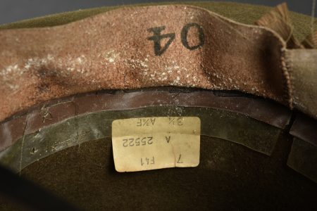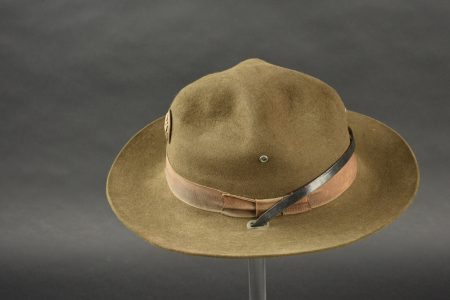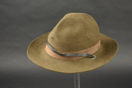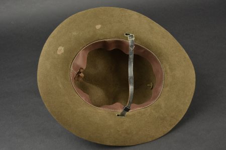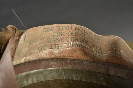 Campaign Hat. En feutrine kaki. Bandeau en tissu coton marron. Insigne troupe US en métal doré, fermoir à vis. Fausse jugulaire en cuir complète. Bandeau de sudation en simili cuir marron. Marquages sous le bandeau Hat Service Felt OD Dla 100-80-C-3480 8405-00-890-1812 Stratton Hats INc. A noter une certaine usure et patine de la pièce, ainsi que des manques. Etat II+.