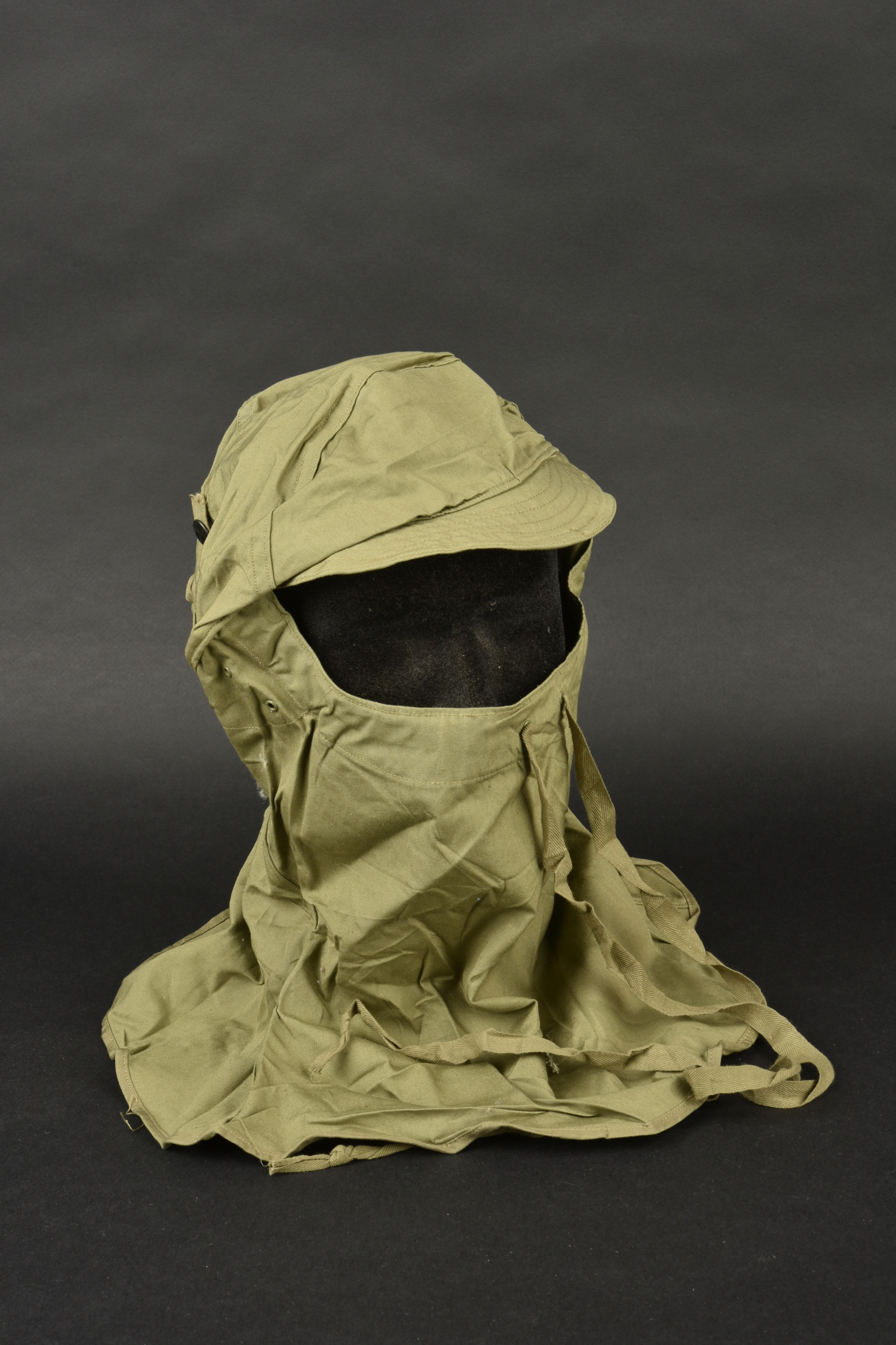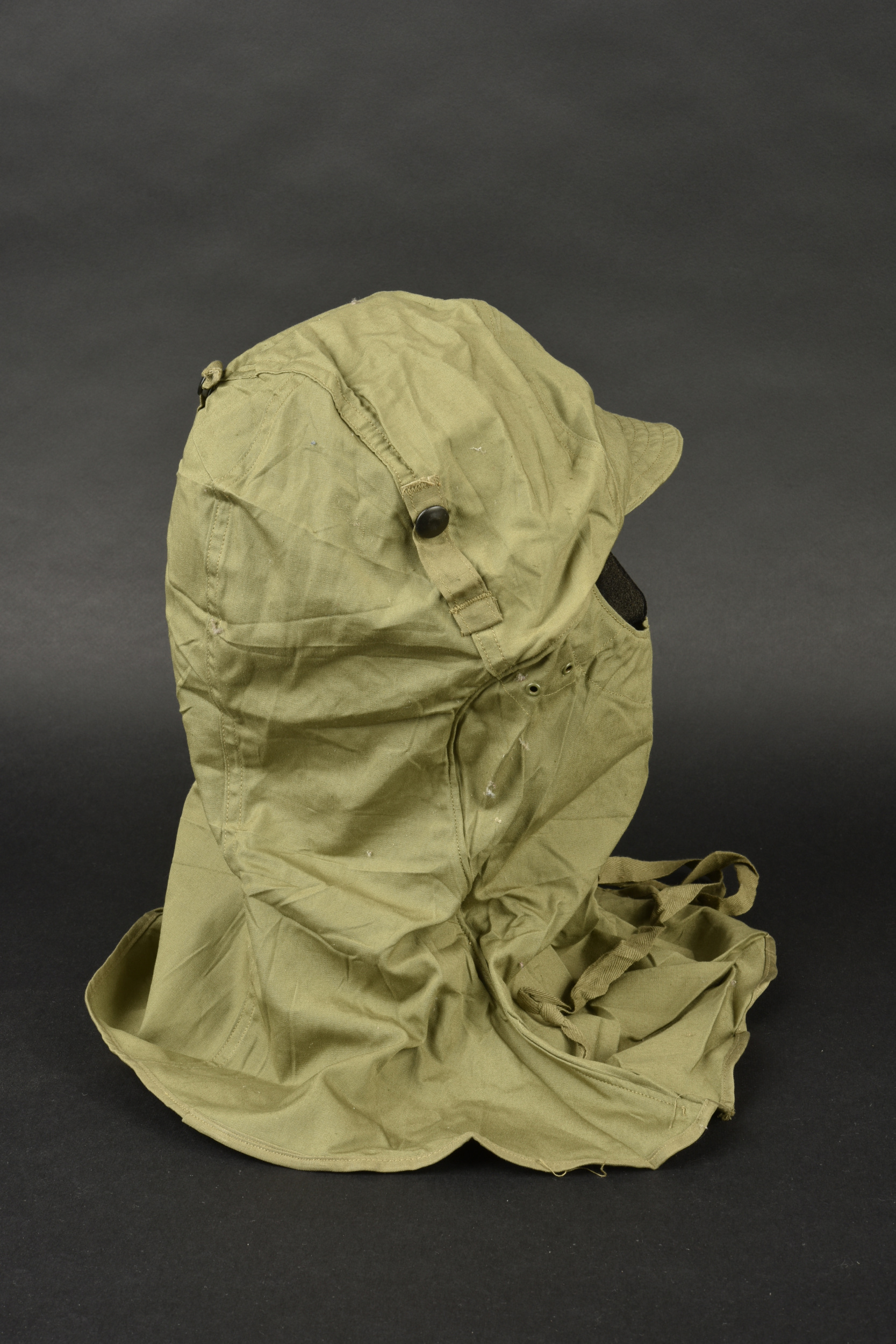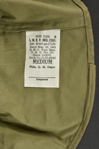 Capuche de veste M-41. En toile OD3. Visière en bon état. Les lacets sont présents. Etiquette du fabricant LMRV MFG Corps, datée du 22 mars 1943. Taille Médium. A noter une certaine usure et patine de la pièce. Etat II+.