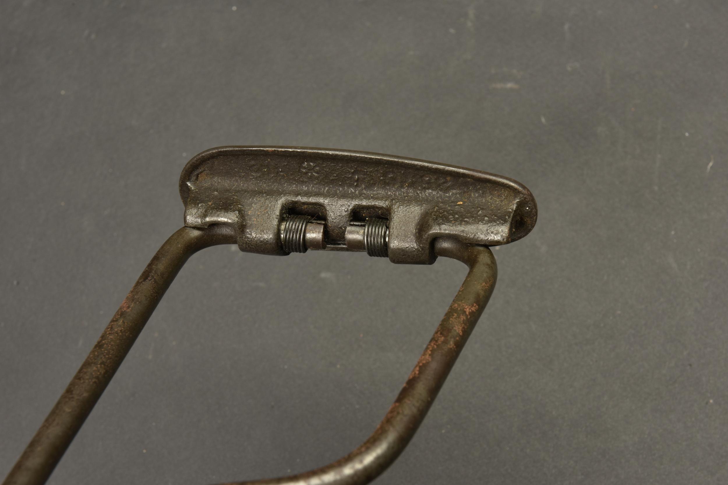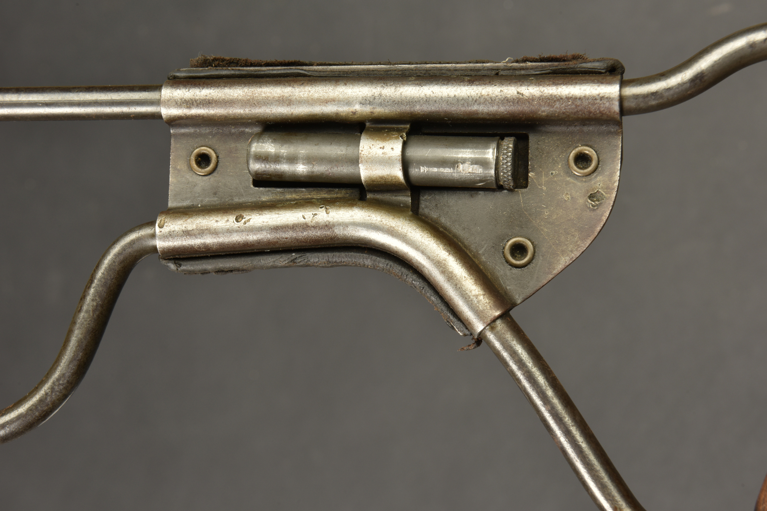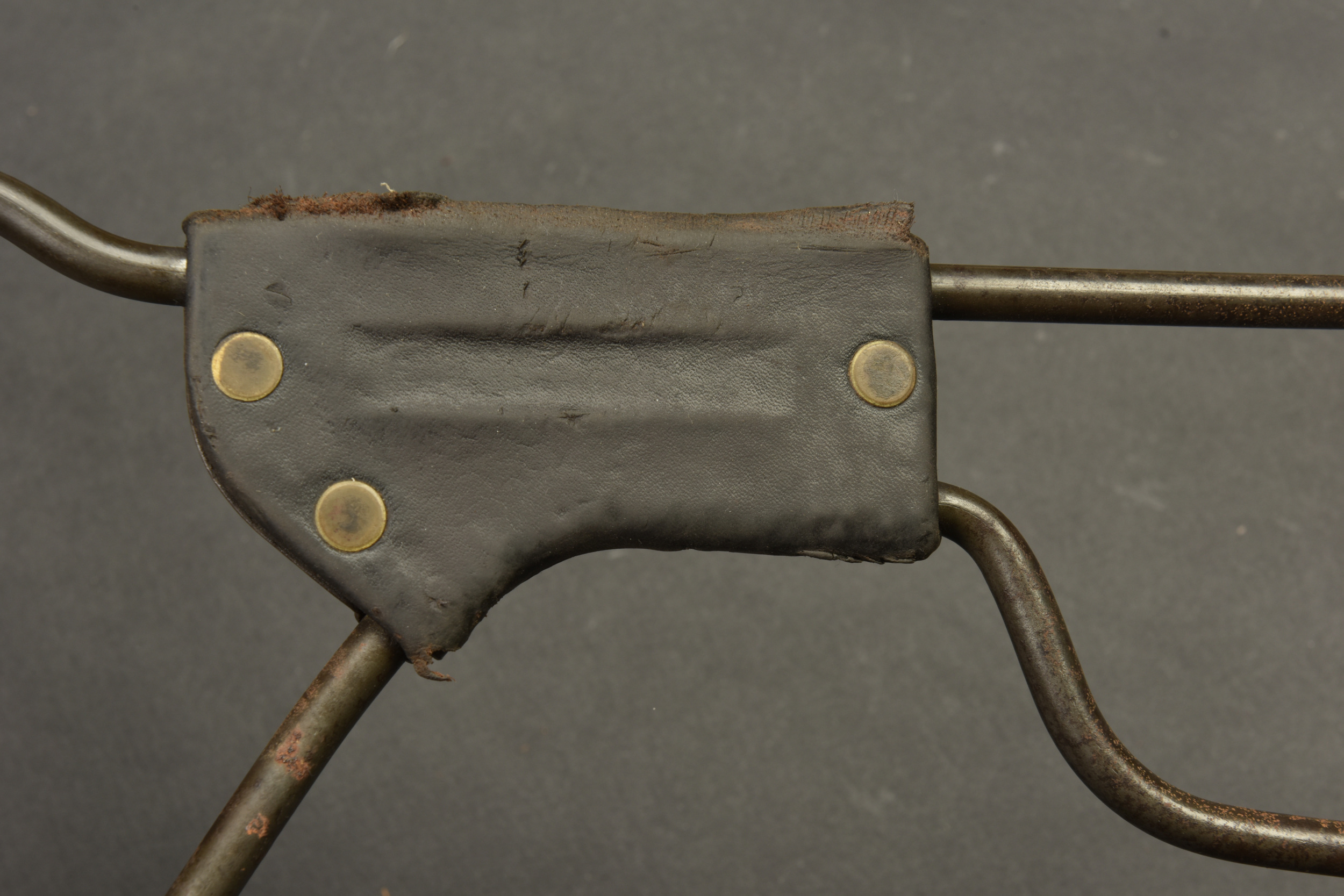 Carabine USM1A1. Garnitures métalliques en très bon état. Canon de fabrication General Motors, daté du mois de septembre 1943. Fabrication Inland Division. Numéro 832834. Chargeur présent bloquée par la neutralisation. Hausse en L. Culasse mobile par une neutralisation +. Belle crosse en bois. Crosse en métal pliante, complète, numéro 2576 11 12. Appuie joue en cuir présent, mais incomplet, et fortement graissé. Bretelle en toile postérieure. Catégorie C9. Arme neutralisée aux nouvelles normes européenne par le Banc d’épreuve de Saint Etienne. Cette arme doit être déclarée avec Cerfa et certificat médical de moins de 1 mois ou licence de tir tamponnée ou permis de chasse valide (art R312-56). La délivrance de l’arme n’aura lieu qu’après consultation du fichier Finadia. L’inscription de l’acheteur sur ce fichier entrainera automatiquement la nullité de la vente. A noter une certaine usure et patine de la pièce. Etat II+.