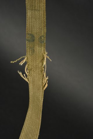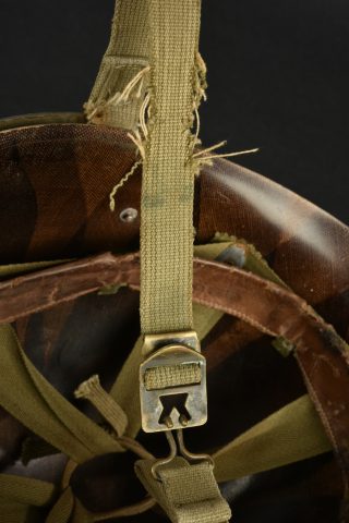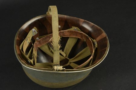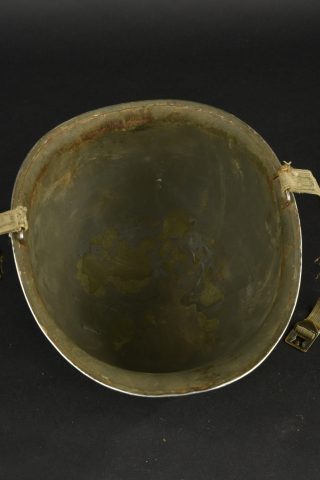 Casque US Navy. Coque de casque USM1, numéro de lot illisible. Intérieur de la coque disposant de plusieurs couches de peinture kaki. Peinture extérieur à 80%. Bande bleue faisant le tour de la coque. Pontets fixes. Les jugulaires sont présentes, mais recousues. La grande jugulaire est effilochée. Liner en matériaux composite haute pression, fabrication Capac. Coiffe complète avec son bandeau de sudation en cuir. Nuquière complète. Jugulaire en cuir absente. Peinture extérieure grenelé à 95%. A noter une certaine usure et patine de la pièce. Etat II+.