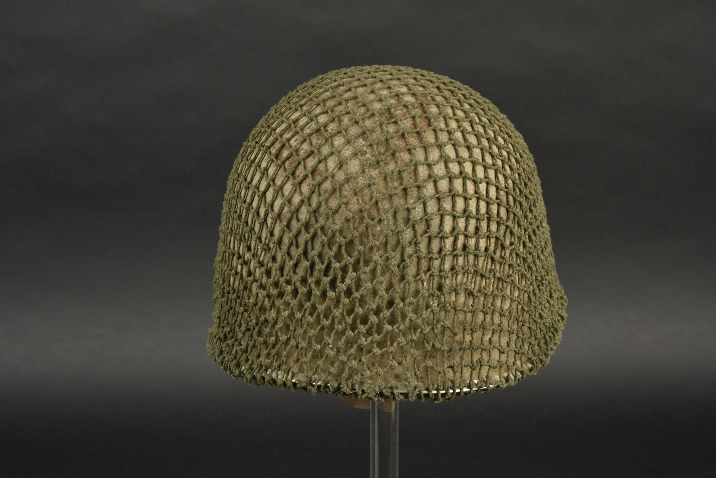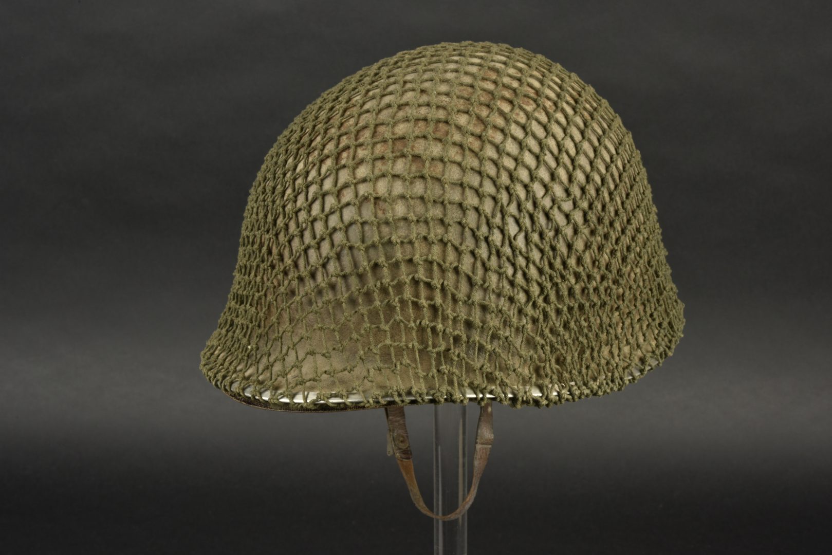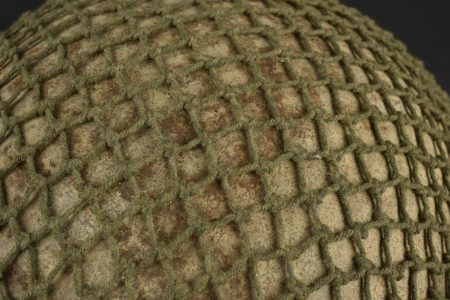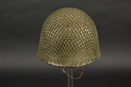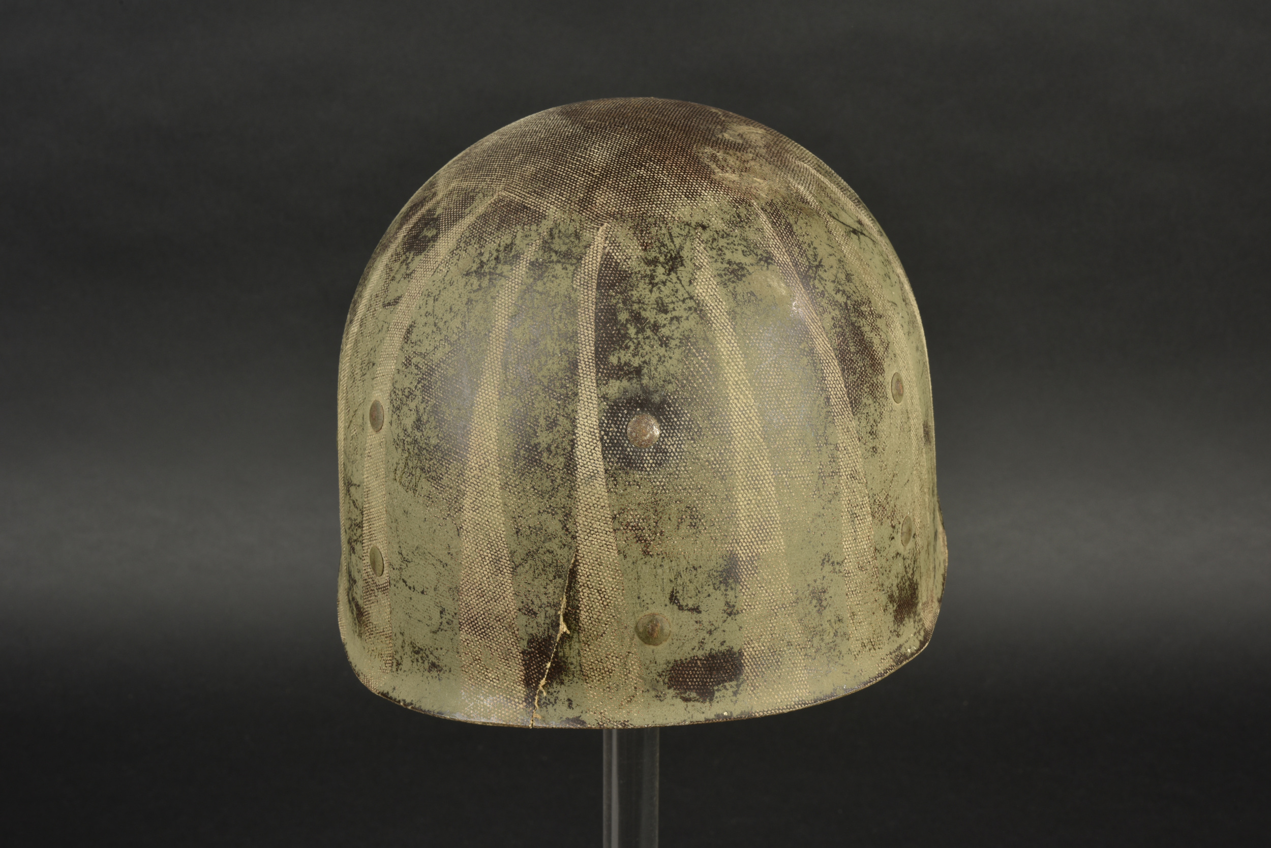 Casque USM1. Coque de casque USM1. Fermeture du jonc à l’avant. Numéro de lot illisible. Pontets fixes, les jugulaires sont manquantes. Coque fortement oxydée. Filet de camouflage petites mailles. Liner en matériaux composite haute pression, fabrication Westinghouse. Coiffe présente, mais incomplète. Certaines sangles sont cassées. Bandeau de sudation fortement usé. Nuquière manquante. Jugulaire en cuir, sans marquages visibles. Peinture kaki à 20%. Une fissure à l’arrière du liner. A noter une certaine usure et patine de la pièce. Etat II+.