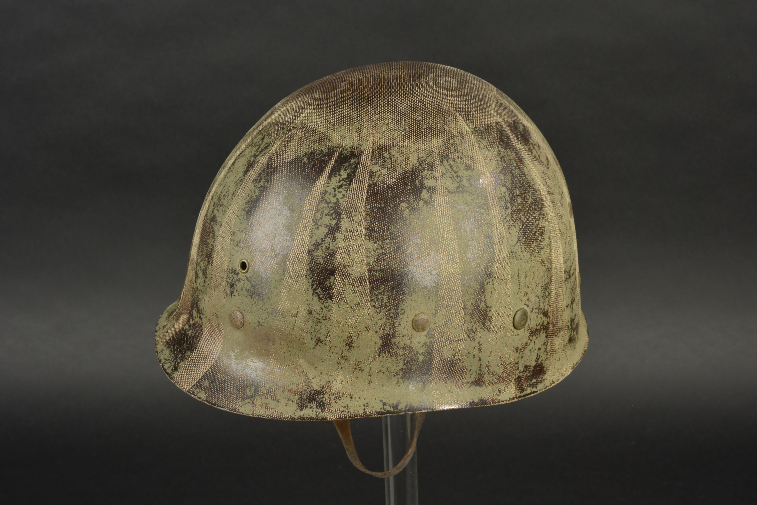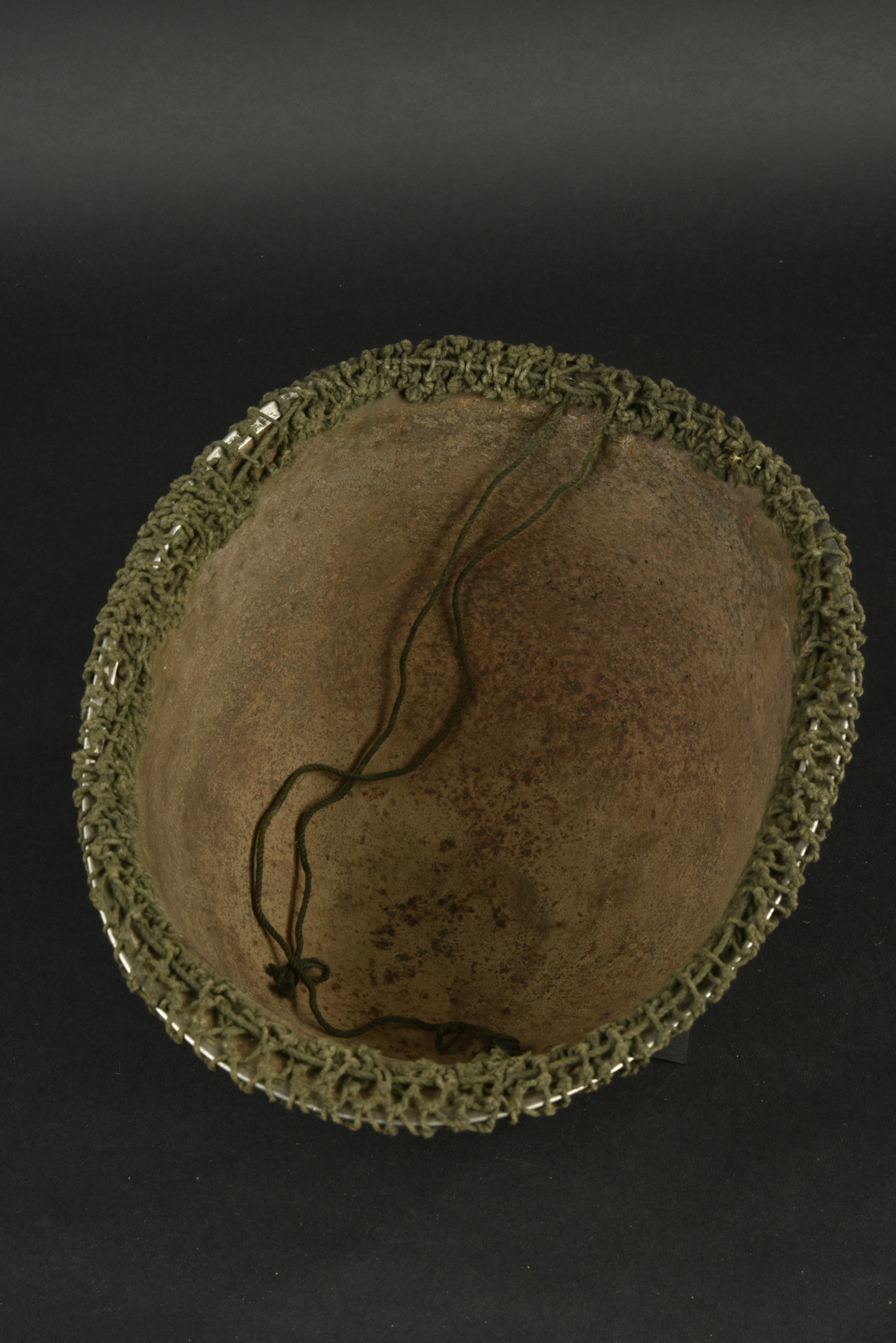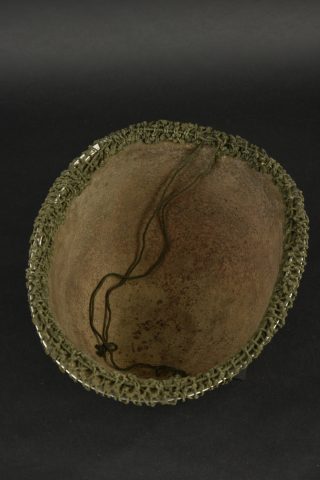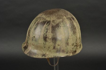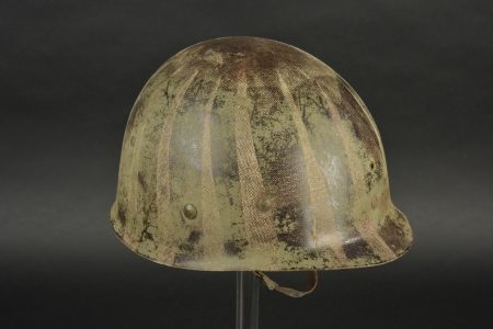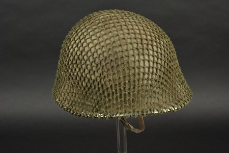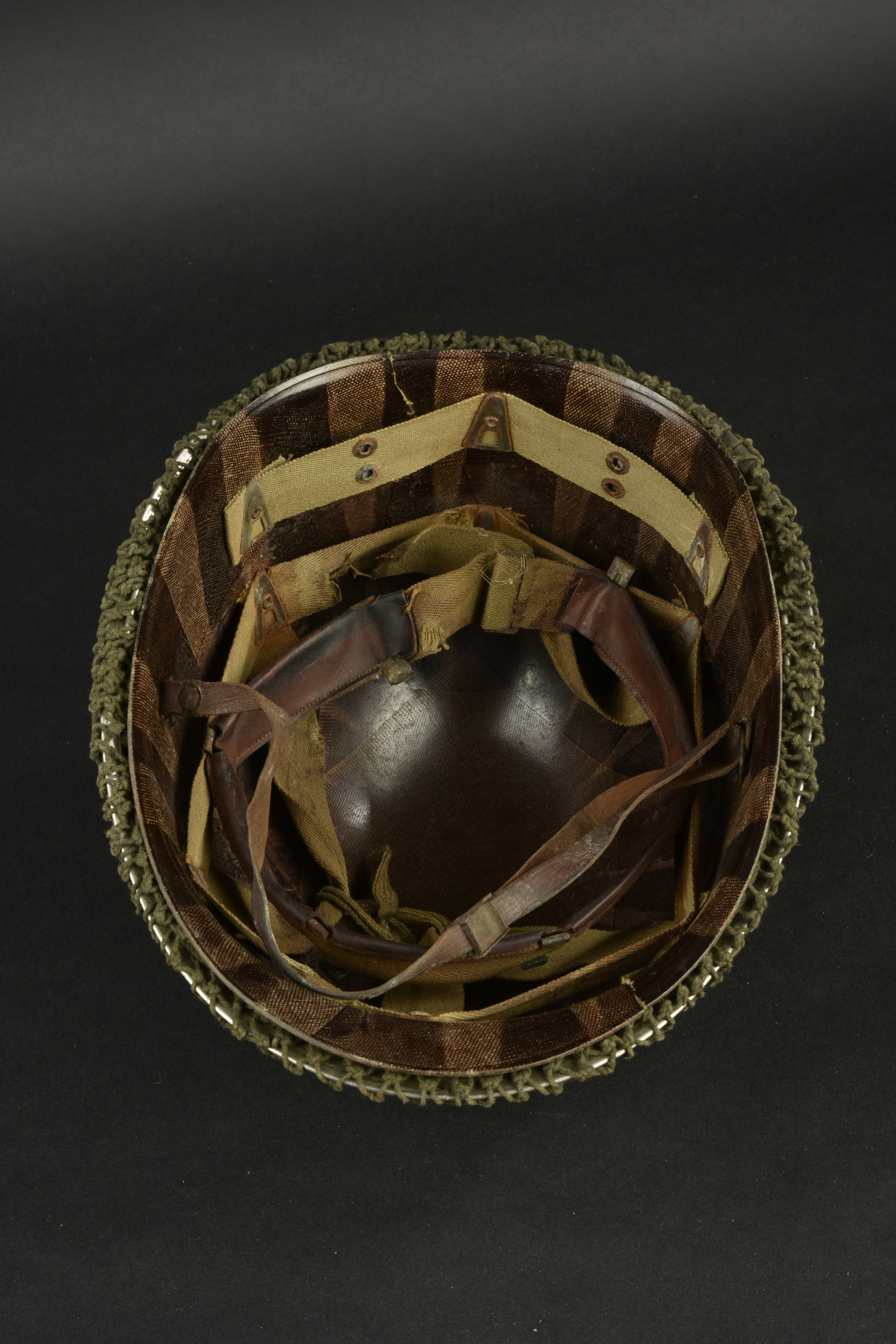 Casque USM1. Coque de casque USM1. Fermeture du jonc à l’avant. Numéro de lot illisible. Pontets fixes, les jugulaires sont manquantes. Coque fortement oxydée. Filet de camouflage petites mailles. Liner en matériaux composite haute pression, fabrication Westinghouse. Coiffe présente, mais incomplète. Certaines sangles sont cassées. Bandeau de sudation fortement usé. Nuquière manquante. Jugulaire en cuir, sans marquages visibles. Peinture kaki à 20%. Une fissure à l’arrière du liner. A noter une certaine usure et patine de la pièce. Etat II+.