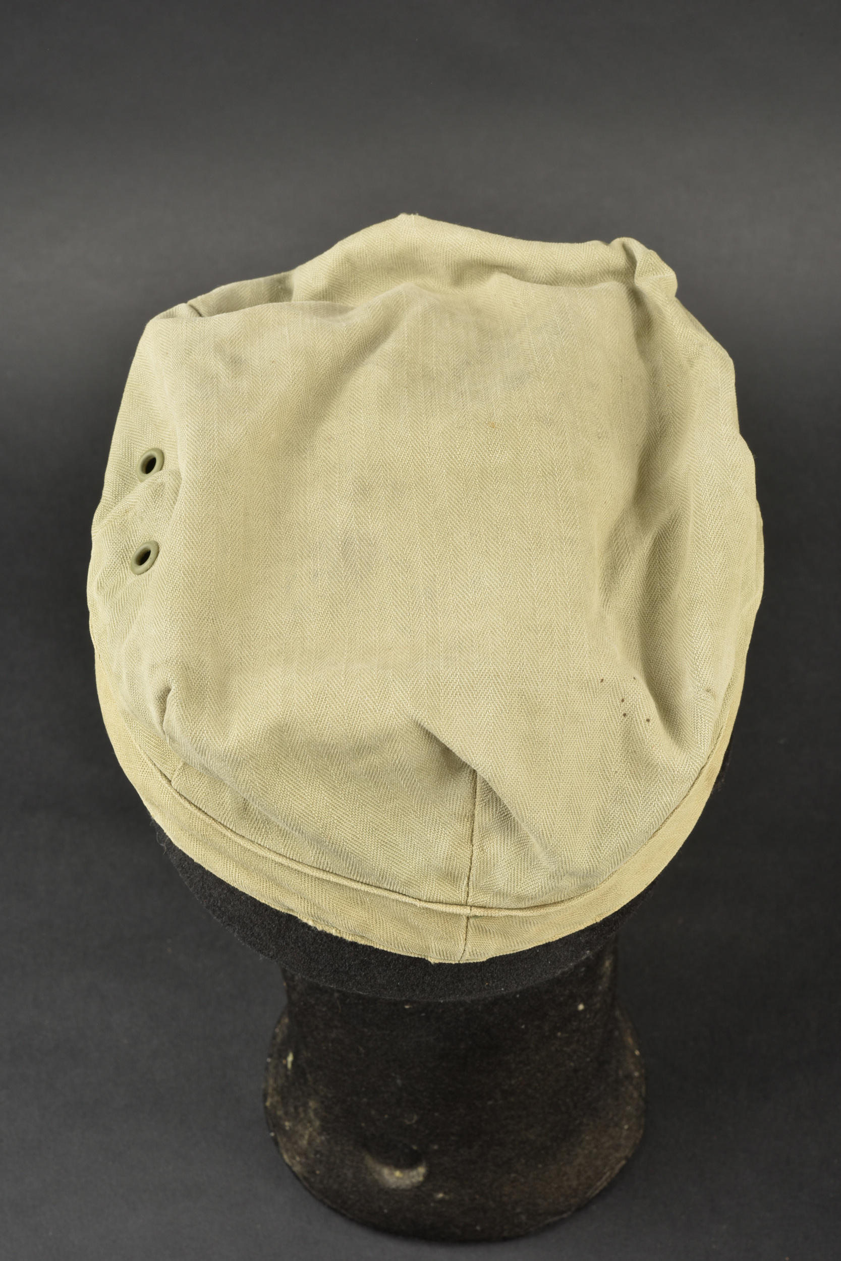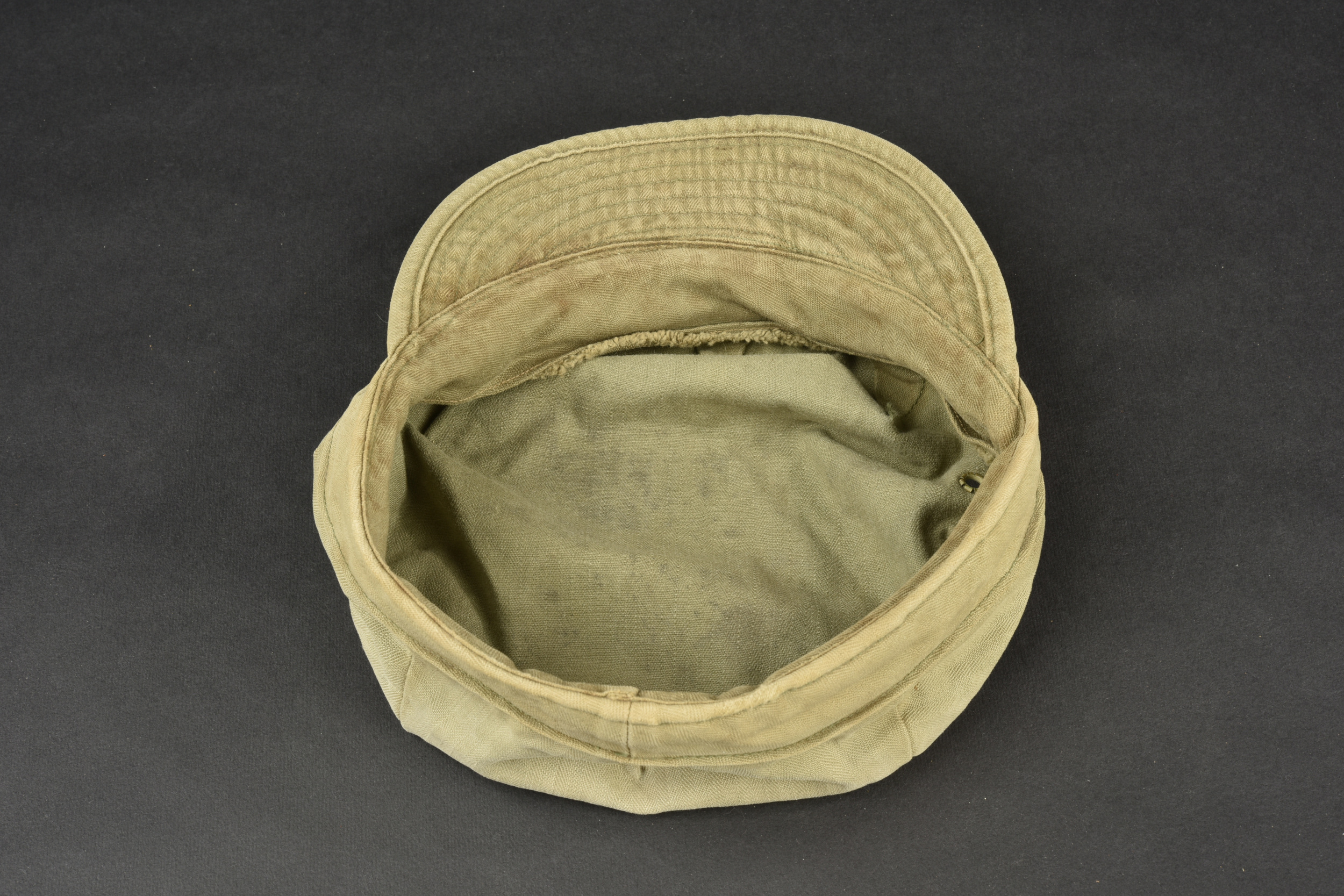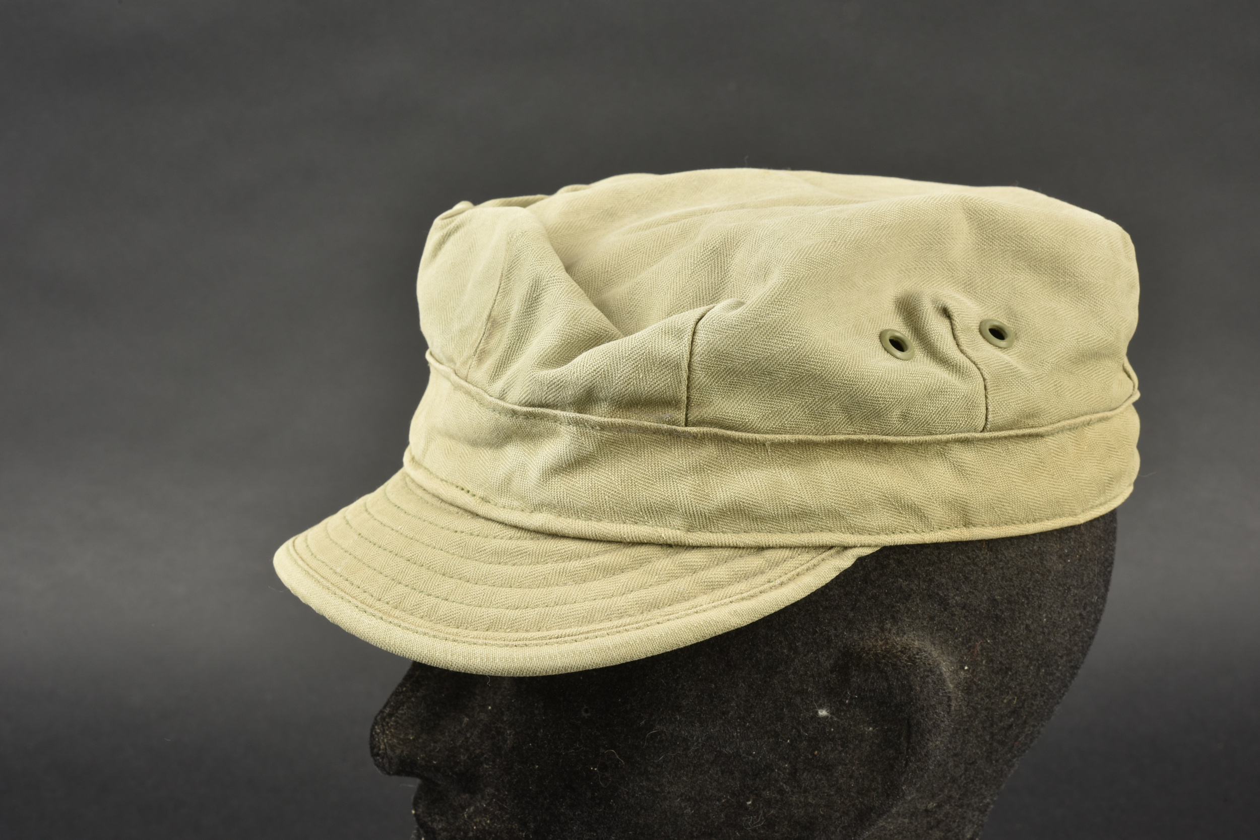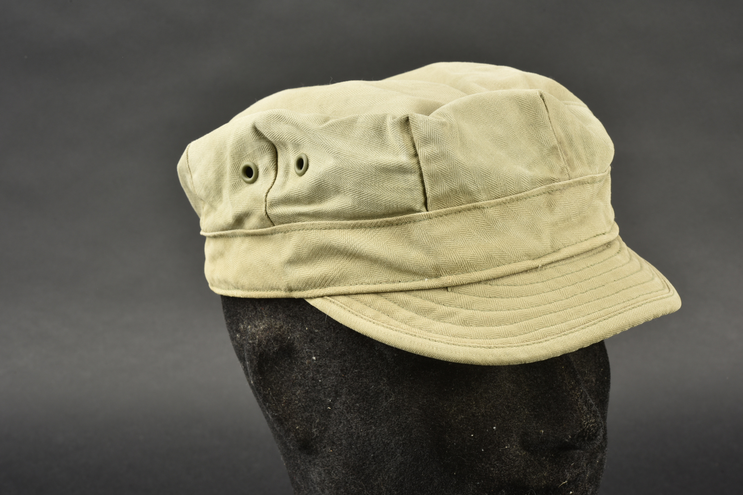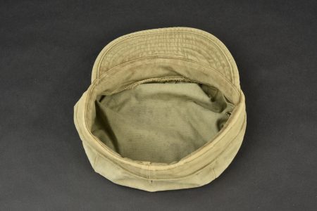 Casquette HBT. En tissu coton HBT, couleur OD3. Deux œillets d’aération sur chaque côté. Etiquette absente. Visière en très bon état. A noter une certaine usure et patine de la pièce, ainsi que des tâches. Etat II+.