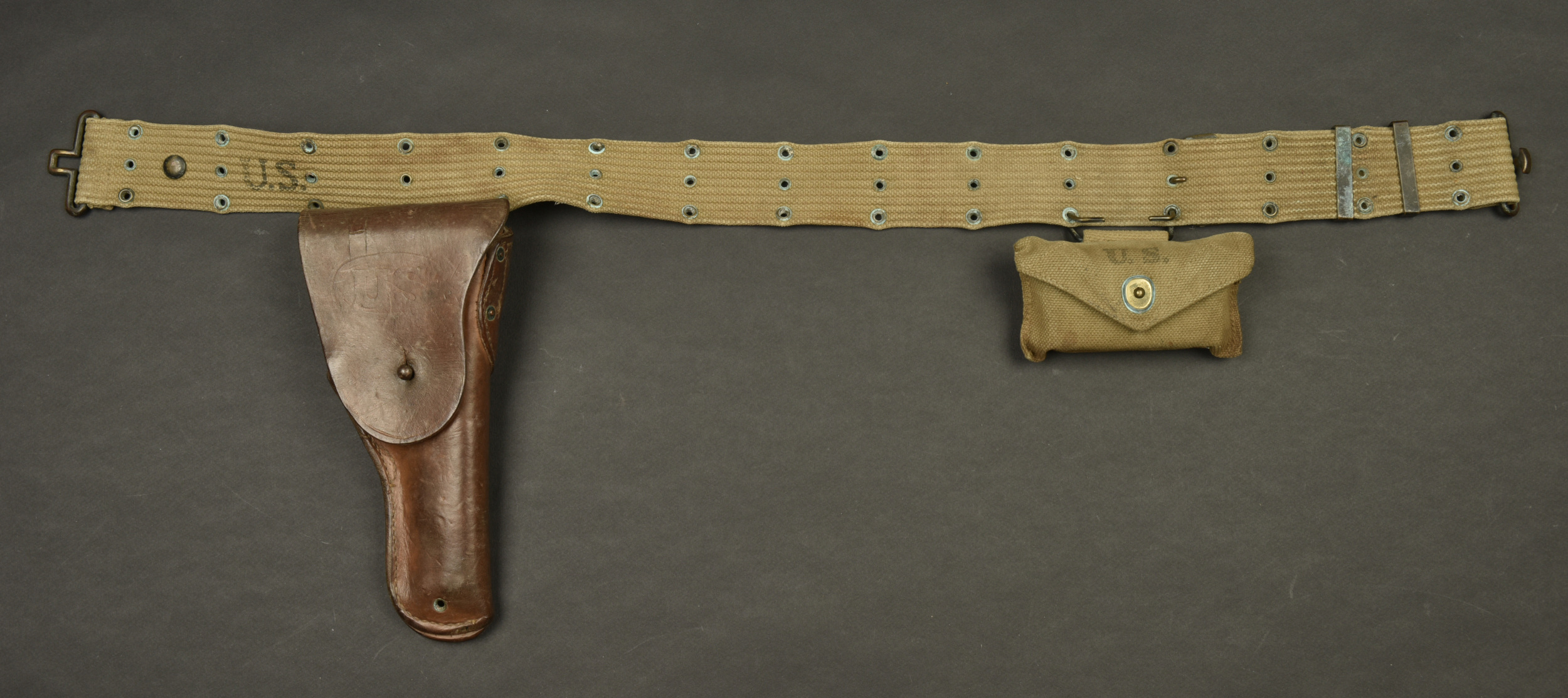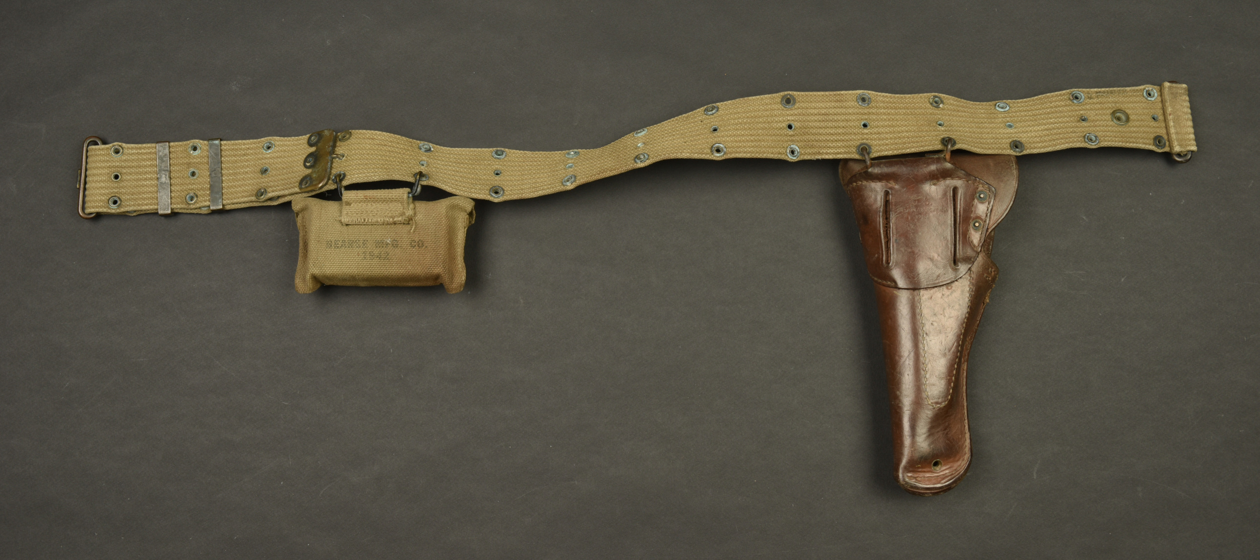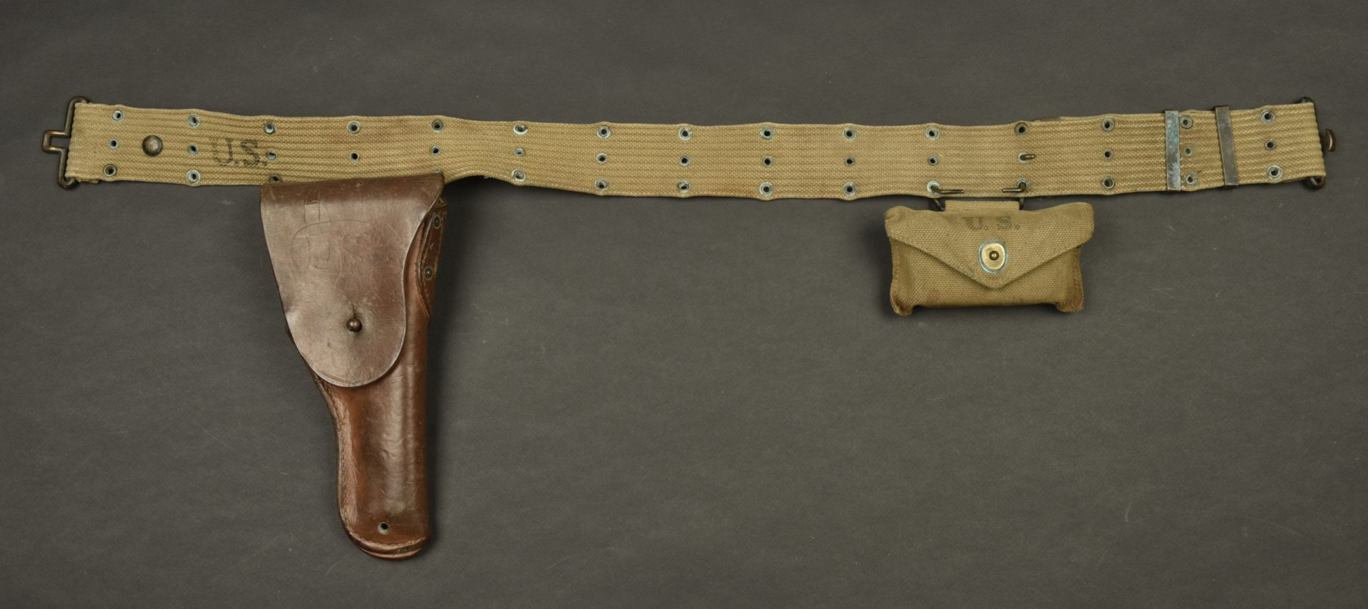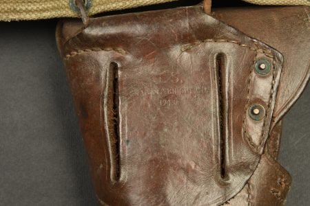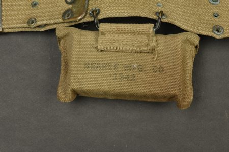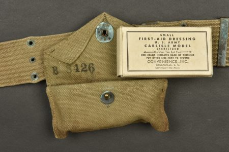 Ceinturon et accessoires US. Comprenant un ceinturon M-36 en forte toile OD. Bouclerie en laiton. Reste de marquages US visibles, les marquages fabricant sont illisibles. Une pochette pour pansement en forte toile OD, le bouton pression est fonctionnel. Le crochet de fixation au ceinturon est présent. Fabrication Bearse MFG CO 1942. Pansement dans sa boite en carton. Un holster de colt 45, en épais cuir marron. Le crochet de fixation au ceinturon est présent. Reste de marquage US visible sur la face avant. Fabrication US Knight 1943. A noter une certaine usure et patine des pièces, ainsi que des tâches. Etat II+.
