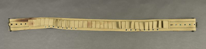 Ceinturon Shotgun US. En épaisse toile OD3. Bouclerie en laiton. Nombreux passant pour la fixation des cartouches du fusil à pompe U. Sans marquages visibles. Les parties métalliques sont oxydées. A noter une certaine usure et patine de la pièce. Etat II+.