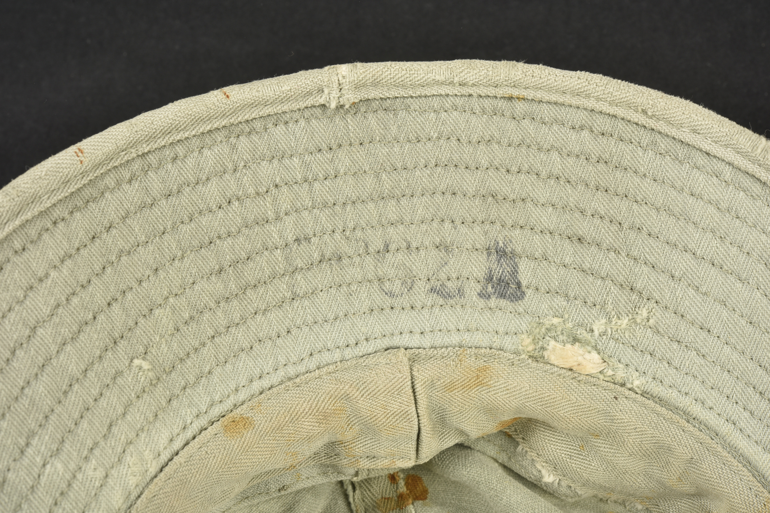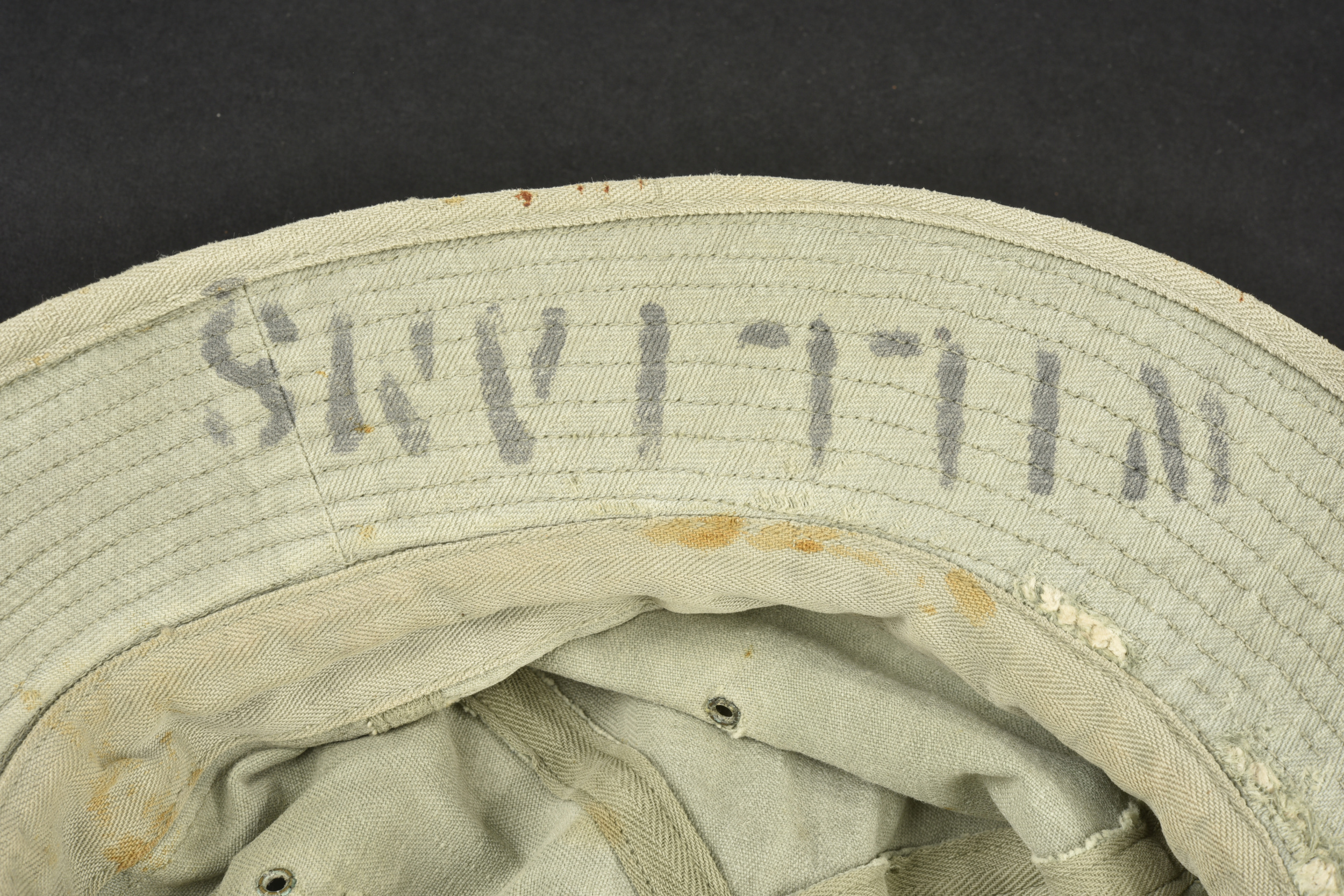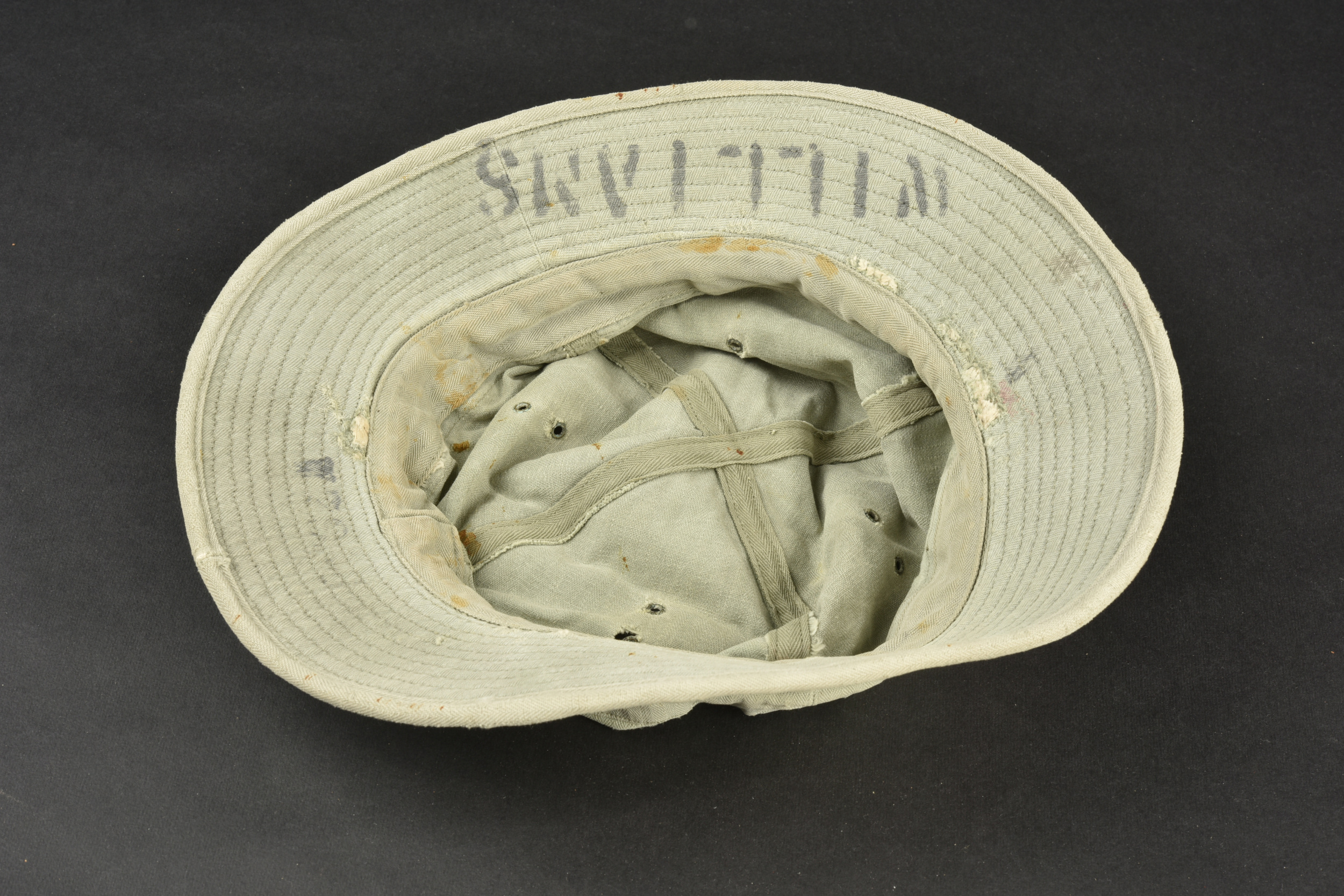 Chapeau HBT. En tissu HBT. Fortement décoloré par le soleil. Nombreuses marques d’usures. Quatre œillets d’aération. Etiquette manquante. Indication nominative réalisée au pochoir, Williams. Laundry numbers partiellement illisible. Couleur fortement décolorée par le soleil. A noter une certaine usure et patine de la pièce, ainsi que des tâches et accrocs. Etat II+.