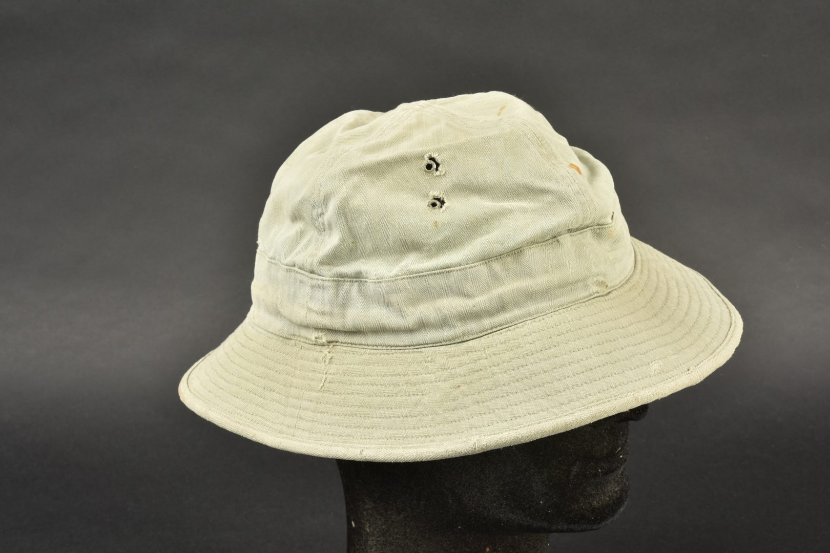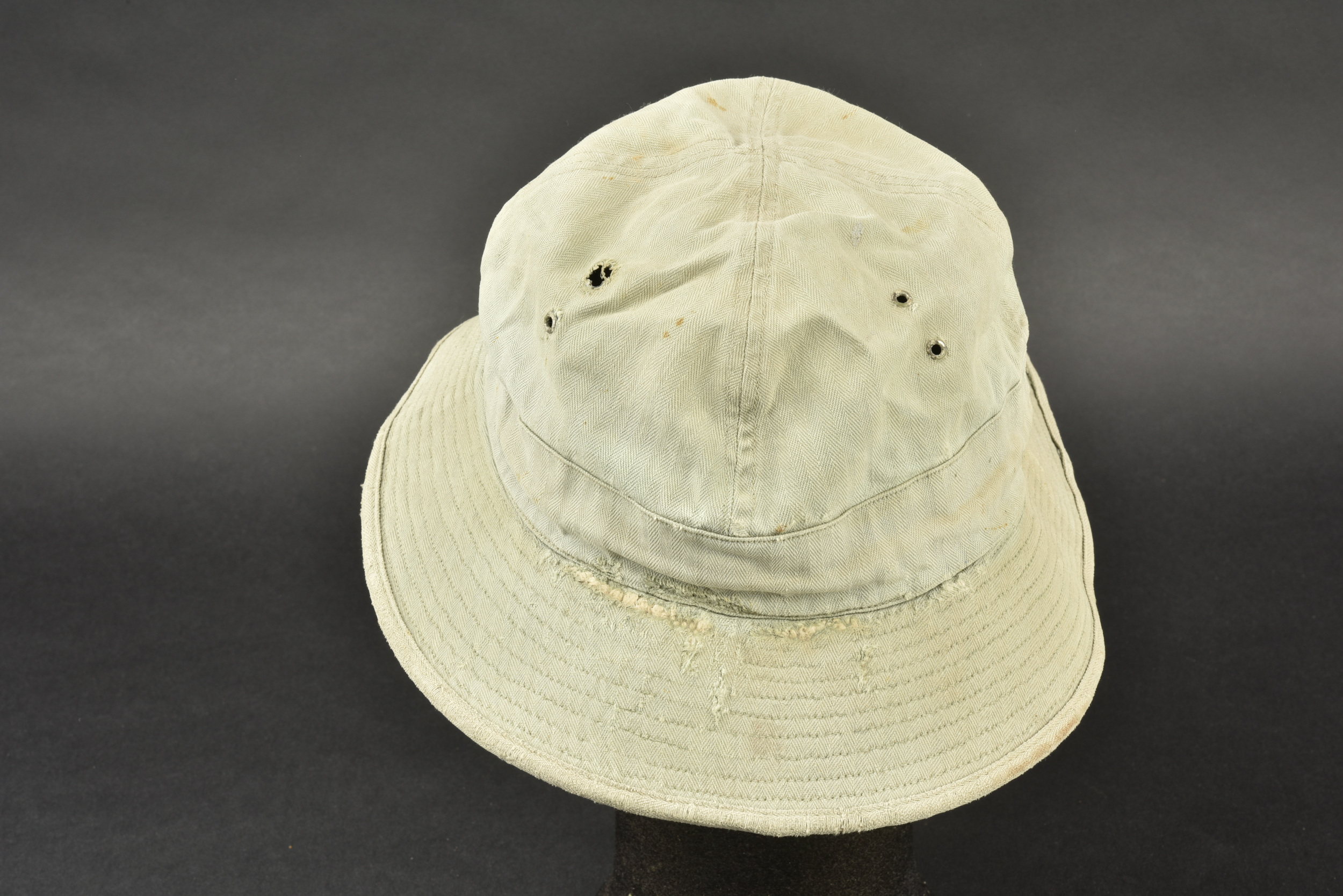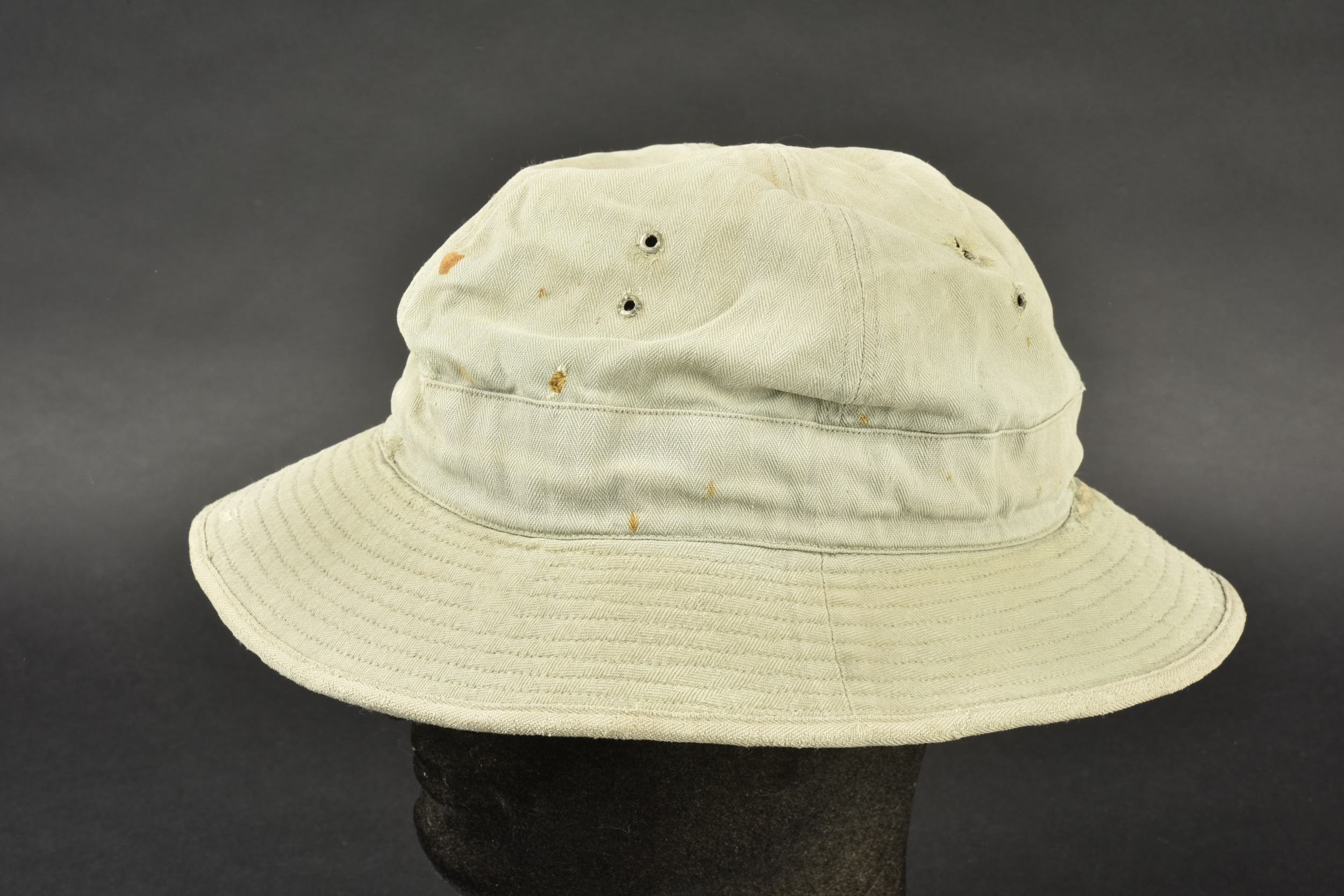 Chapeau HBT. En tissu HBT. Fortement décoloré par le soleil. Nombreuses marques d’usures. Quatre œillets d’aération. Etiquette manquante. Indication nominative réalisée au pochoir, Williams. Laundry numbers partiellement illisible. Couleur fortement décolorée par le soleil. A noter une certaine usure et patine de la pièce, ainsi que des tâches et accrocs. Etat II+.