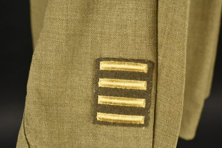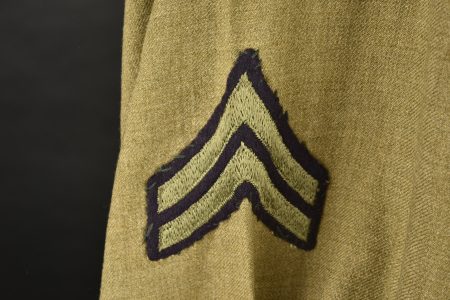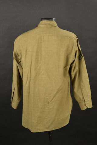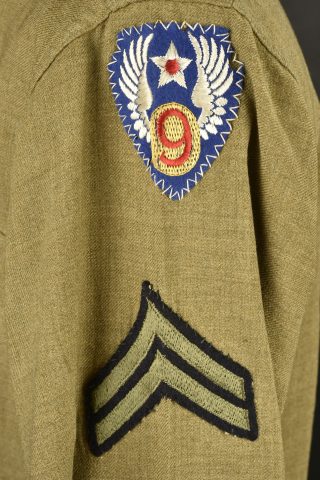 Chemise moutarde de la 9ème Airforce. En tissu moutarde. Tous les boutons sont présents. Modèle sans bavette anti-gaz. Etiquette fabricant manquante. Insigne de la 9ème Air Force cousu main au niveau de la manche gauche. Grades de manches de Corporal. A noter une légère usure et patine de la pièce, ainsi que quelques discrètes traces de mites. Etat II+.