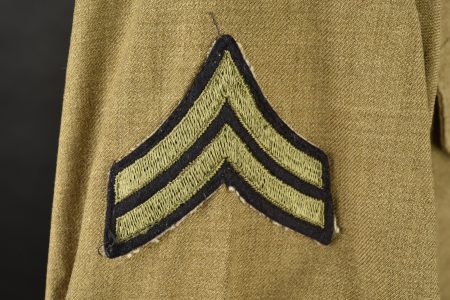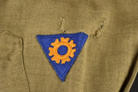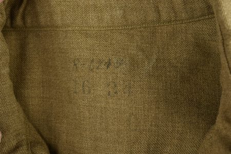 Chemise USAAF. En flanelle couleur moutarde. La majorité des boutons sont présents. Grades de manches de caporal cousus main. Insigne de l’USAAF, cousu machine. Taille 16-35, reste des marquages dans le col illisibles. Insigne de spécialité Engineer cousu machine au bas de la manche droite. Etiquette fabricant absente. A noter une certaine usure et patine de la pièce, ainsi que quelques accrocs. Etat II+.