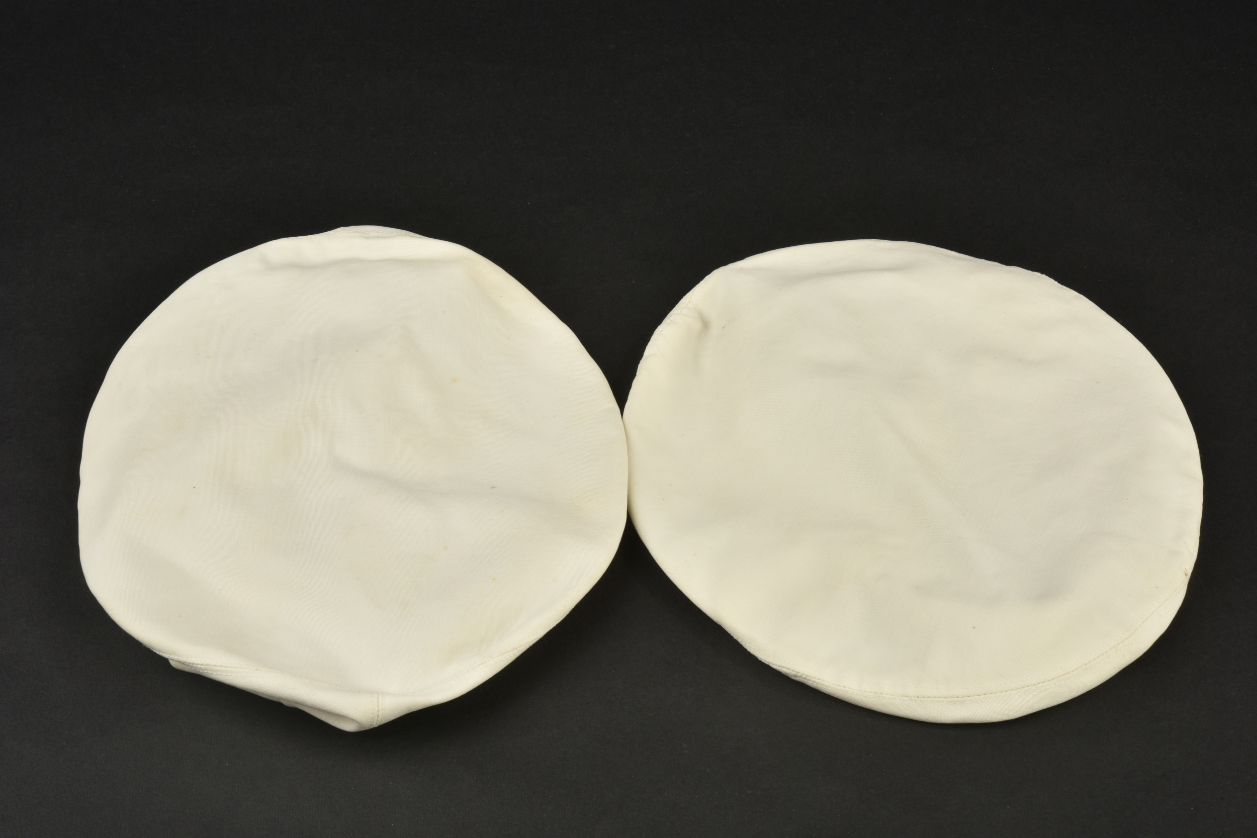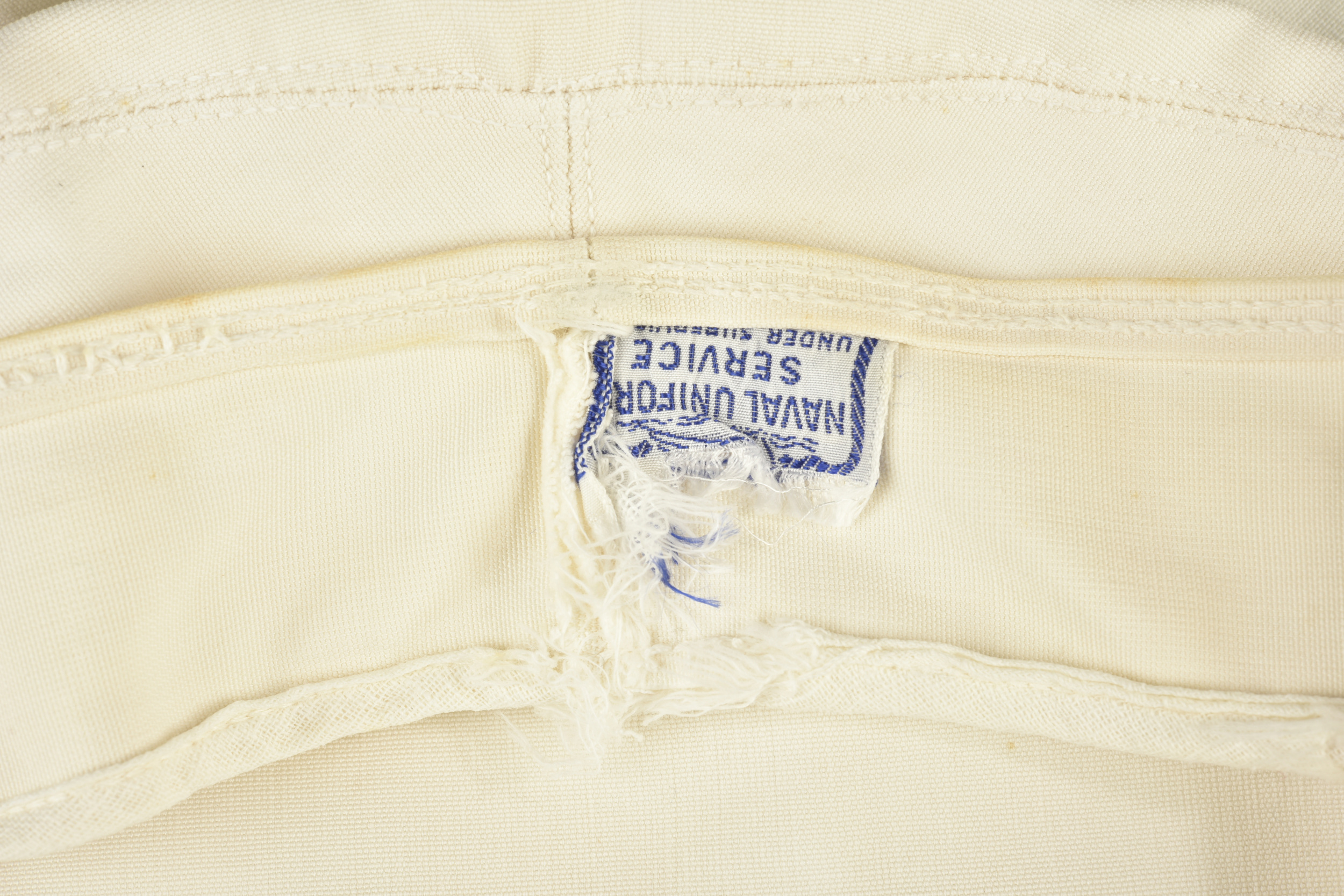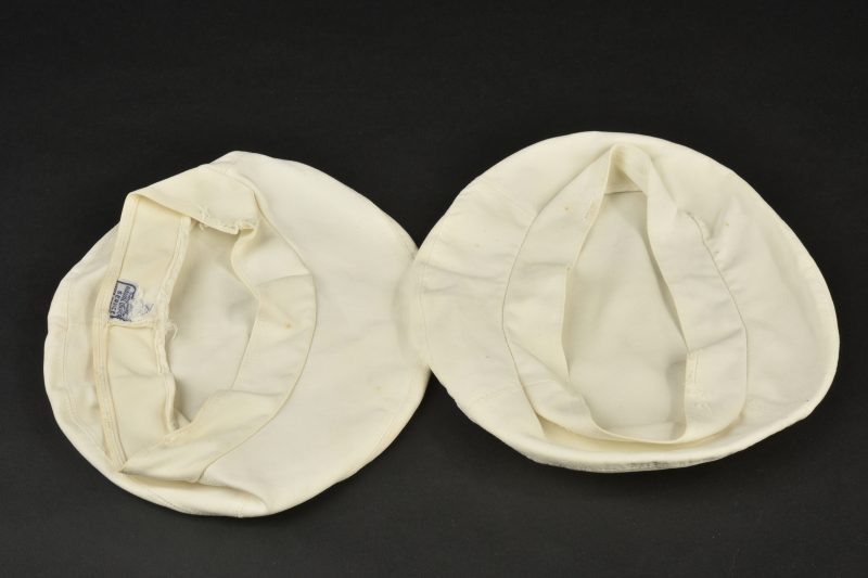 Coiffes blanches pour casquette de l’US Navy. Deux modèles, marqués Naval Uniform Service Under Supervision US Navy et EMB. Tissu légèrement imperméabilisé. A noter une certaine usure et patine des pièces, ainsi que quelques tâches. Etat II+.