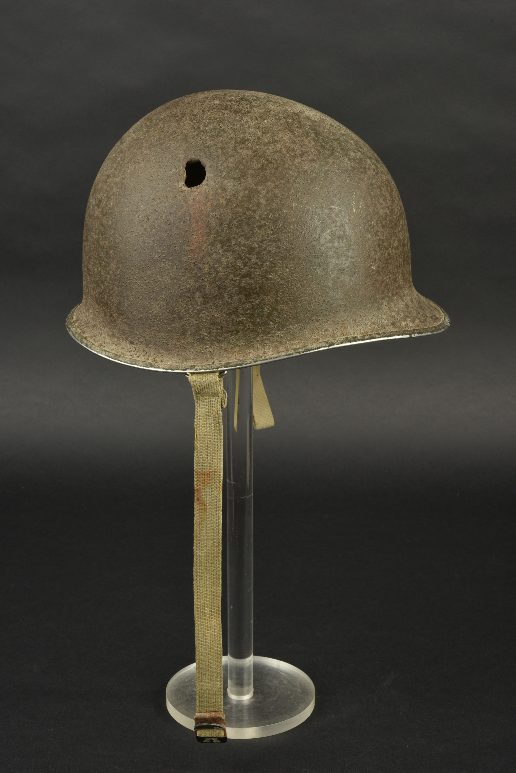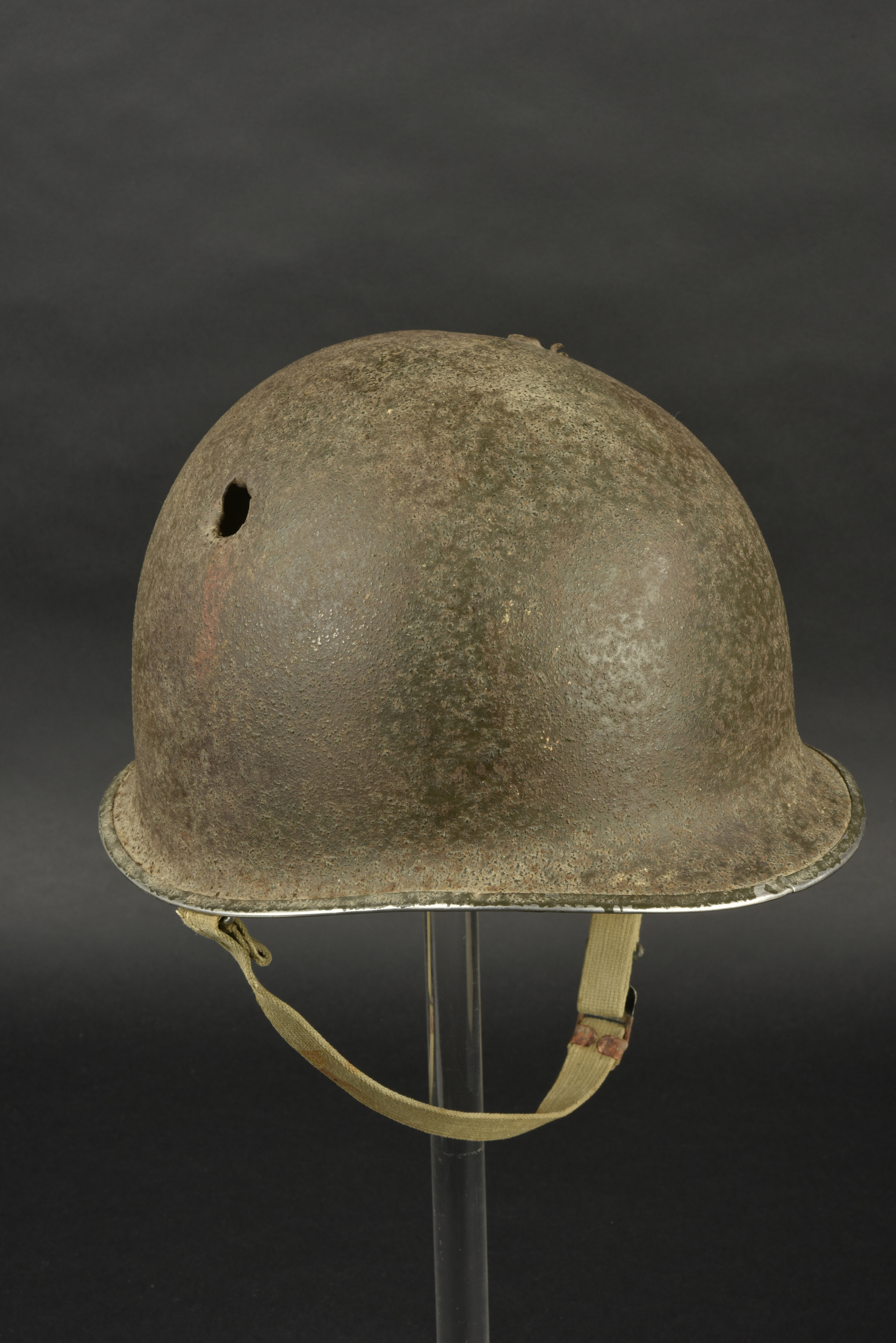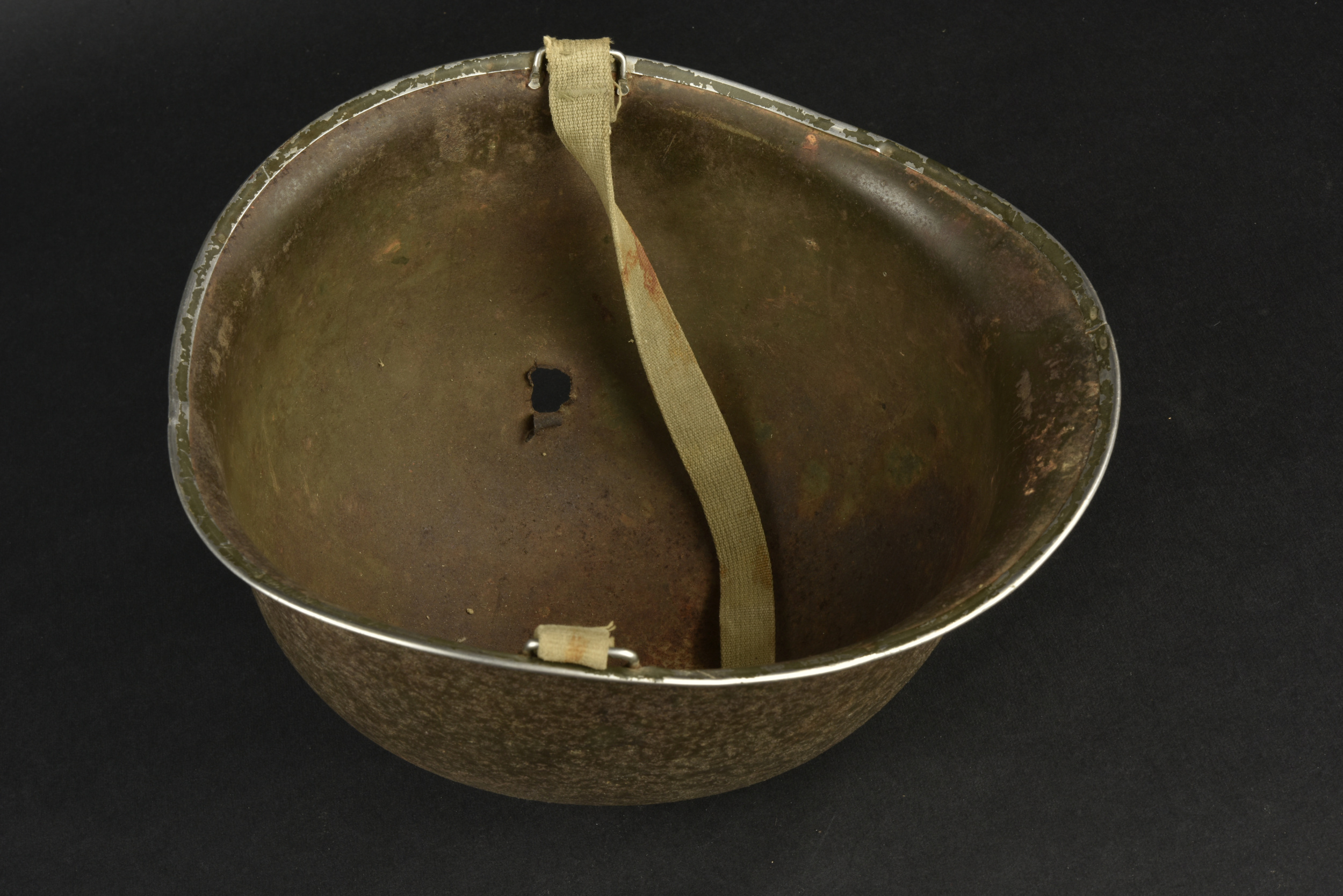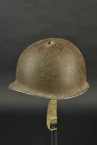 Coque de casque US à impact. Coque de casque USM1. Fermeture du jonc à l’avant. Numéro de lot 779A, correspondant à une fabrication de janvier 1944. Pontets fixes, les jugulaires sont montées d’origine et complètes. Impact pénétrant côté droit et sortant au niveau de la partie supérieure gauche. Intérieure de la coque présentant une certaine oxydation. Peinture et cork présents à 60%. A noter une certaine usure et patine de la pièce. Etat II+.