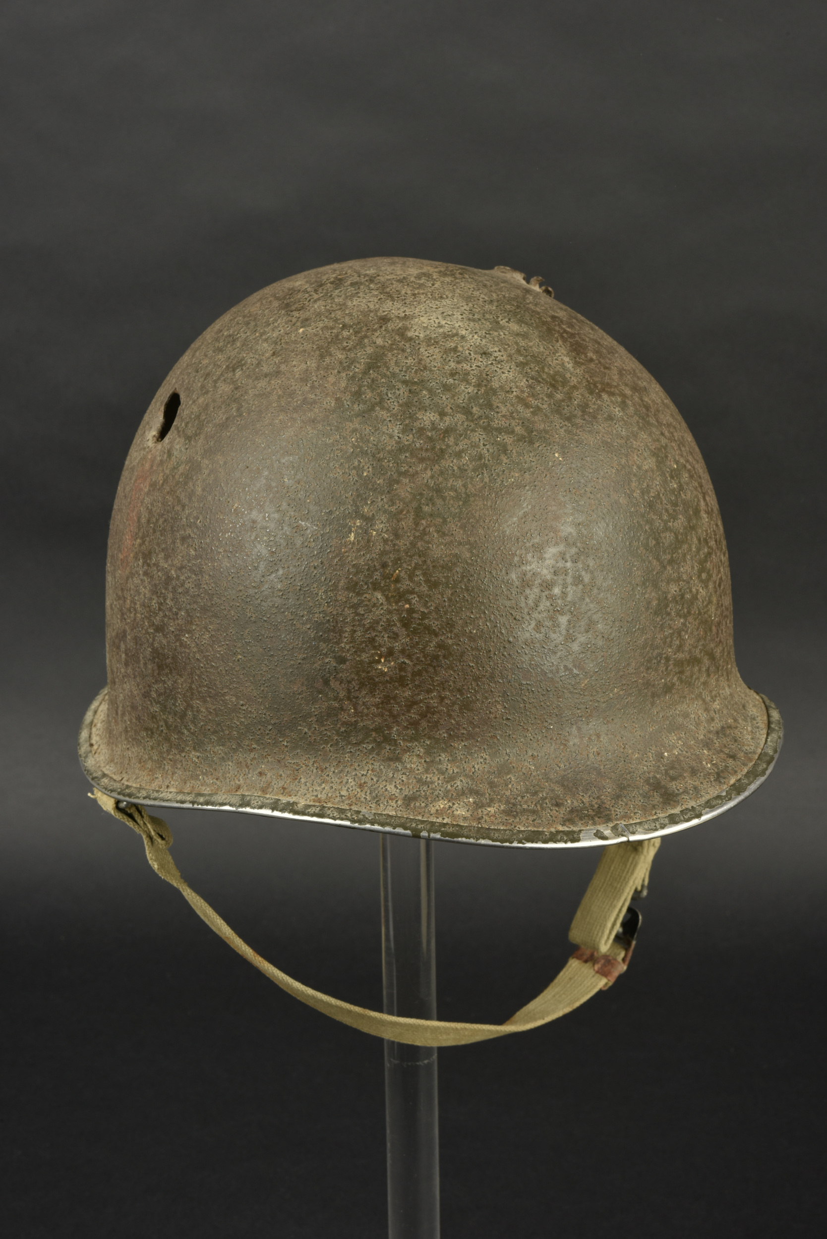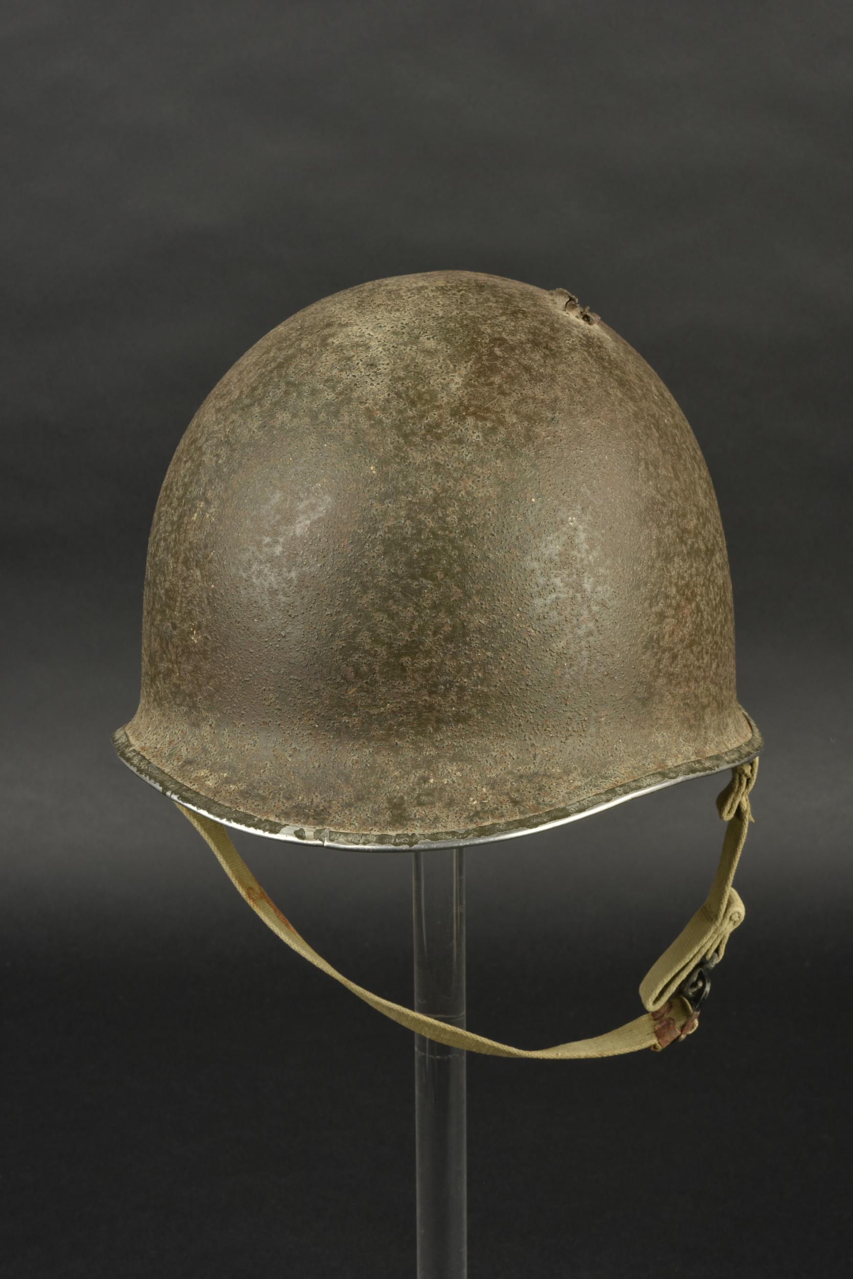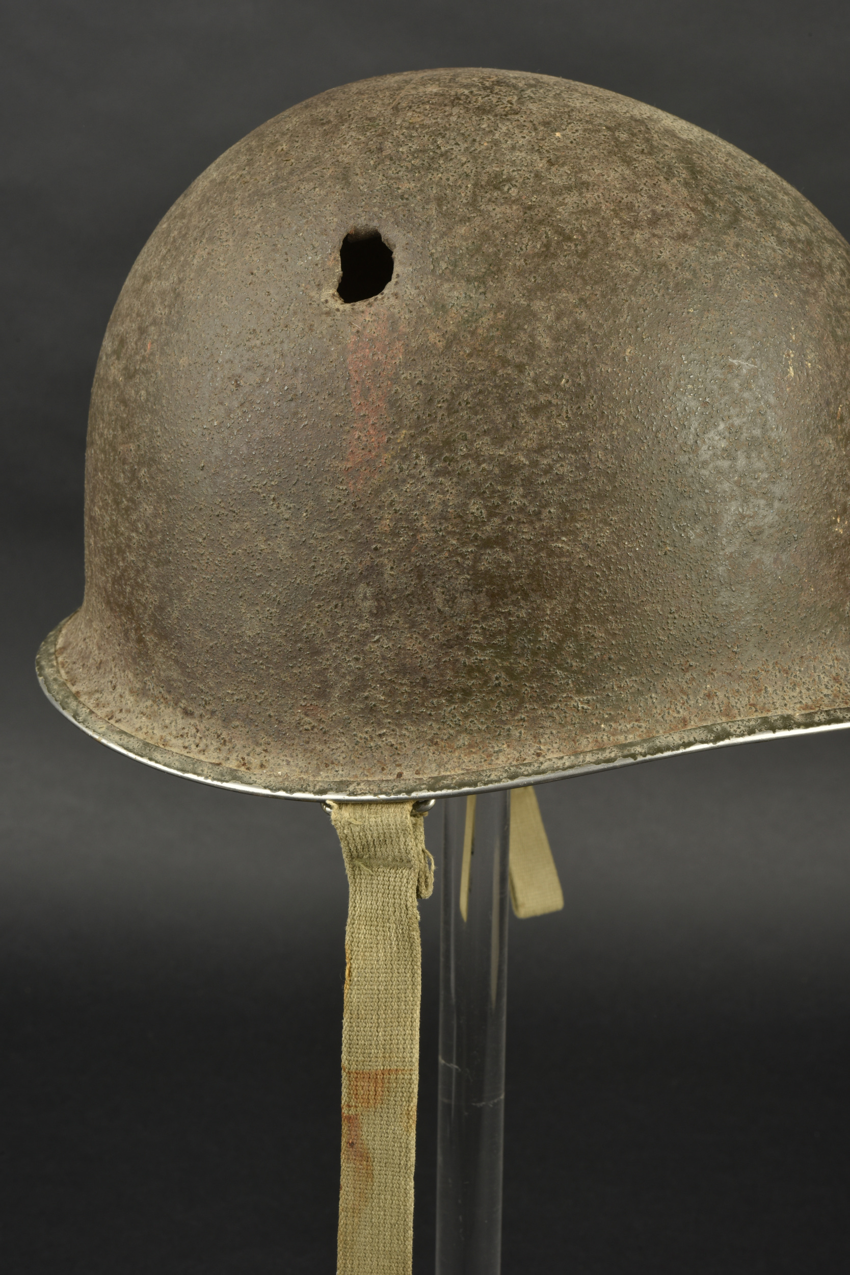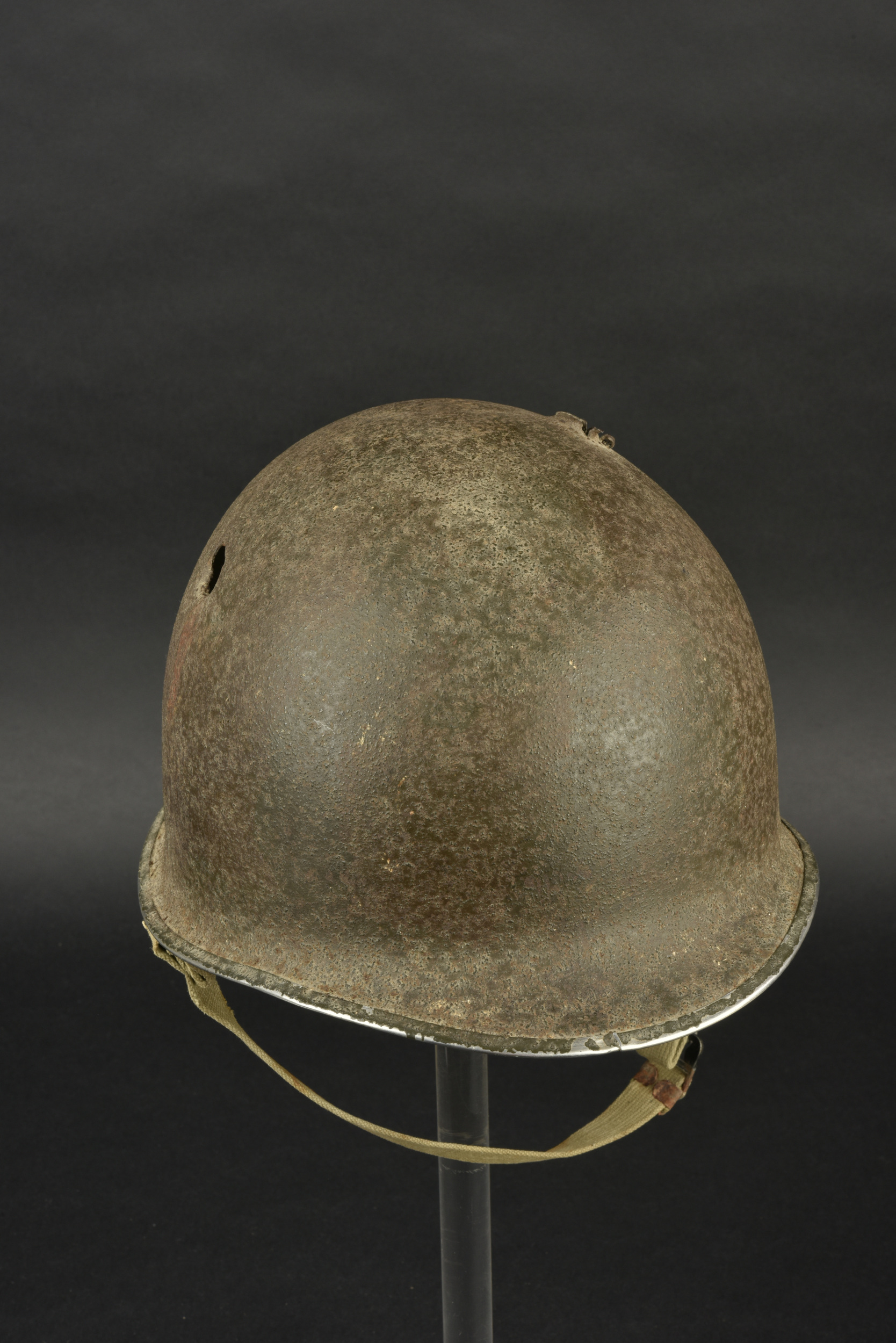 Coque de casque US à impact. Coque de casque USM1. Fermeture du jonc à l’avant. Numéro de lot 779A, correspondant à une fabrication de janvier 1944. Pontets fixes, les jugulaires sont montées d’origine et complètes. Impact pénétrant côté droit et sortant au niveau de la partie supérieure gauche. Intérieure de la coque présentant une certaine oxydation. Peinture et cork présents à 60%. A noter une certaine usure et patine de la pièce. Etat II+.