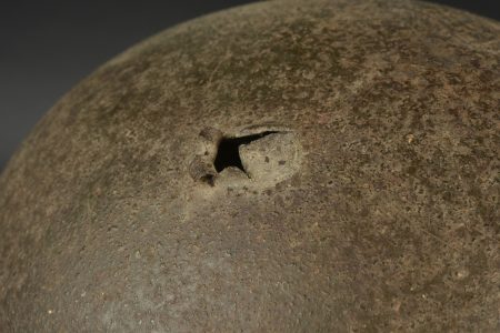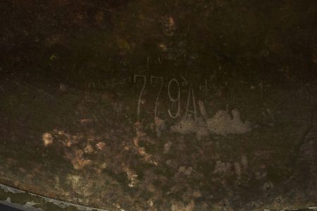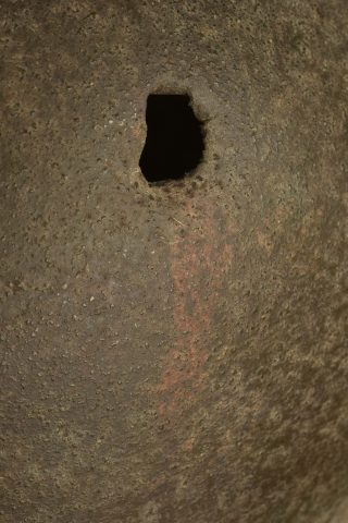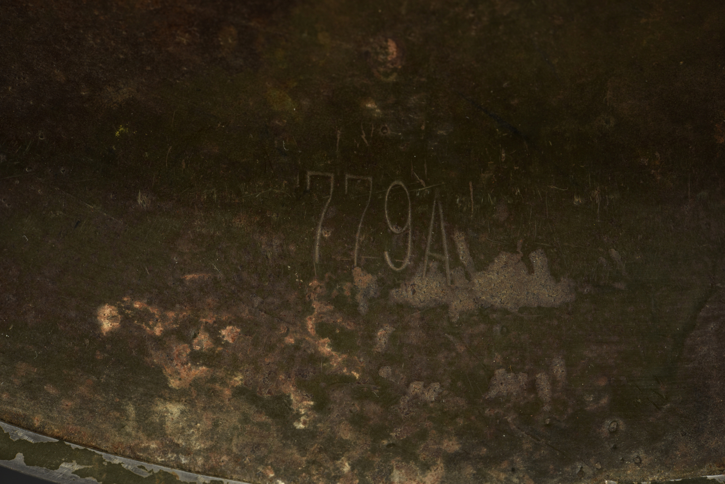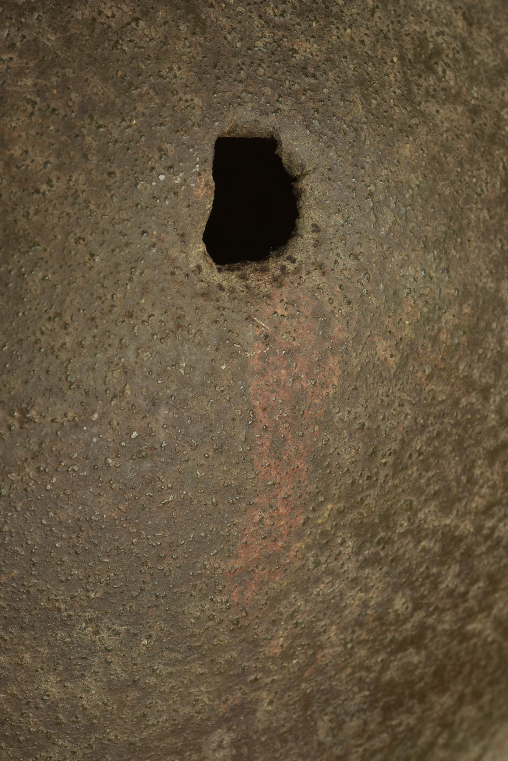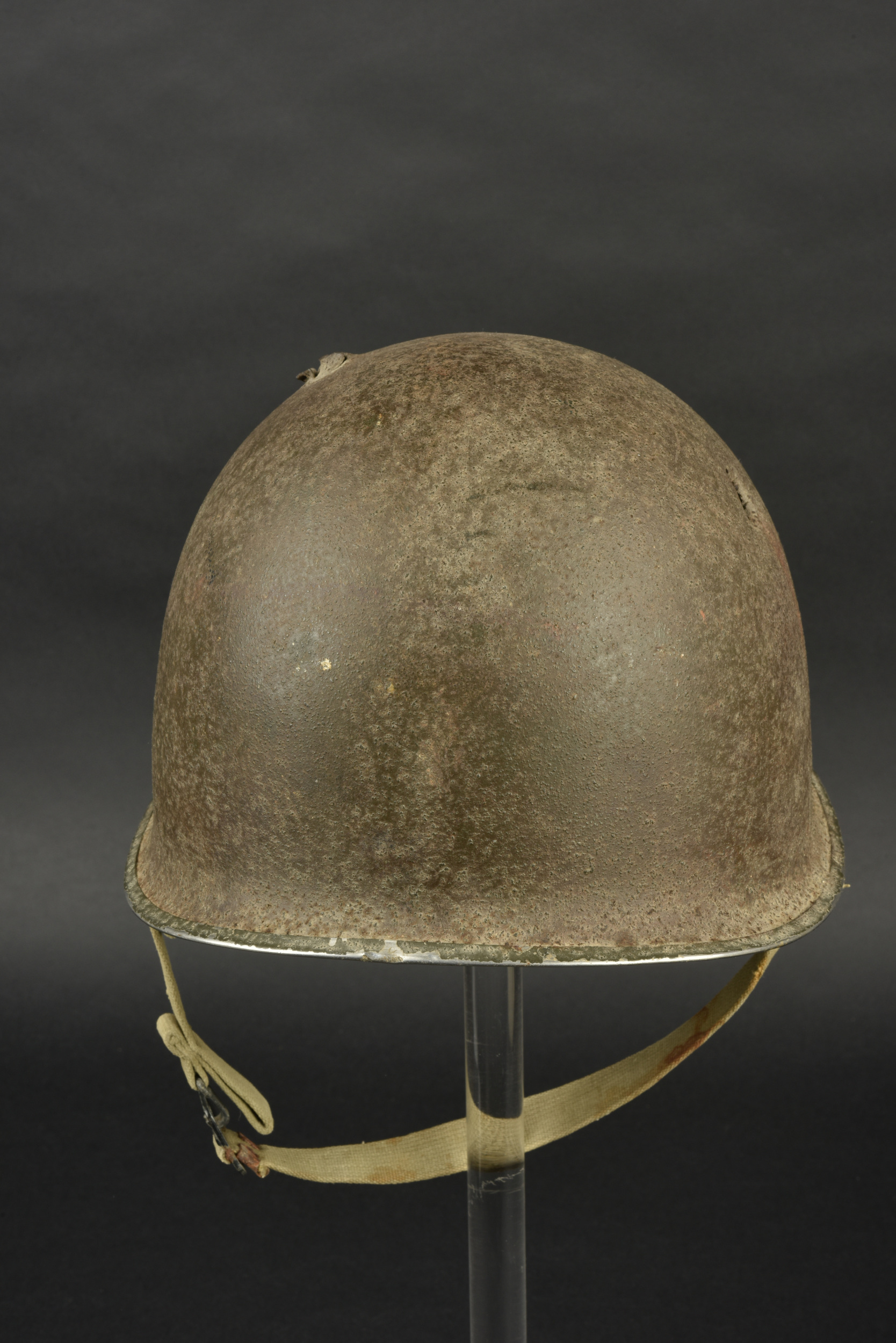 Coque de casque US à impact. Coque de casque USM1. Fermeture du jonc à l’avant. Numéro de lot 779A, correspondant à une fabrication de janvier 1944. Pontets fixes, les jugulaires sont montées d’origine et complètes. Impact pénétrant côté droit et sortant au niveau de la partie supérieure gauche. Intérieure de la coque présentant une certaine oxydation. Peinture et cork présents à 60%. A noter une certaine usure et patine de la pièce. Etat II+.
