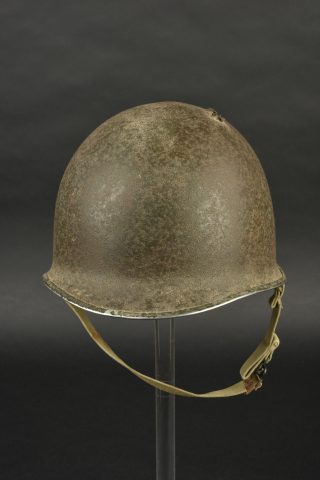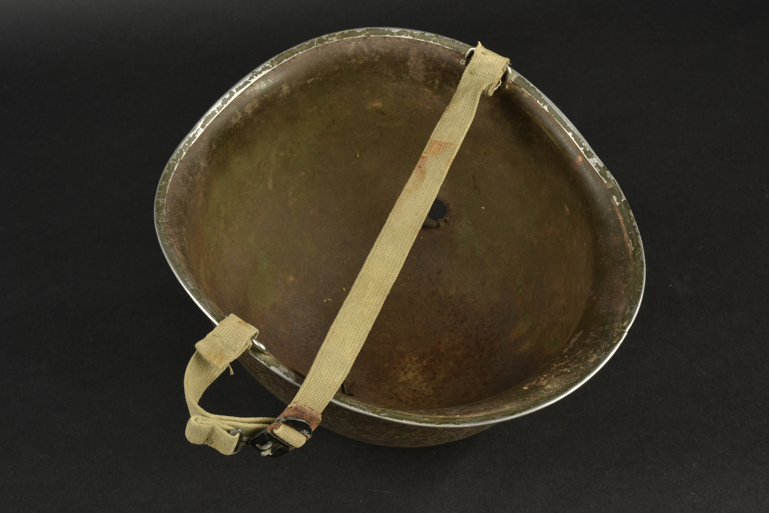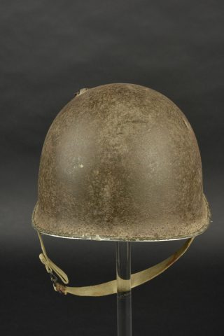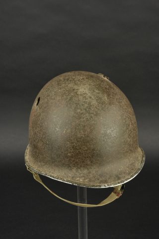 Coque de casque US à impact. Coque de casque USM1. Fermeture du jonc à l’avant. Numéro de lot 779A, correspondant à une fabrication de janvier 1944. Pontets fixes, les jugulaires sont... en savoir plus