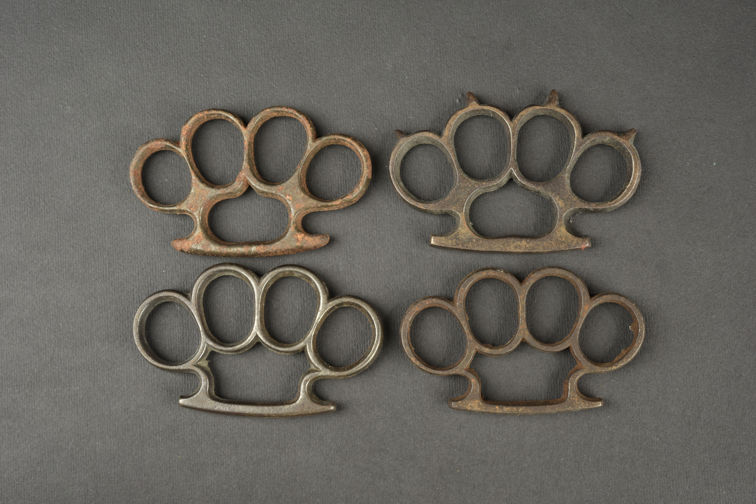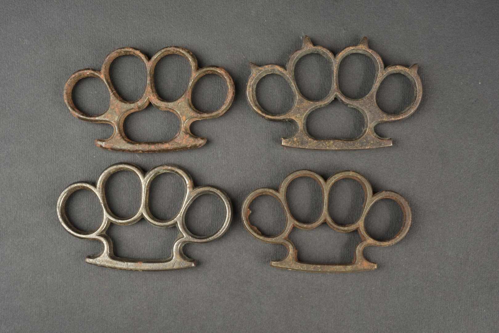Coups de poing US. Quatre modèles de coups de poing US, en métal, sans marquages visibles. A noter une certaine usure et patine des pièces. Etat II+.