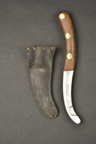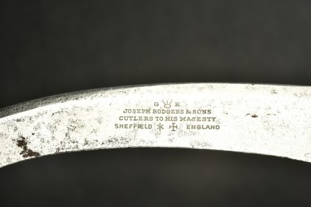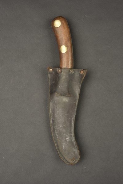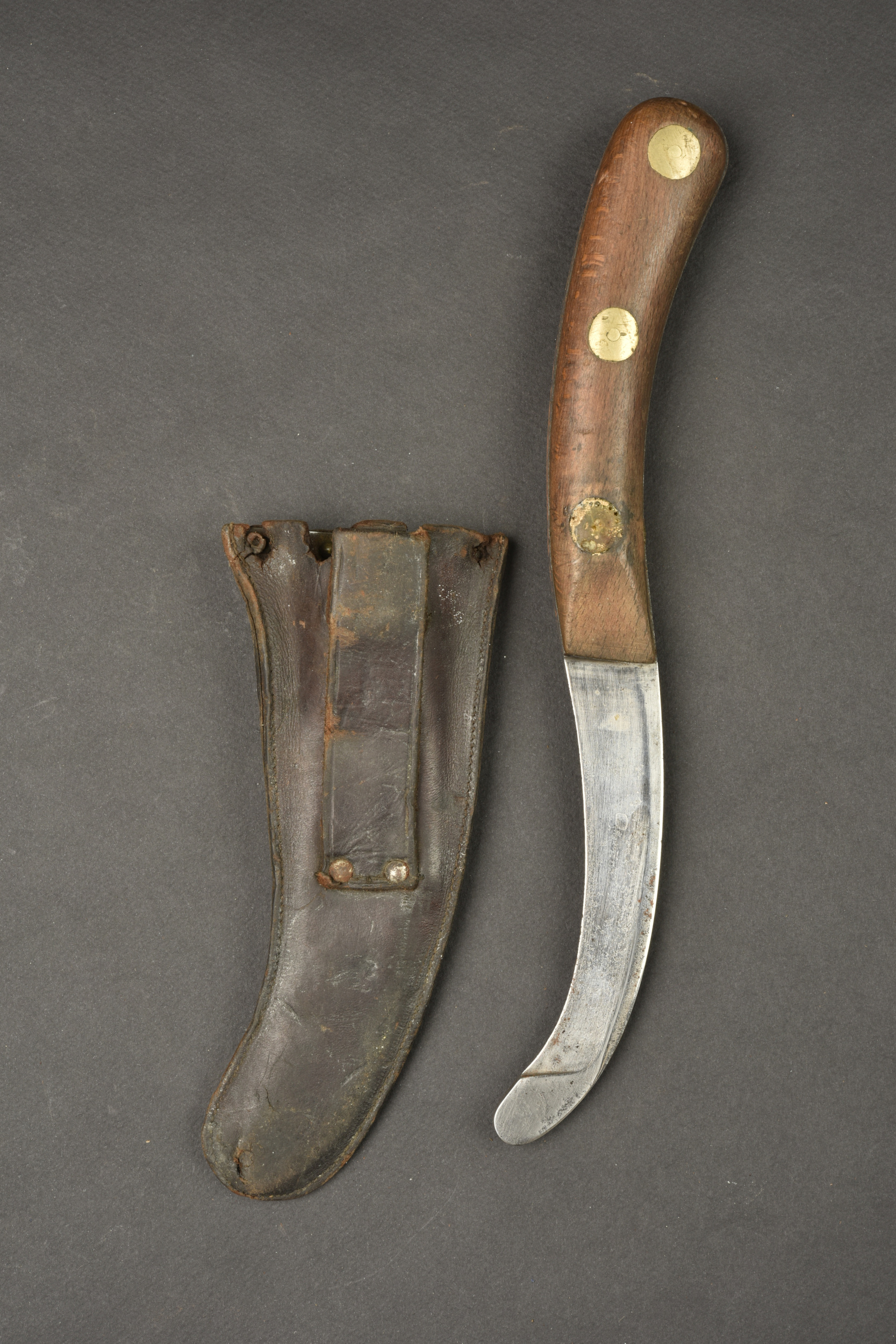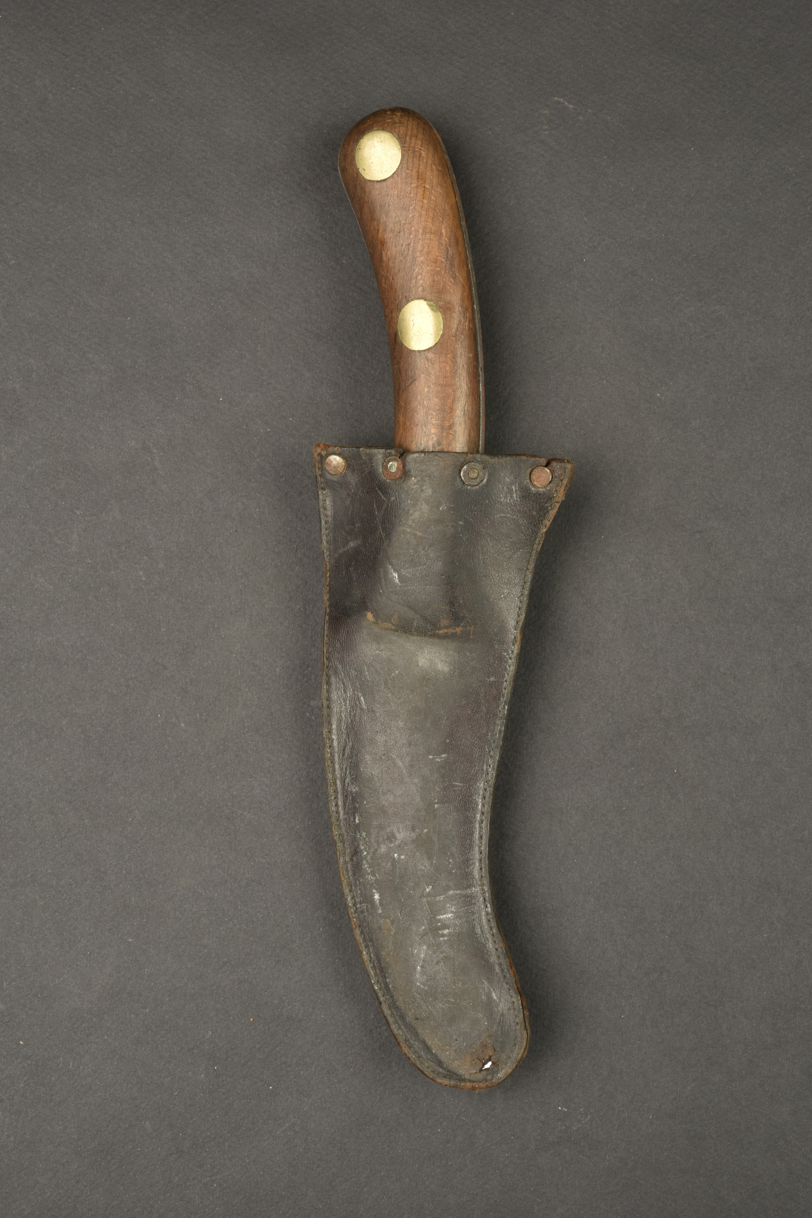 Couteau britannique. Garnitures en métal, lame incurvée en très bel état. Plaquettes en bois, maintenues par trois rivets. Marquages Joseph Rodgers Sons Sheffield. Fourreau en cuir noir, très abîmé. A noter une certaine usure et patine des pièces. Etat II+.