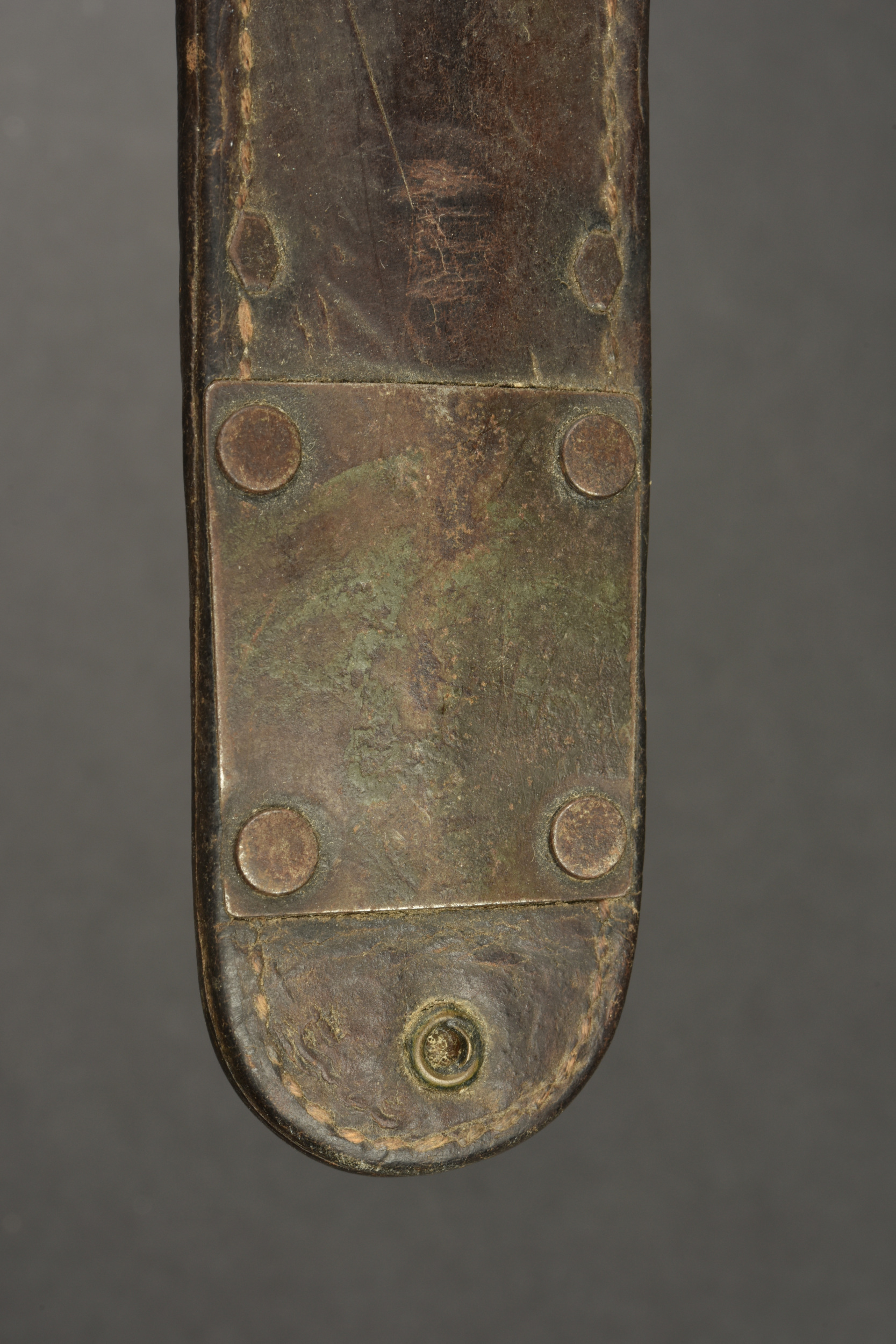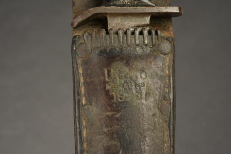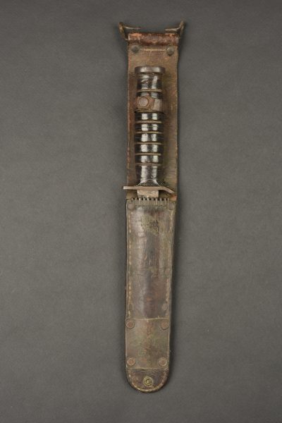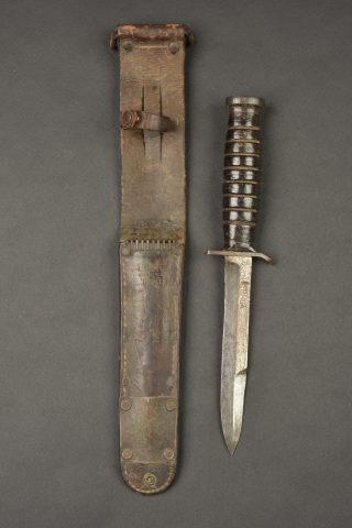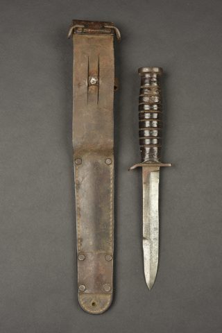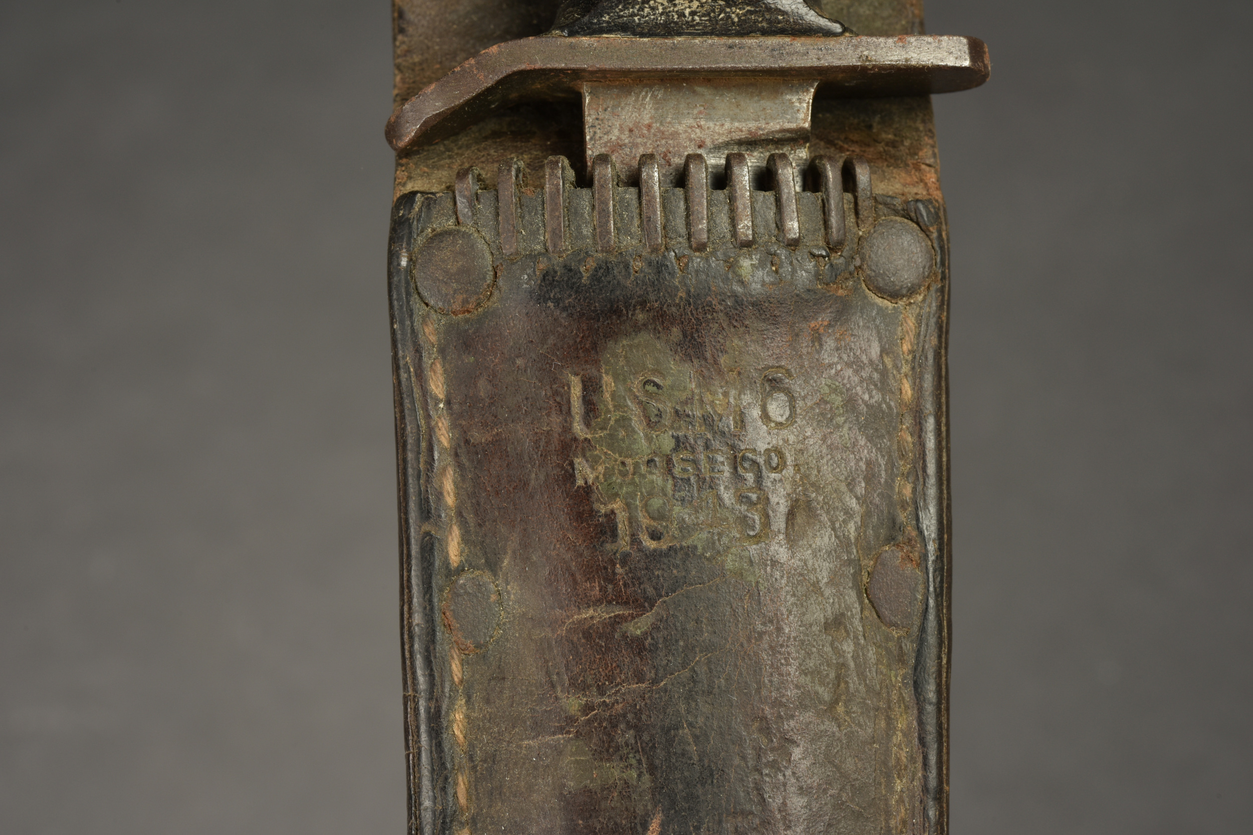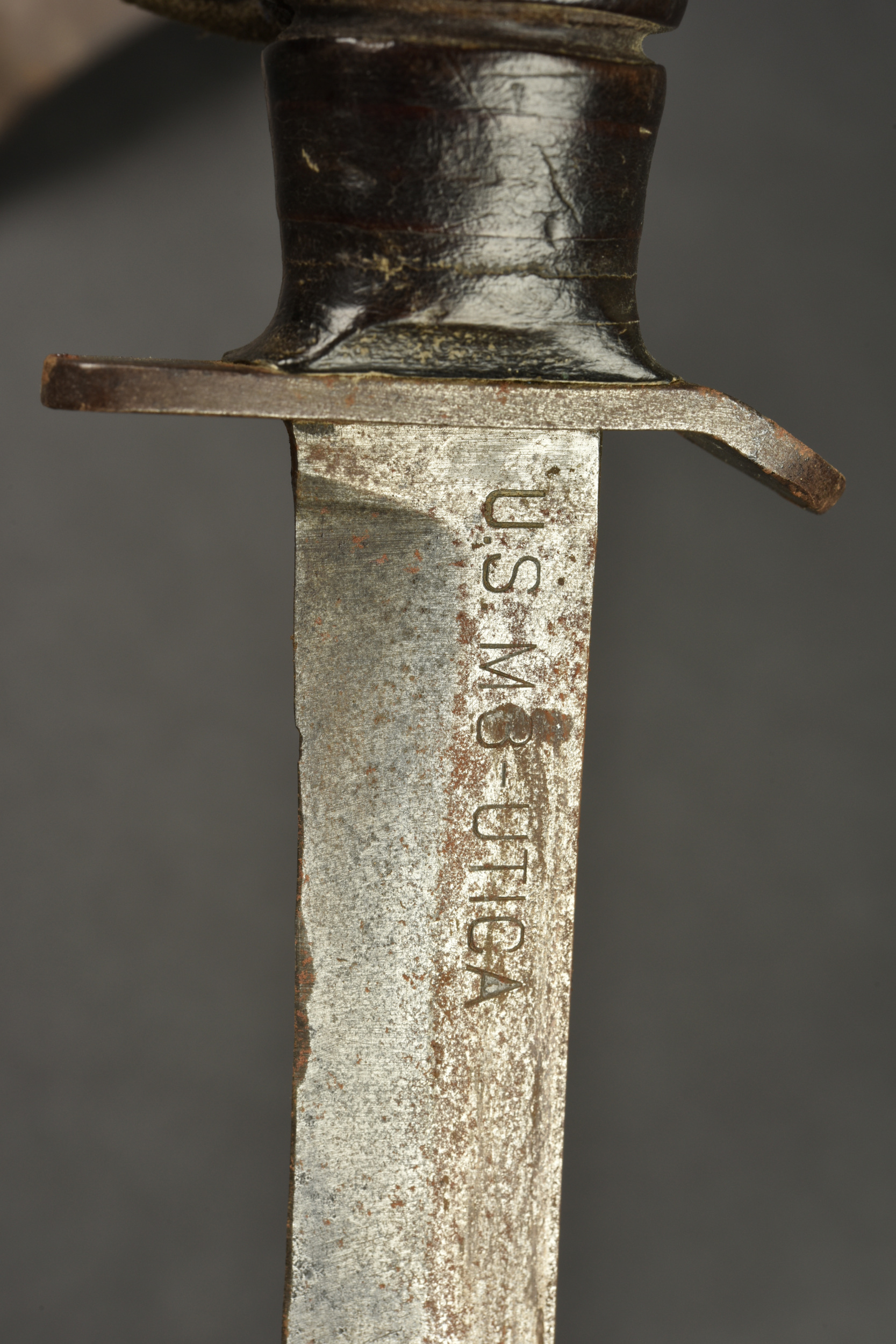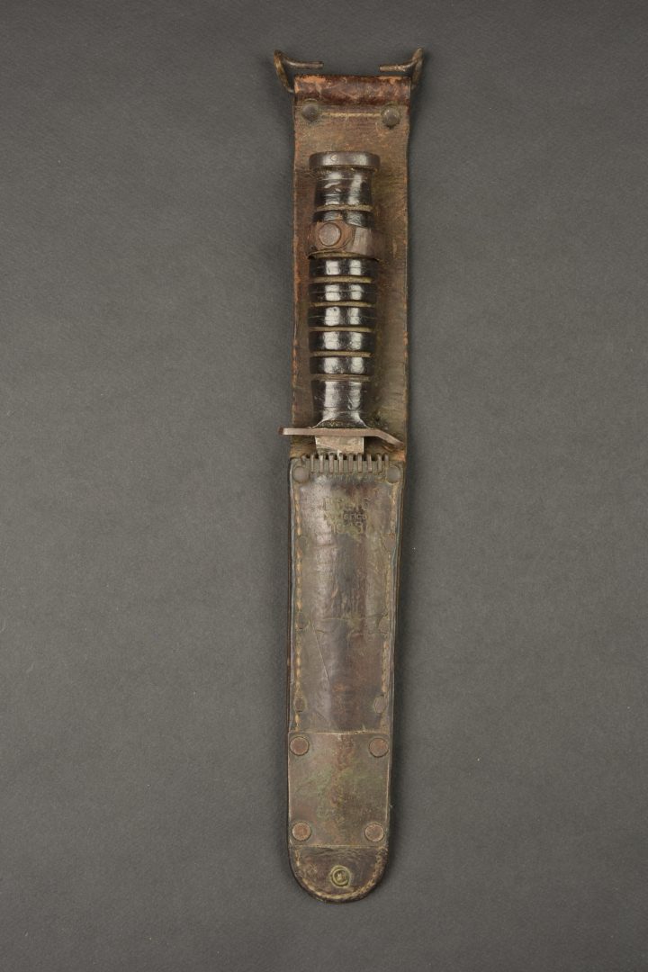 Couteau de combat USM3 Utica avec fourreau M6. Poignard USM3, marqué UTICA sur lame, lame ayant été aiguisée, usure, rouille superficielle. Poignée en rondelles de cuir. Dans son fourreau M6 du fabricant Moose daté 1943. En cuir marron, crochet de fixation au ceinturon présent ainsi que la sangle de maintien du couteau, bouton pression fonctionnel. Dix agrafes à l’entrée du fourreau. Plaque de métal, maintenue par quatre rivets. Usure et patine