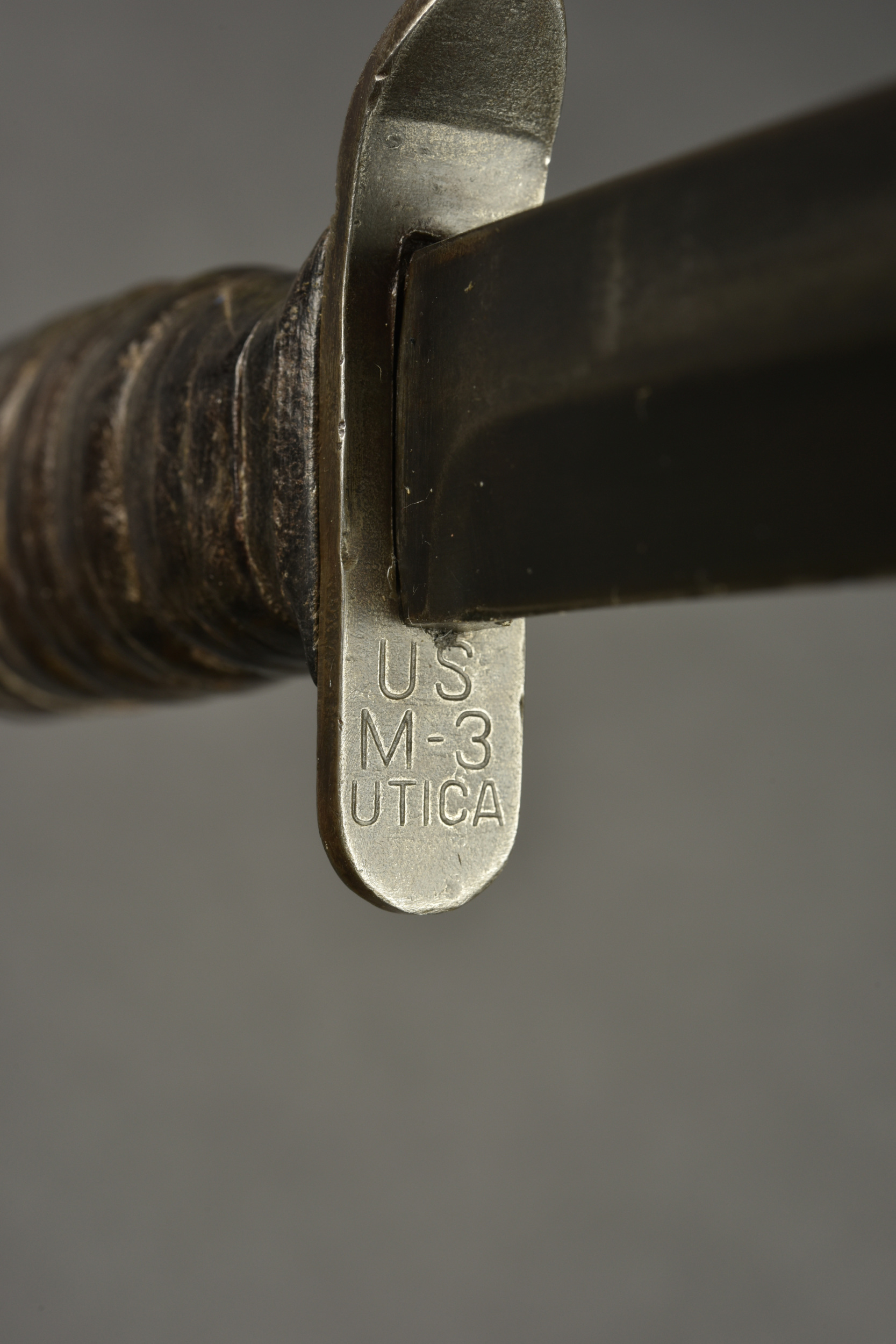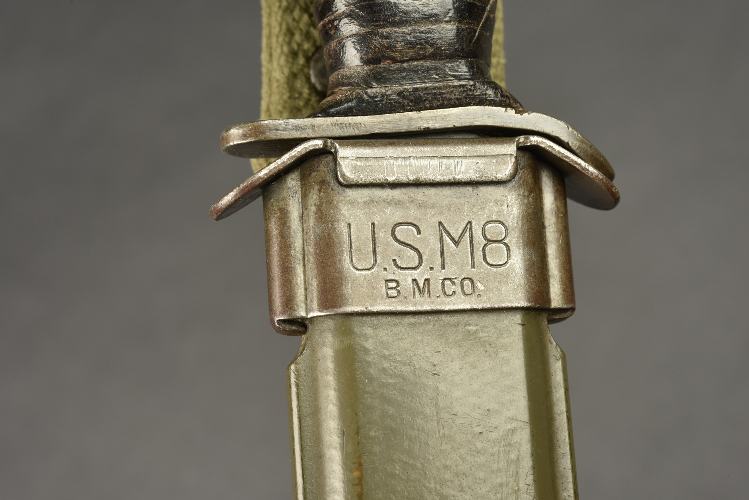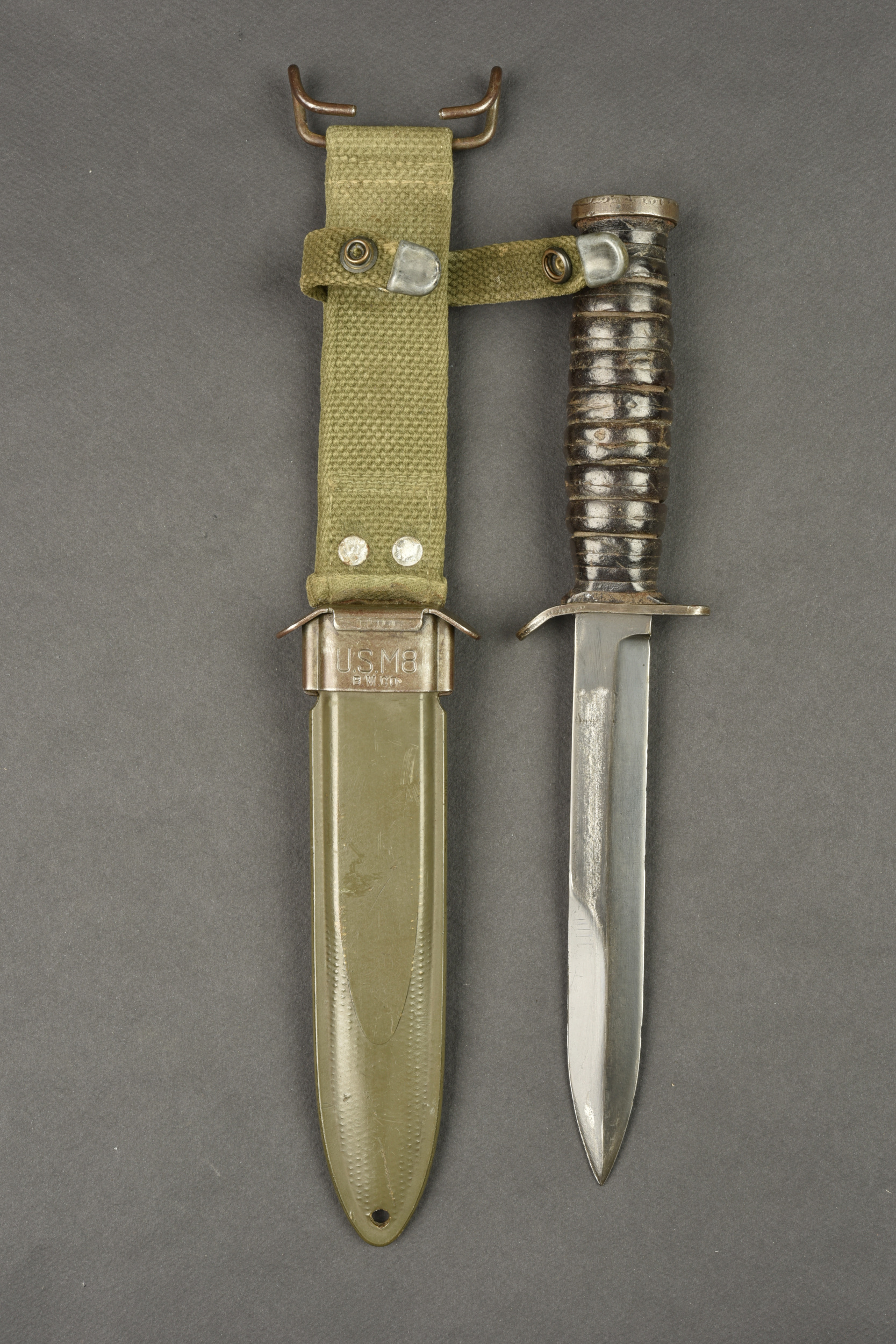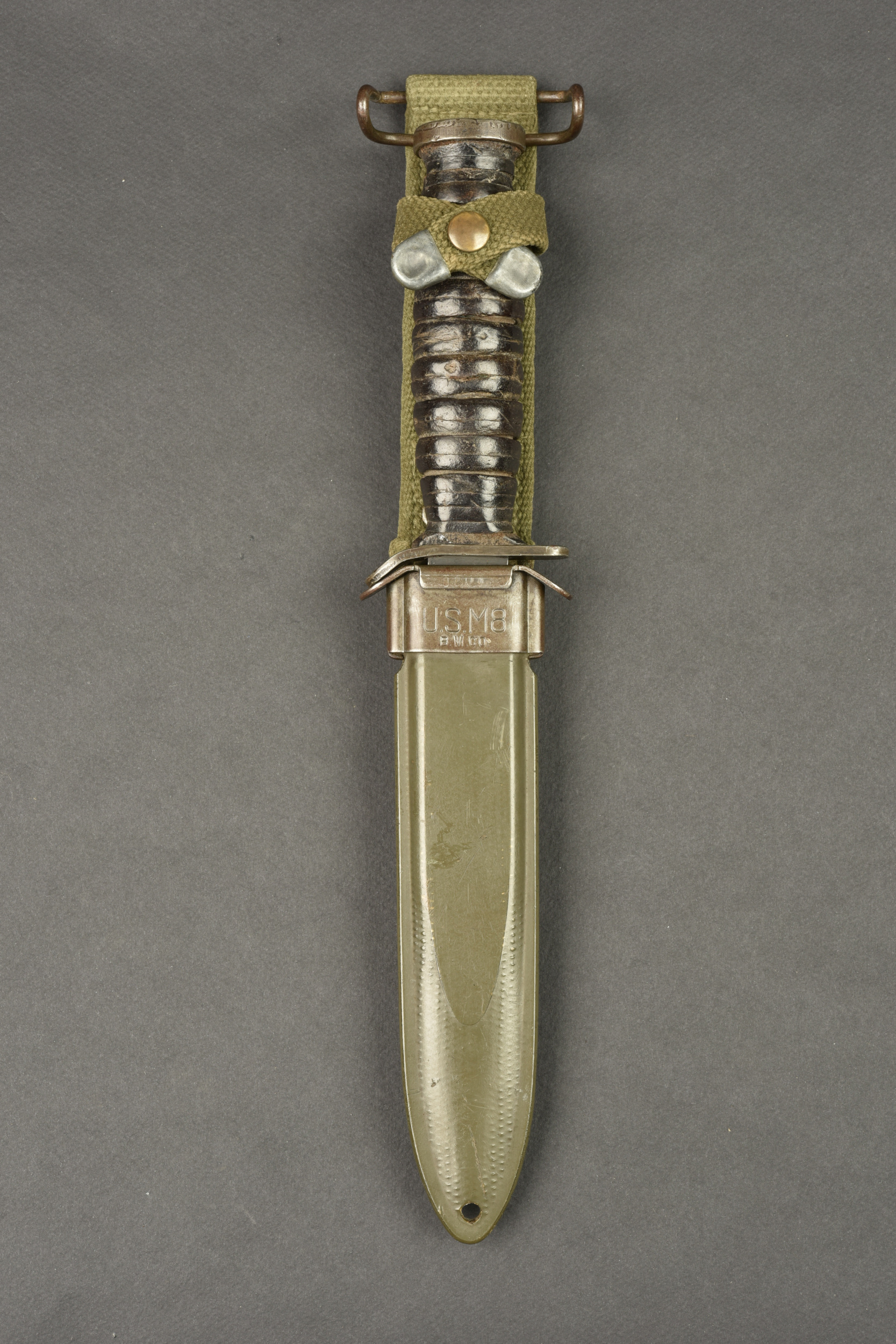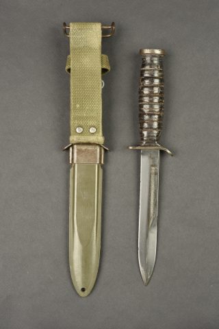 Couteau USM3. Pommeau en métal disposant d’une belle grenade de l’Ordonance Corps US. Poignée composée d’anneaux en cuir. Belle lame dans sa couleur d’origine à 90%. Fabrication USM3 Utica au niveau de la garde. Fourreau USM8 BMCO, dans sa couleur d’origine à 90%. Modèle avec attache pour le ceinturon. Le bouton pression est fonctionnel. A noter une certaine usure et patine de la pièce. Etat II+.