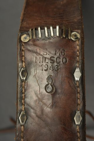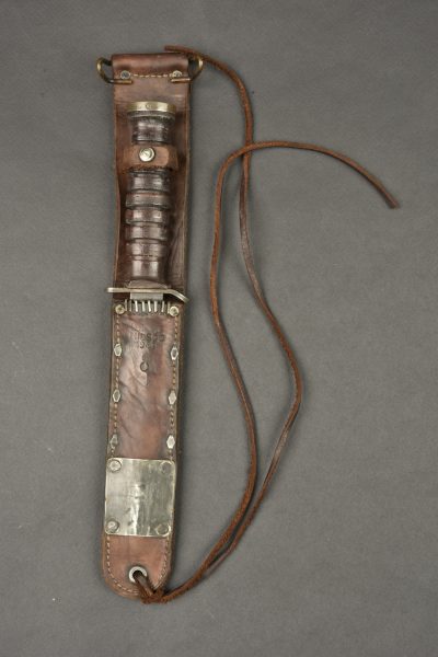 Couteau USM3, fourreau USM6. Pommeau disposant d’un seul rivet de maintien, il s’agit donc d’une reproduction. Belle grenade de l’Ordnance Corps US visible. Poignée composée d’anneaux en cuir. Belle lame dans sa couleur d’origine à 90%. Fabrication US M3 Camillus. Fourreau USM6 en cuir, huit agrafes d’entrée au fourreau. Fabrication US M6 Milsco 1943. Le crochet de fixation au ceinturon est présent. Lacet en cuir présente, mais dénoué. L’authenticité du fourreau n’est pas garantie. A noter une certaine usure et patine de la pièce. Etat II+.