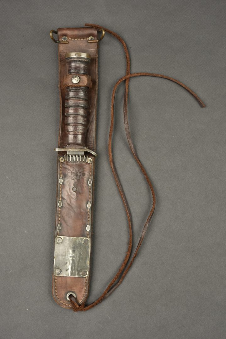 Couteau USM3, fourreau USM6. Pommeau disposant d’un seul rivet de maintien, il s’agit donc d’une reproduction. Belle grenade de l’Ordnance Corps US visible. Poignée... en savoir plus