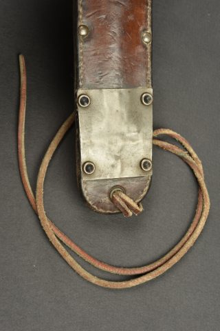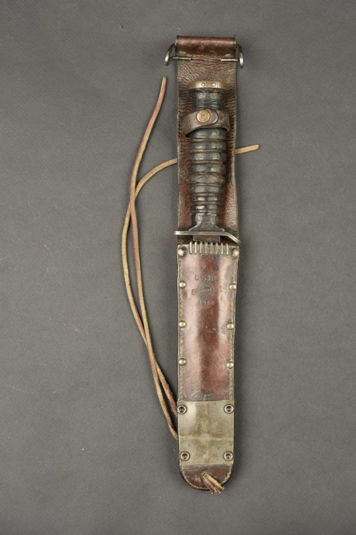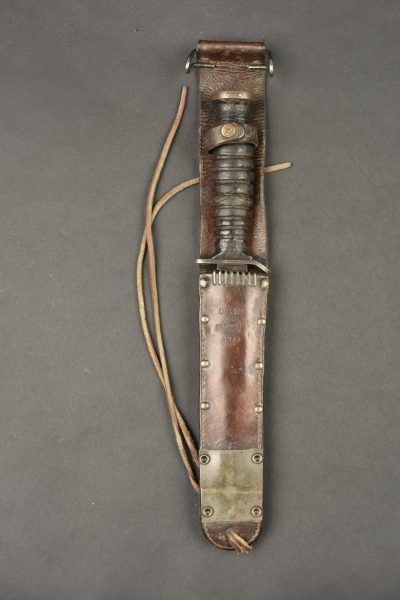 Couteau USM3, fourreau USM6. Pommeau disposant de deux rivets de maintien. Belle grenade de l’Ordnance Corps US visible. Poignée composée d’anneaux en cuir. Belle lame dans sa couleur d’origine à 90%. Fabrication US M3 Camillus 1943. Fourreau USM6 en cuir, huit agrafes d’entrée au fourreau. Fabrication US M6 Barwood 1943. Le crochet de fixation au ceinturon est présent. Lacet en cuir présente, mais dénoué. La patte du fourreau est repercé post war. A noter une certaine usure et patine de la pièce. Etat II+.