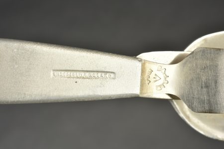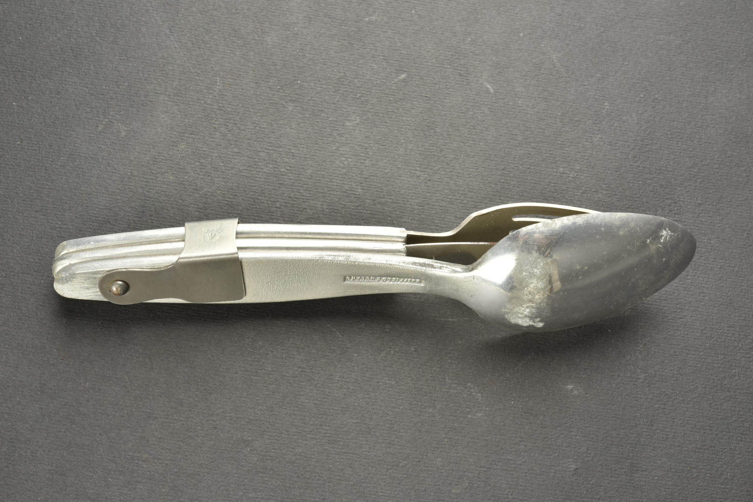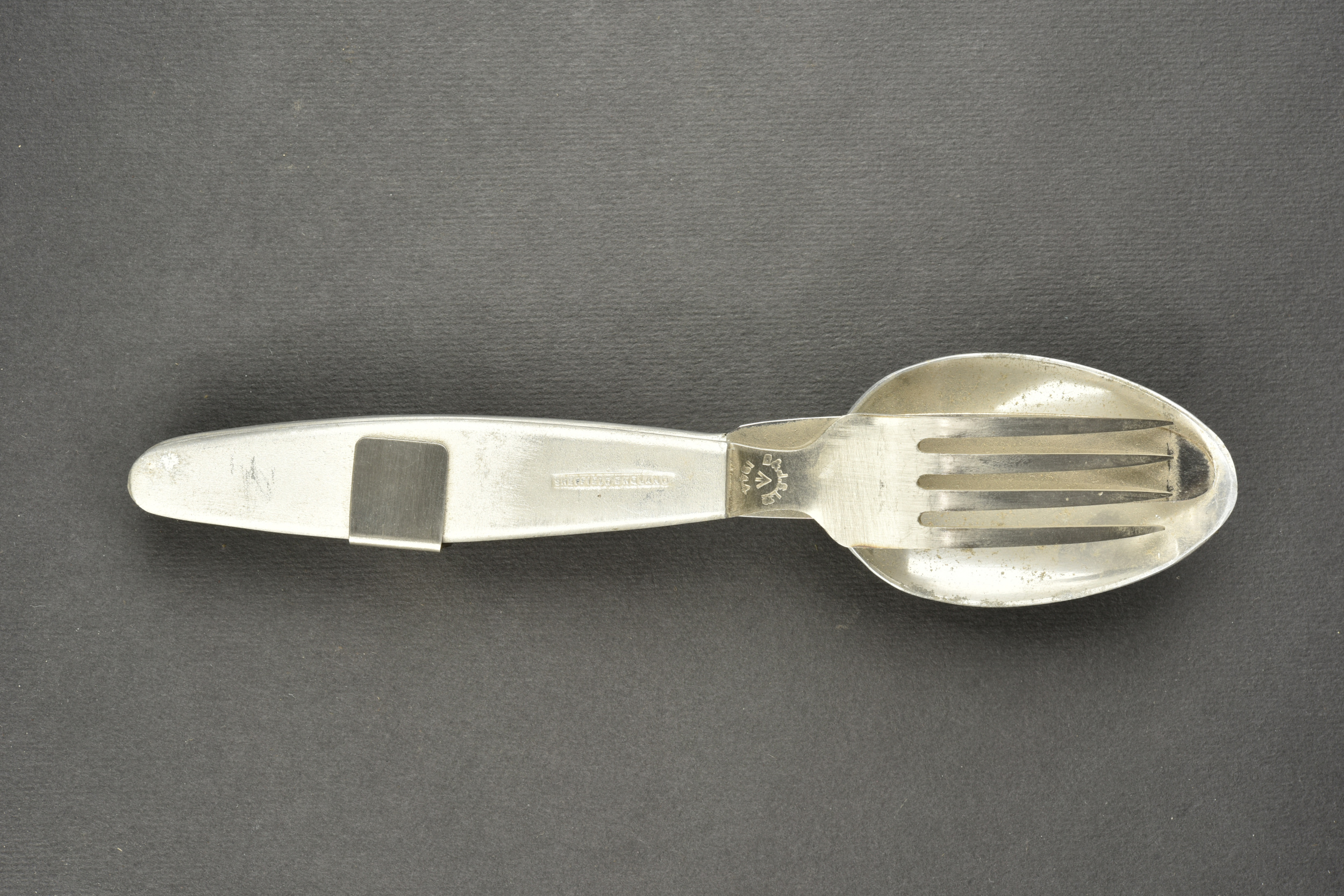 Couverts britannique. Cuillère, couteau et fourchette emboitables. Bien daté 1944 avec broad arrow. A noter une certaine usure et patine des pièces. Etat II+.