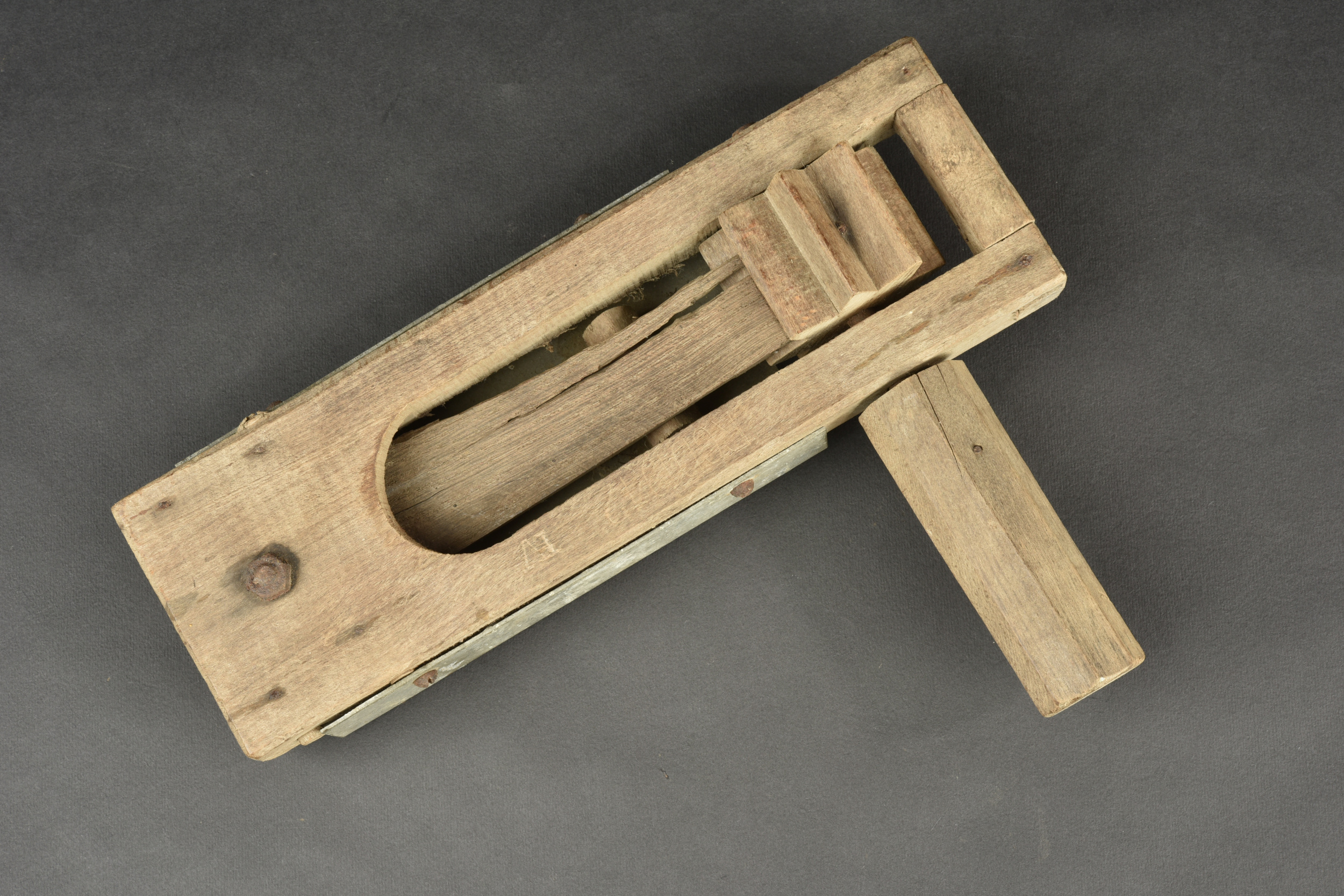 Crécelle anti-gaz. Fabrication en bois et métal. Fonctionnelle. La lamelle en bois est fragilisée avec des fissures et manques visibles. Fabrication RCD 1942 IV. La partie métallique est... en savoir plus