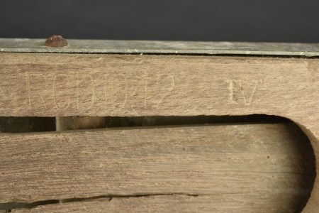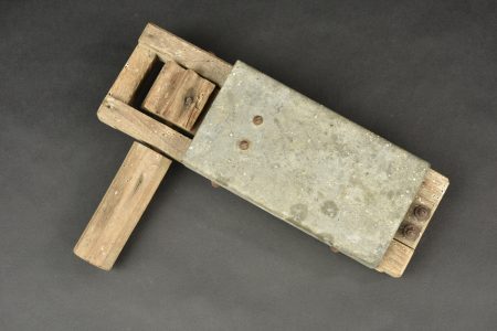 Crécelle anti-gaz. Fabrication en bois et métal. Fonctionnelle. La lamelle en bois est fragilisée avec des fissures et manques visibles. Fabrication RCD 1942 IV. La partie métallique est partiellement oxydé. A noter une certaine usure et patine de la pièce. Etat II+.