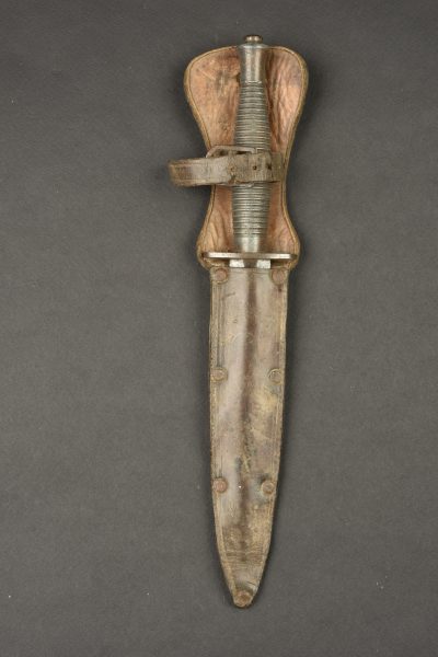 Dague Fairbairnsykes. Poignées annelée en métal. Pommeau portant le numéro de moule 1. Garde marquée B2 avec broad arrow. Lame fortement oxydée. Fourreau en cuir fantaisie. Sans marquages visibles. A noter une forte usure et oxydation de la pièce. Etat II-.