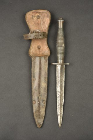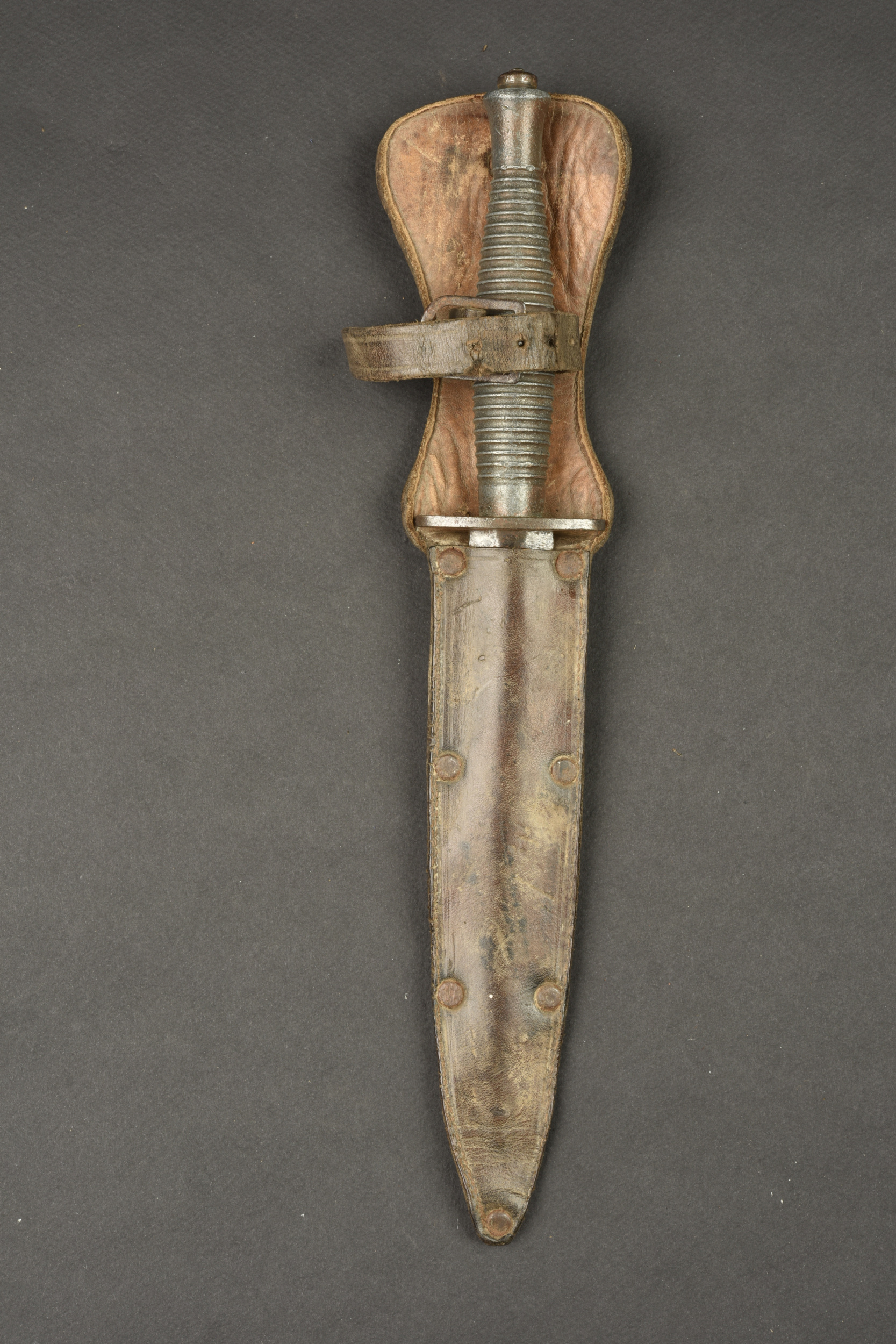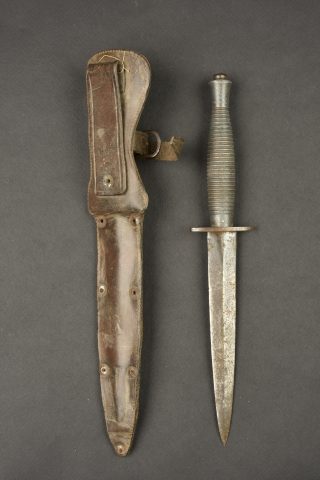 Détails de la vente >Dague Fairbairnsykes. Poignées annelée en métal. Pommeau portant le numéro de moule 1. Garde marquée B2 avec broad arrow. Lame fortement oxydée. Fourreau en cuir fantaisie. Sans marquages... en savoir plus