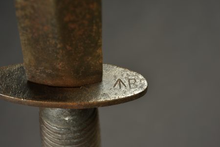 Dague Fairbairnsykes. Poignées annelée en métal. Pommeau portant le numéro de moule 1. Garde marquée B2 avec broad arrow. Lame fortement oxydée. Fourreau en cuir fantaisie. Sans marquages... en savoir plus