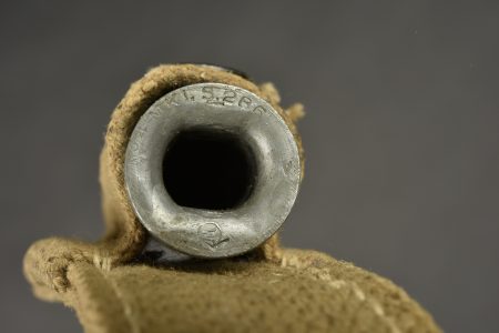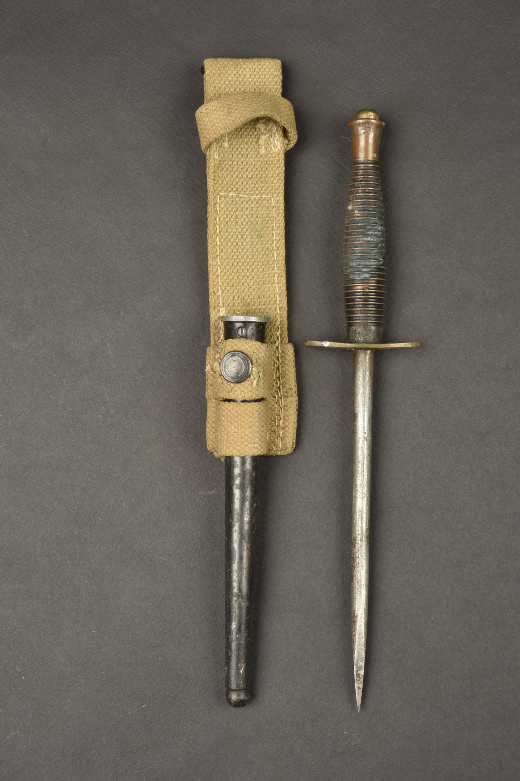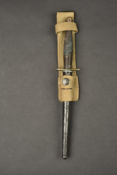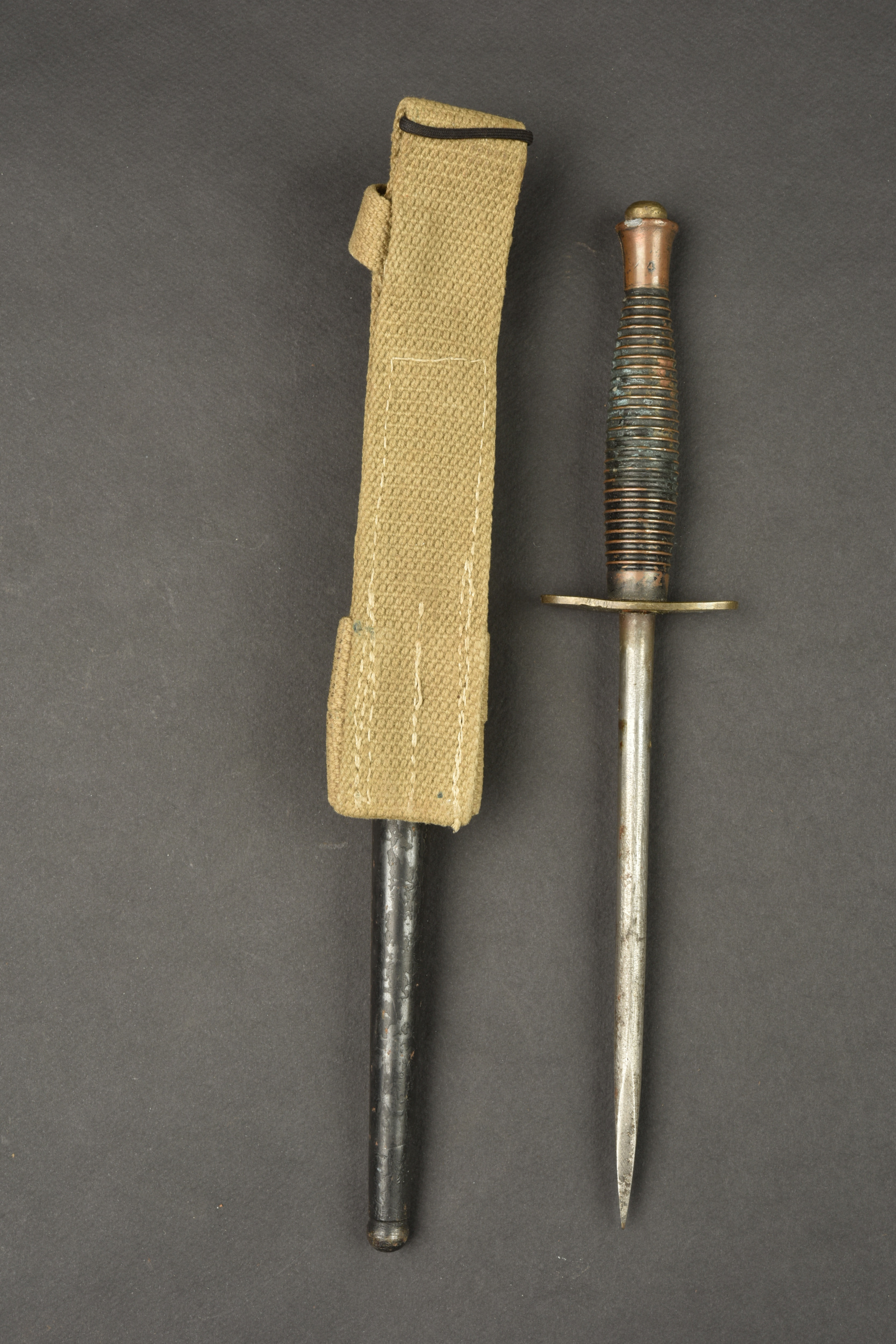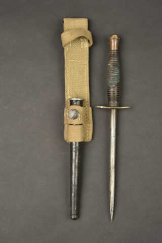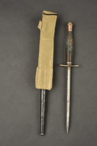 Dague type Fairbairnsykes. Poignées annelée en métal. Pommeau portant le numéro de moule 4. Garde sans marquages. Lame type baïonnette clou, visiblement une modification d’époque. Fourreau de baïonnette clou, peinture noire à 70%. Gousset en forte toile web, sans marquages. A noter une certaine usure et patine de la pièce. Etat II+.