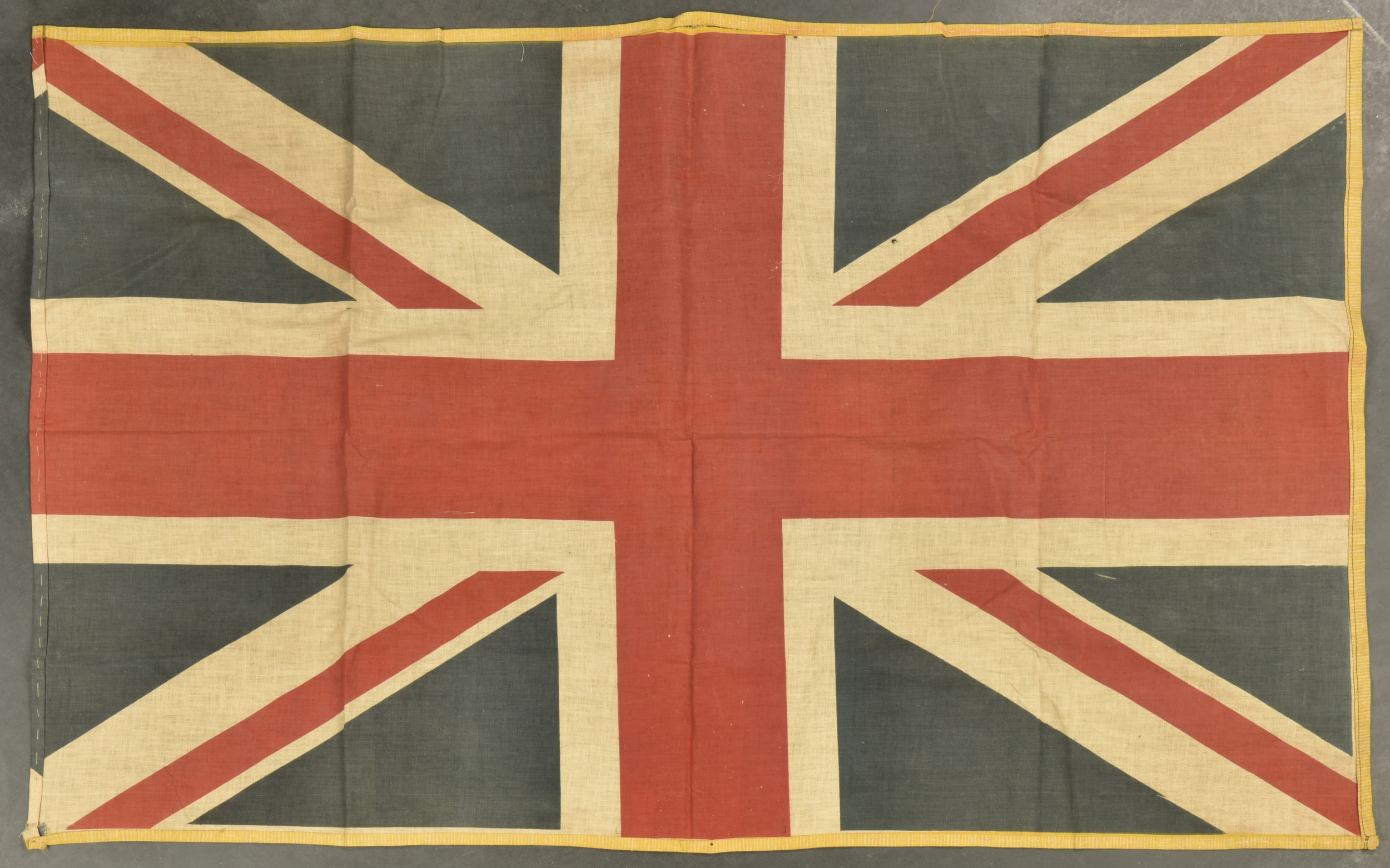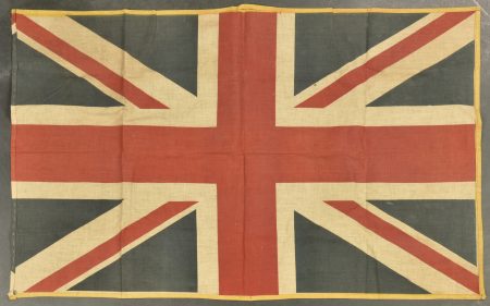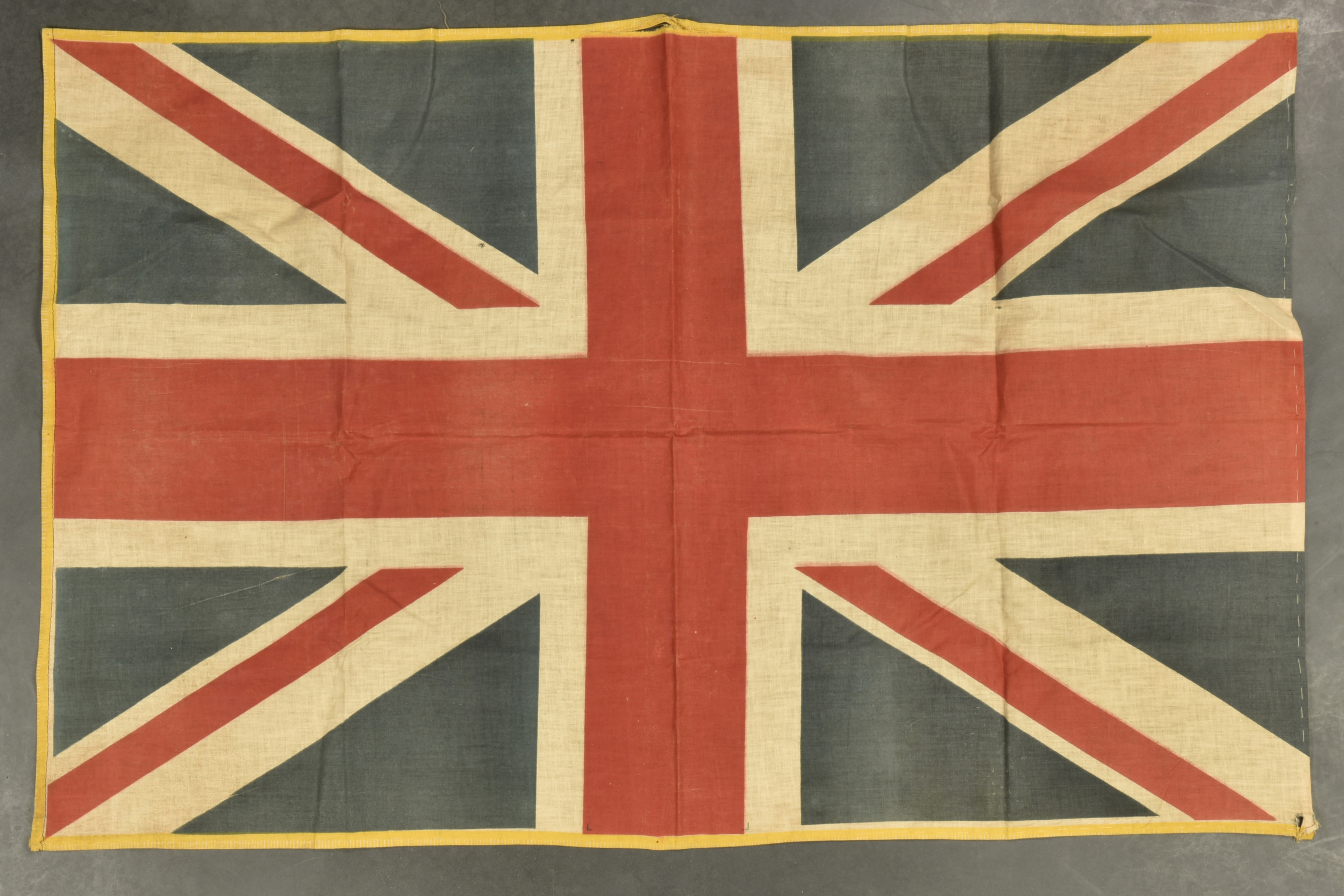 Drapeau Britannique. Union Jack imprimé, double face. Tissu présentant une rigidité relative. Les bordures sont de couleur jaune. Sans marquages visibles. Dimensions 75 x 110 cm. Les couleurs sont partiellement décolorées par le soleil. A noter une certaine usure et patine de la pièce, ainsi que des tâches et accrocs. Etat II+.