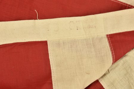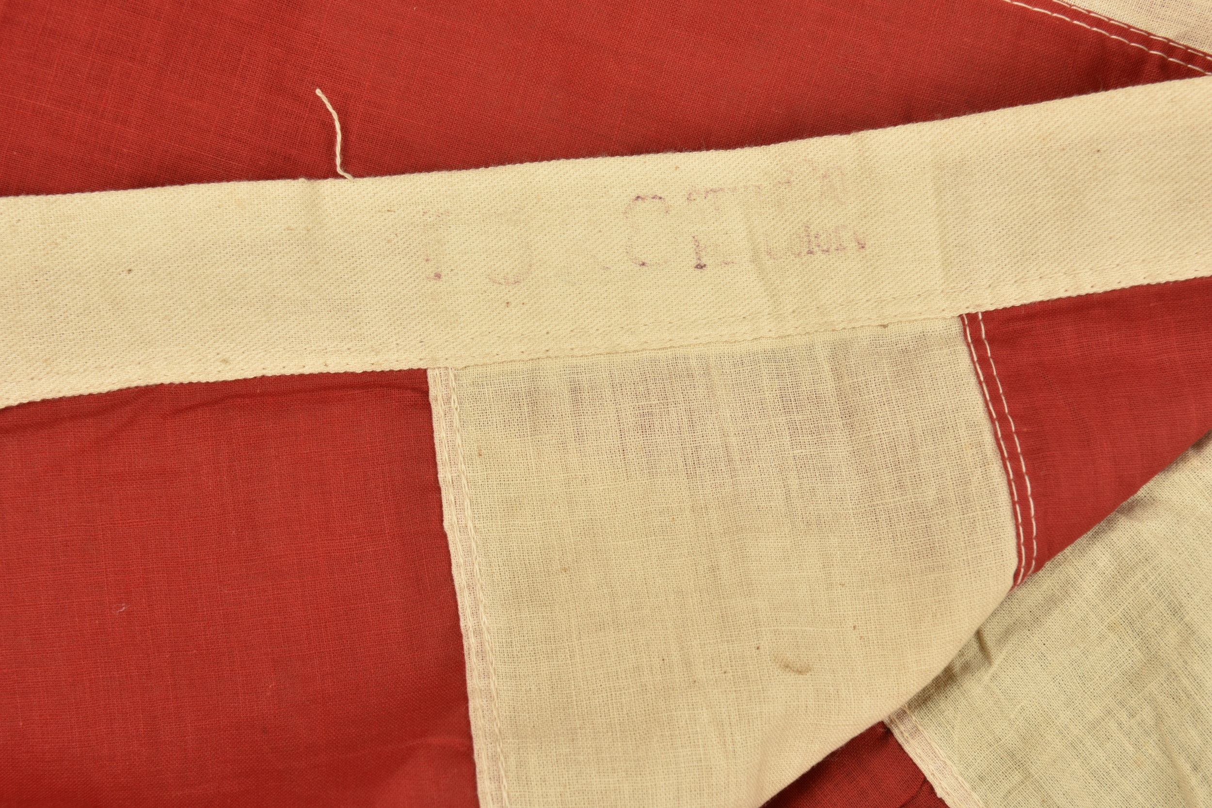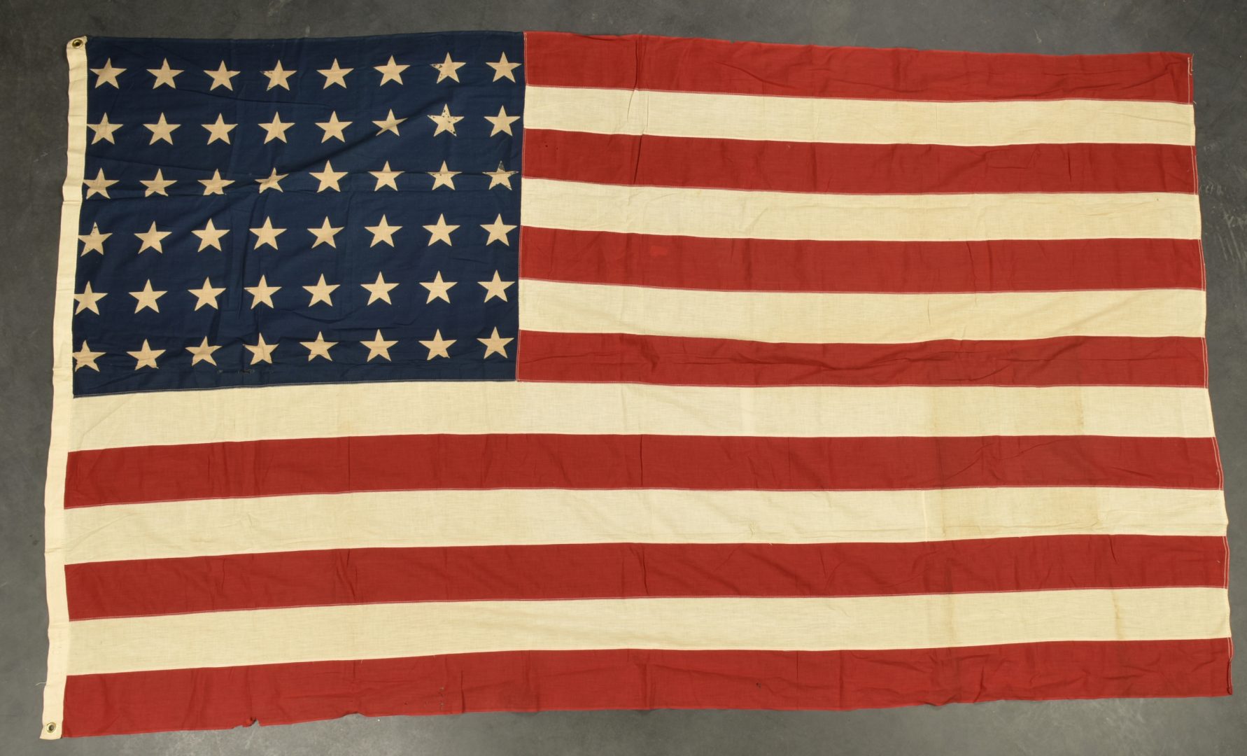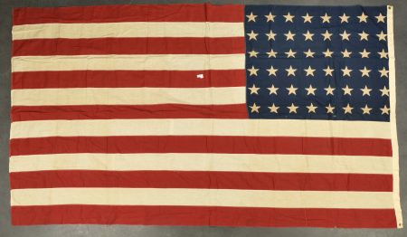 Drapeau US provenant de Fougères. En tissu coton, fabrication en plusieurs parties. 48 étoiles imprimées. Œillets en laiton. Sans marquages visibles. Selon les informations du vendeur, ce drapeau a été retrouvé à Fougères en Ille et Vilaine. Certainement une relique de l’avancement en Bretagne de la 3ème Armée de Patton. Dimensions 145 x 240 cm. A noter une certaine usure et patine de la pièce, ainsi que des manques, accrocs et tâches. Etat II+.