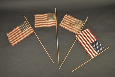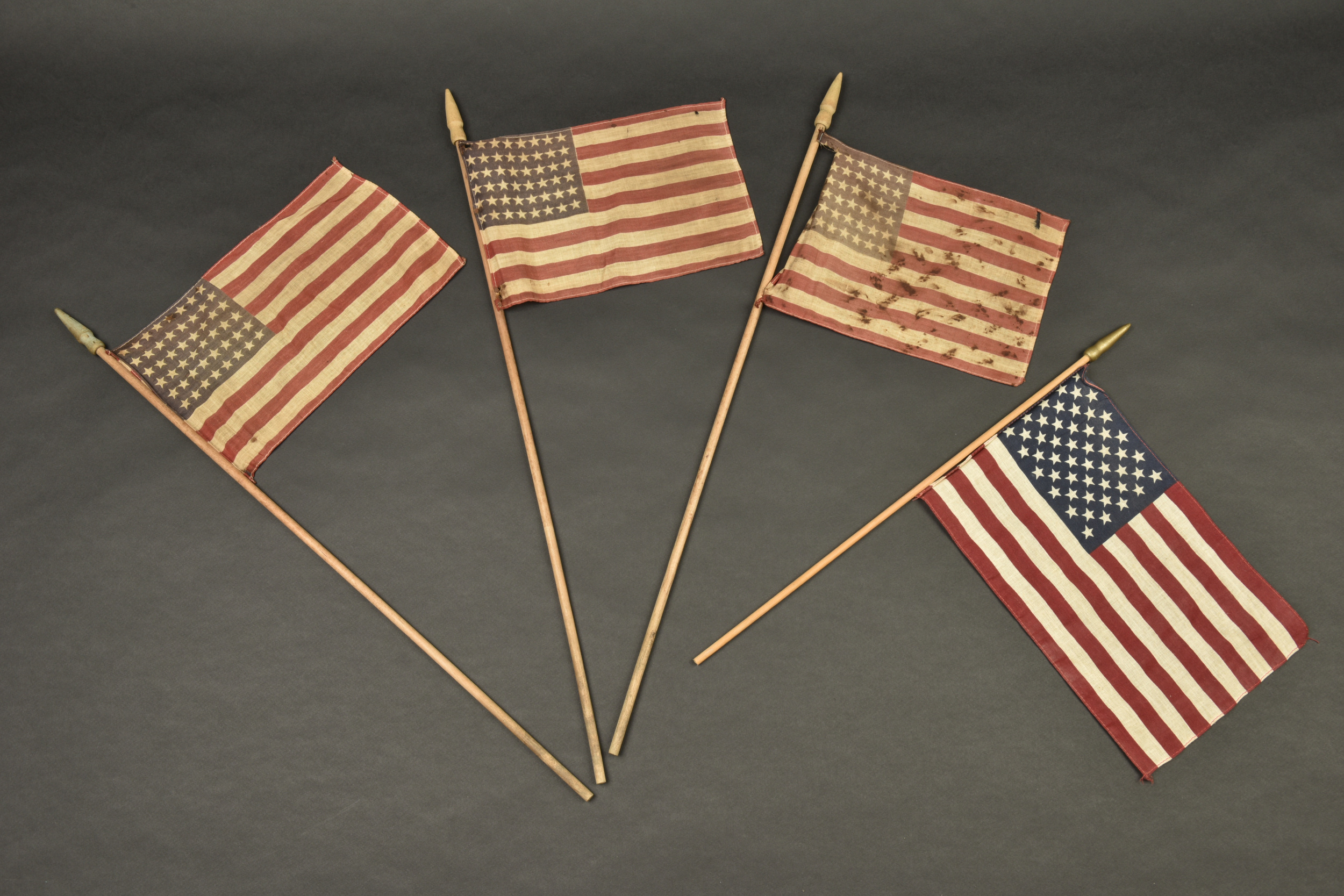 Ensemble de drapeaux US. Quatre drapeau en tissu coton imprimé. 48 étoiles. Double face, montés sur des mats en bois. Un mat est cassé. Hauteur 59 cm. Ces drapeaux étaient distribués aux civils lors de la libération de certains villages et villes. A noter une certaine usure et patine des pièces, ainsi que des tâches et accrocs. Etat II+.