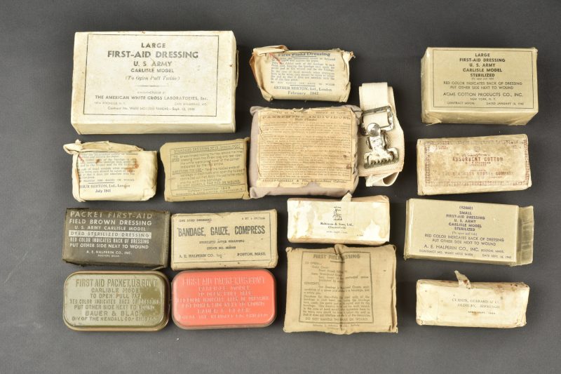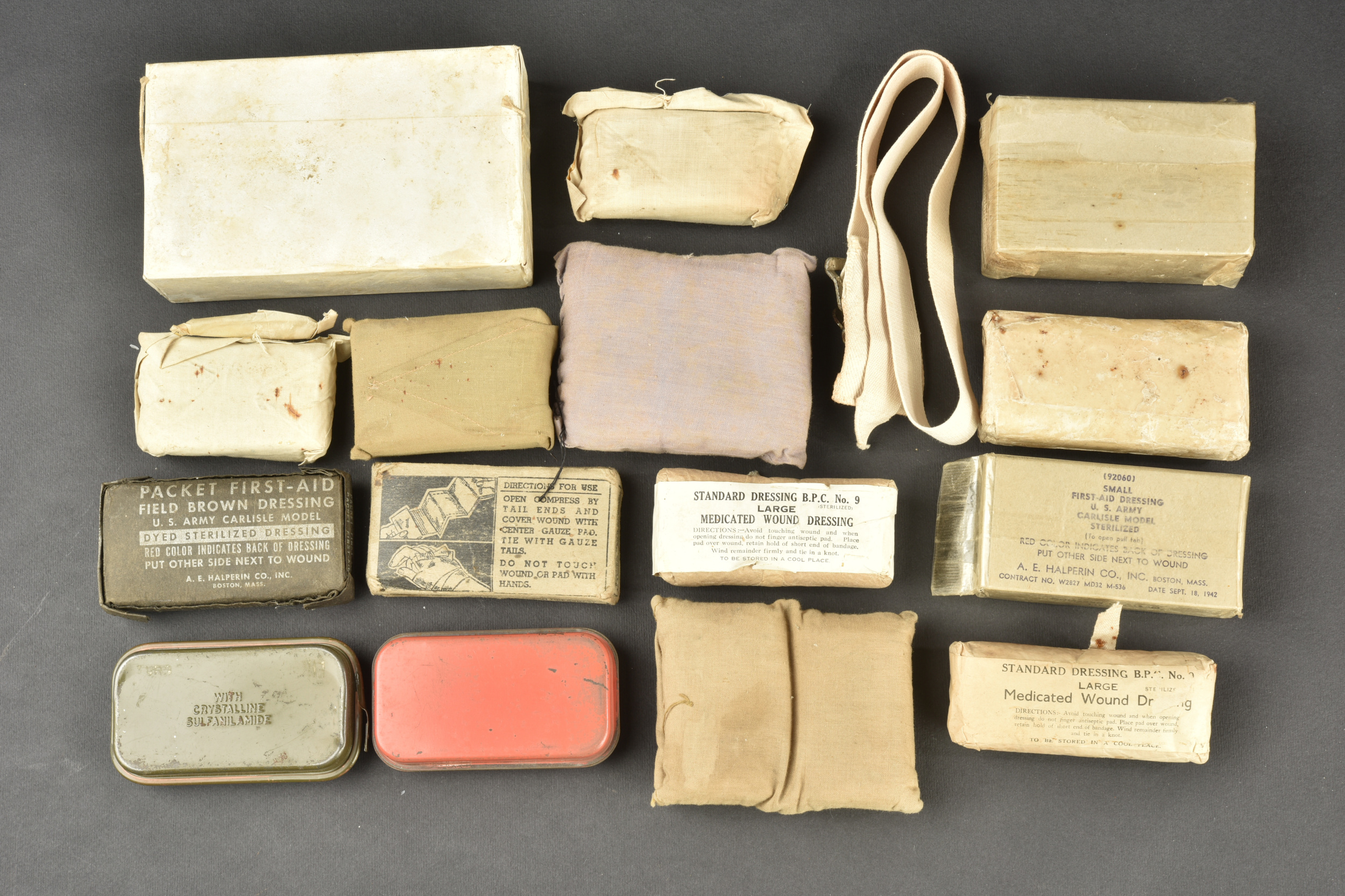 Ensemble de pansements US. Comprenant un pansement dans sa boite en métal kaki, fabrication Bauer & Black Div of the Kendall co Chicago. Un pansement britannique complet, jamais ouvert, fabrication Arthur Berton Ltd London, daté février 1942. Un pansement britannique Stardard Dressing N15, daté 1943, jamais ouvert. Un pansement britannique jamais ouvert, fabrication Arthur Berton Ltd London, 1941. Un pansement jamais ouvert, Standard Dressing BCP NO9, daté avril 1944. Un pansement dans sa boite d’origine, marqué Bandage Gauze Compress, AE Halperin Co Inc Boston Mass. Un pansement jamais ouvert, Standard Dressing BPC N0 9, daté avril 1944. Un pansement dans son emballage d’origine jamais ouvert, Large First Aid Dressing, Acme Cotton Products Co Inc, daté janvier 1942. Un pansement jamais ouvert, marqué Absorbent cotton. Un pansement jamais ouvert, marqué Packet First AId Field Brown Dressing, AE Halpering Co Inc. Un pansement jamais ouvert, marqué Small First AId Dressing, AE Halperin CO Inc, daté du 18 septembre 1942. Un pansement marqué Large First Aid Dressing jamais ouvert, The American White Cross Laboratories Inc, daté 1940. Un pansement individuel français, jamais ouvert, daté 1939. Un pansement First Field Dressing britannique, daté 1942. Un pansement dans sa boite en métal couleur orange, jamais ouvert, fabrication Bauer & Black Div Of The Kendall Co Chicago. Un garrot complet. A noter une certaine usure et patine des pièces. Etat II+.