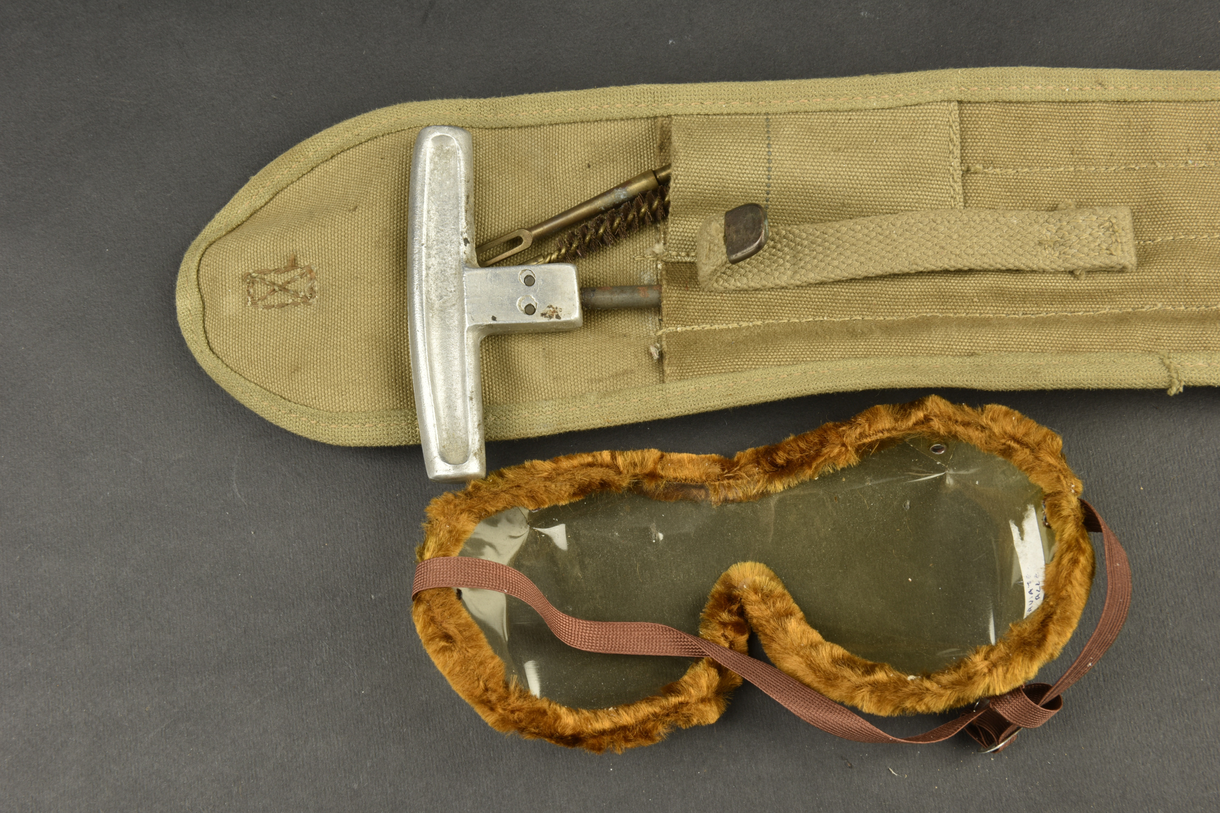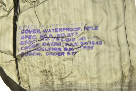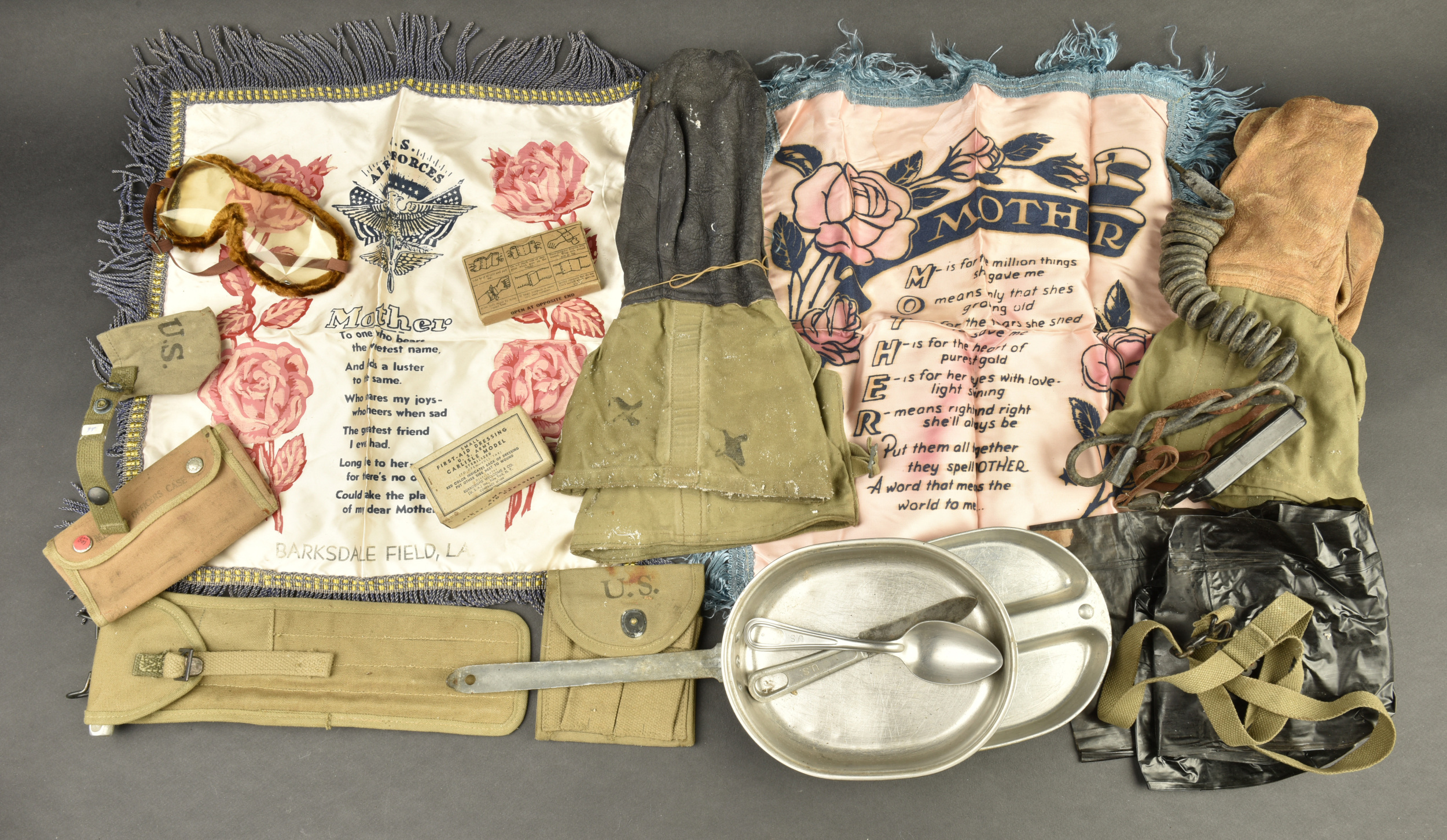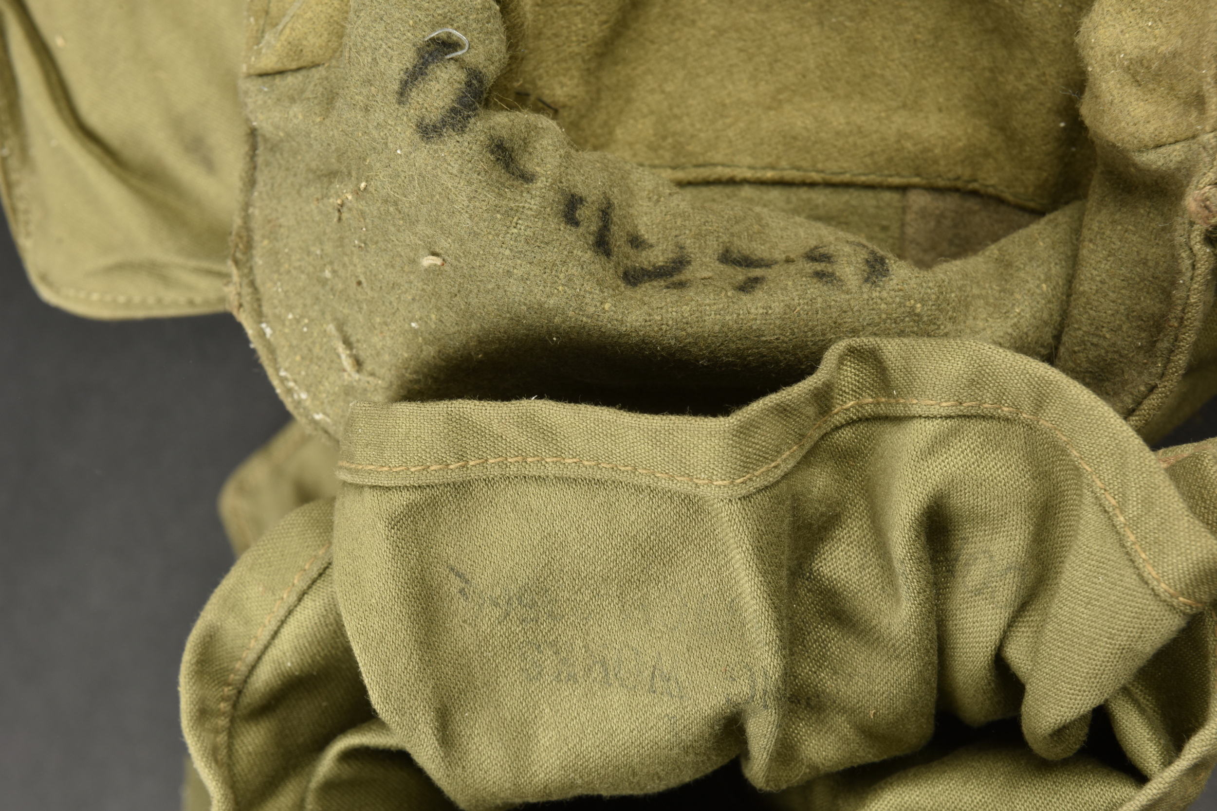 Equipements US. Comprenant une housse étanche pour arme longue, datée du 27 juillet 1943. Deux têtes d’oreillers Sweat Heart. Un pansement Small first dressing. Un couvre canon de Garand, en forte toile OD, les boutons pressions sont fonctionnels. Une gamelle en aluminium, fabrication US MAco 1944. Un pansement Bandage Gauze Compress. Une paire de lunette anti-poussière. Une sangle en forte toile OD. Un boitier radio de poitrine, complet avec son câble et sa prise. Une housse pour nécessaire médical d’officier US, vide, les boutons pressions sont fonctionnels. Une housse pour les accessoires de nettoyage de mitrailleuse de 30 US. M1-C6573A. Une pochette pour chargeurs de carabine US M1. Beau marquage US sur le rabat, le bouton pression est fonctionnel, non réutilisé par l’armée française. Fabrication Biscayne Tent & Awning 1943. Deux paires de gants fortement usés. A noter une certaine usure et patine des pièces, ainsi que des tâches. Etat II+.