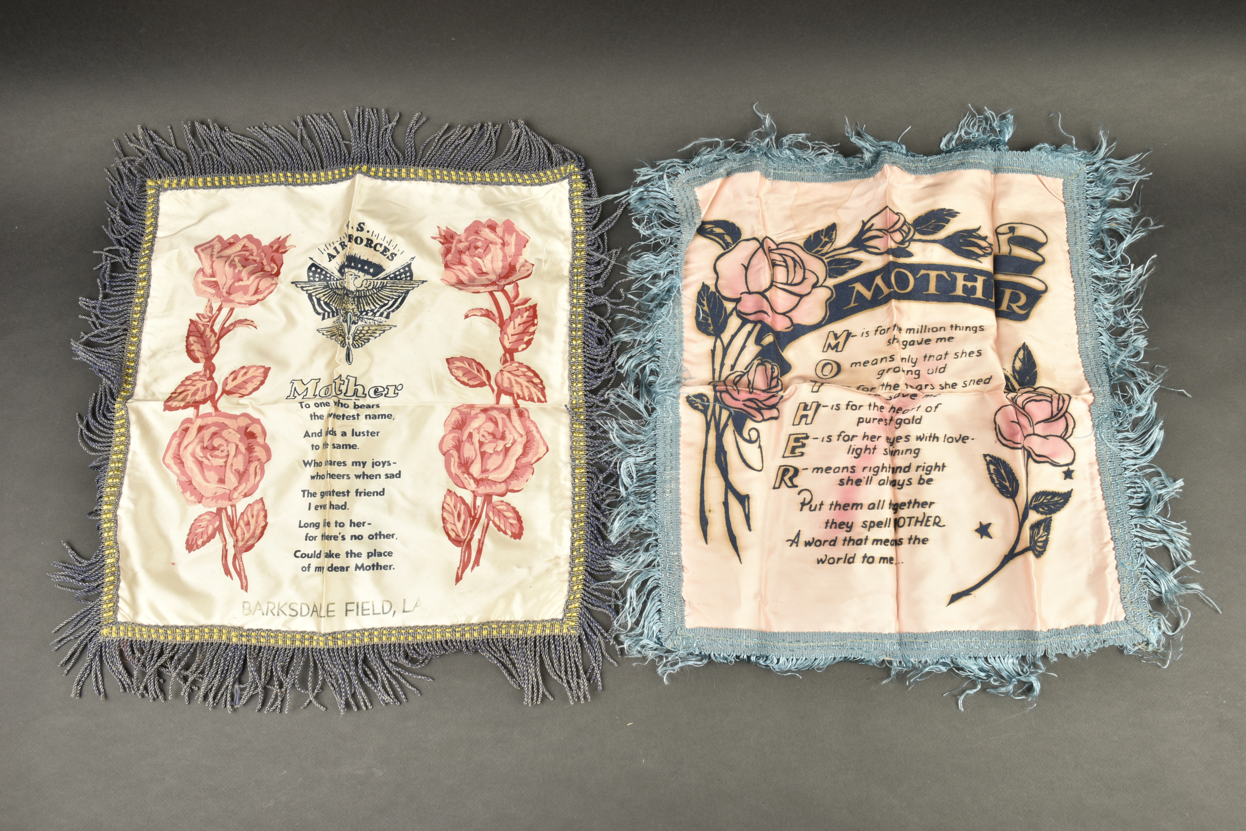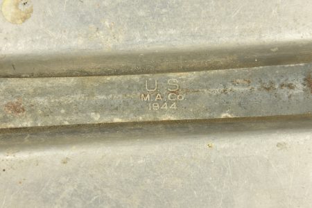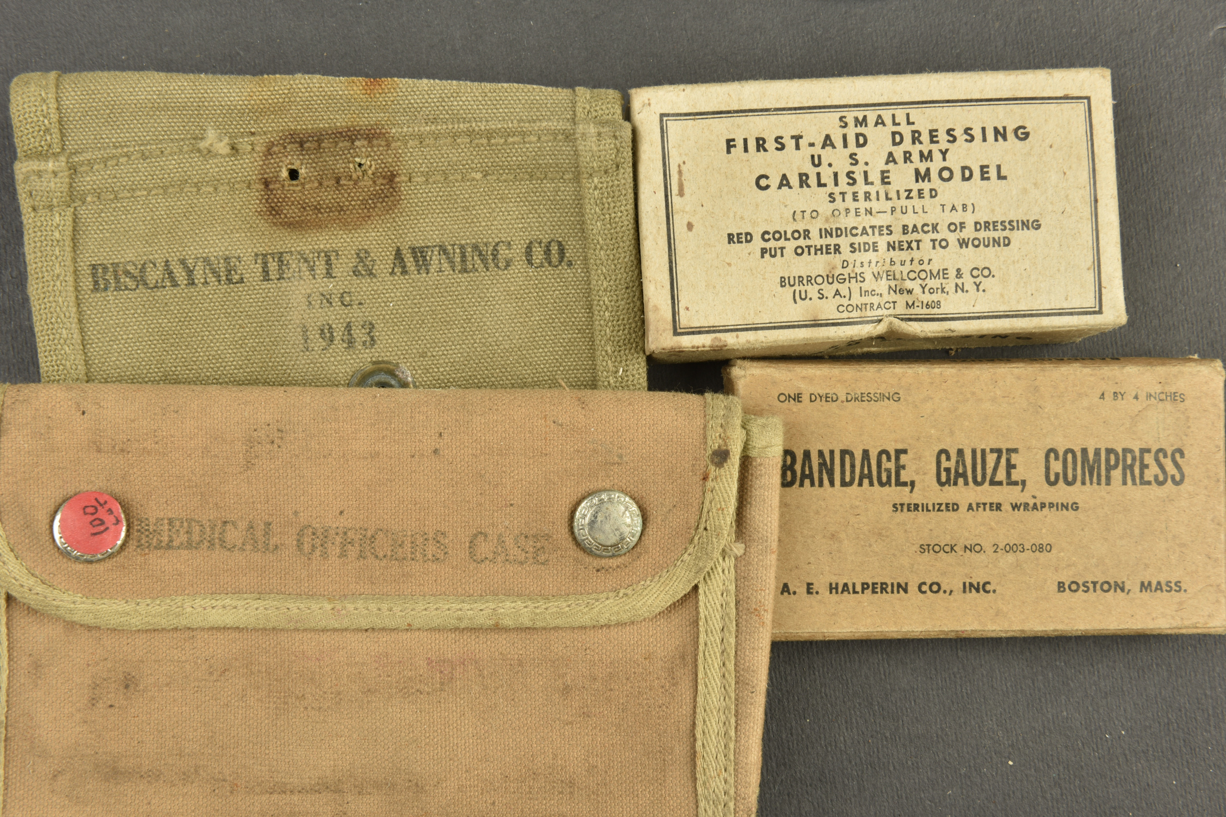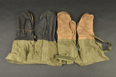 Equipements US. Comprenant une housse étanche pour arme longue, datée du 27 juillet 1943. Deux têtes d’oreillers Sweat Heart. Un pansement Small first dressing. Un couvre canon de Garand, en forte toile OD, les boutons pressions sont fonctionnels. Une gamelle en aluminium, fabrication US MAco 1944. Un pansement Bandage Gauze Compress. Une paire de lunette anti-poussière. Une sangle en forte toile OD. Un boitier radio de poitrine, complet avec son câble et sa prise. Une housse pour nécessaire médical d’officier US, vide, les boutons pressions sont fonctionnels. Une housse pour les accessoires de nettoyage de mitrailleuse de 30 US. M1-C6573A. Une pochette pour chargeurs de carabine US M1. Beau marquage US sur le rabat, le bouton pression est fonctionnel, non réutilisé par l’armée française. Fabrication Biscayne Tent & Awning 1943. Deux paires de gants fortement usés. A noter une certaine usure et patine des pièces, ainsi que des tâches. Etat II+.