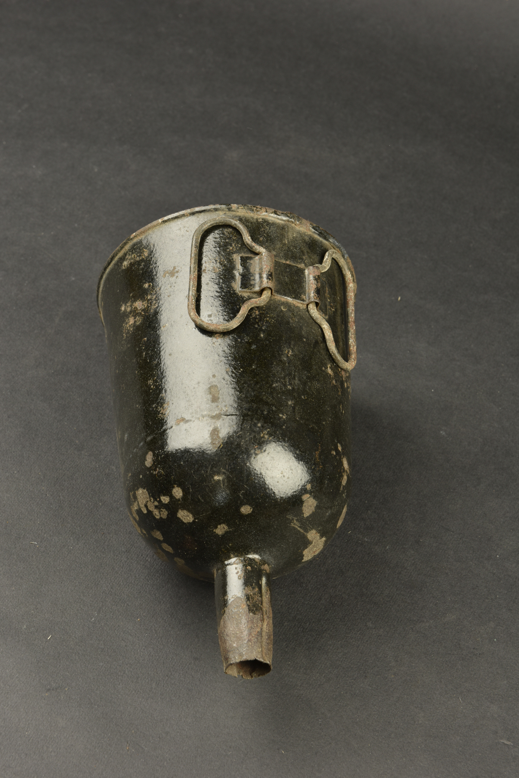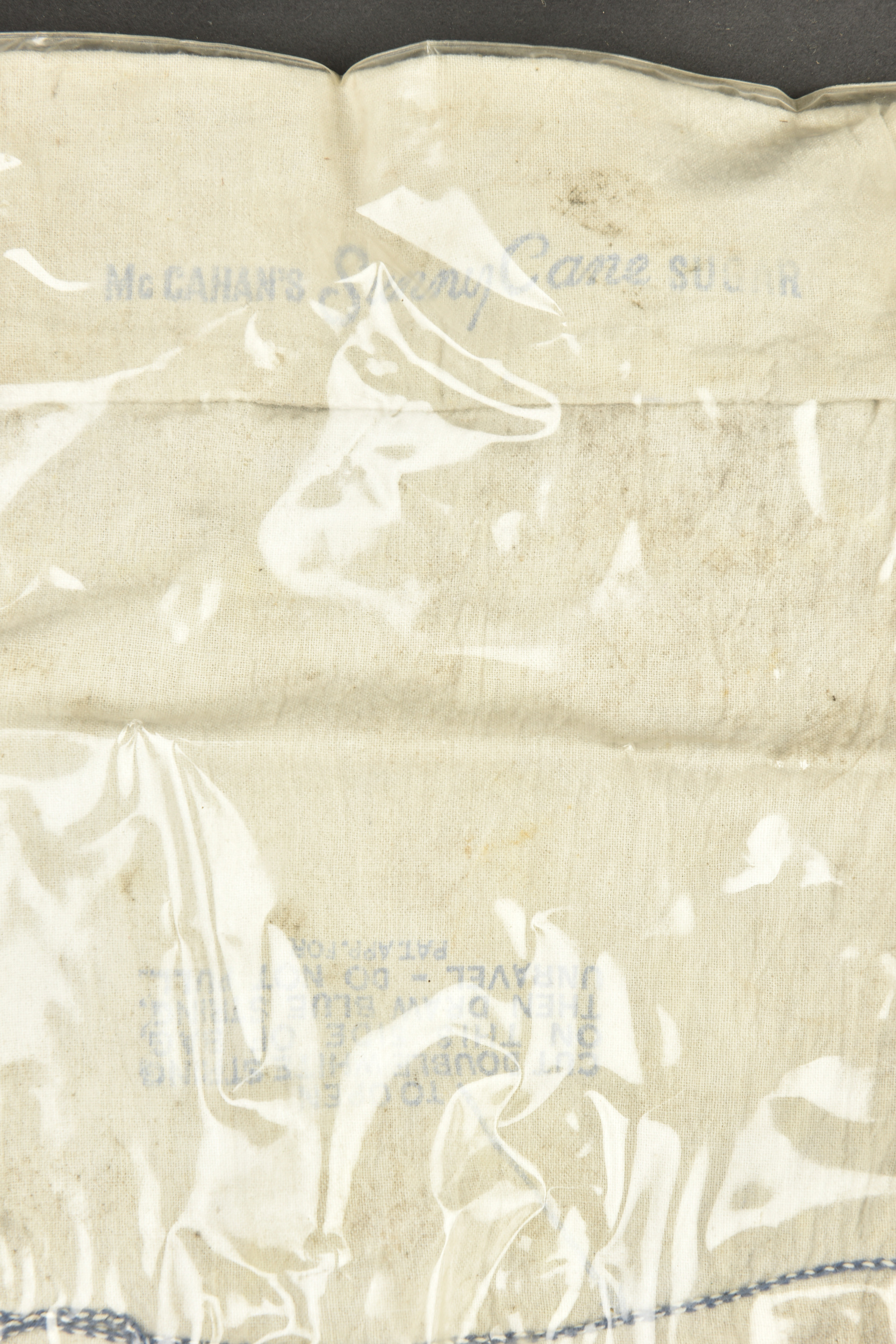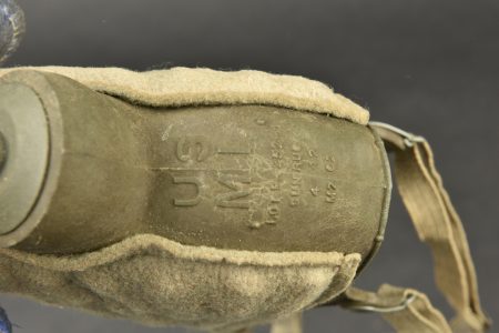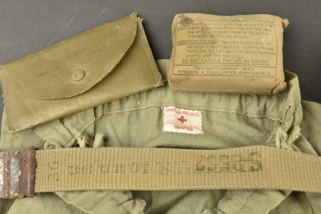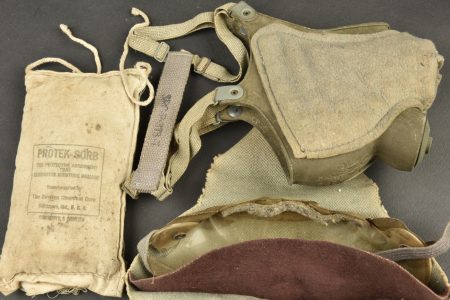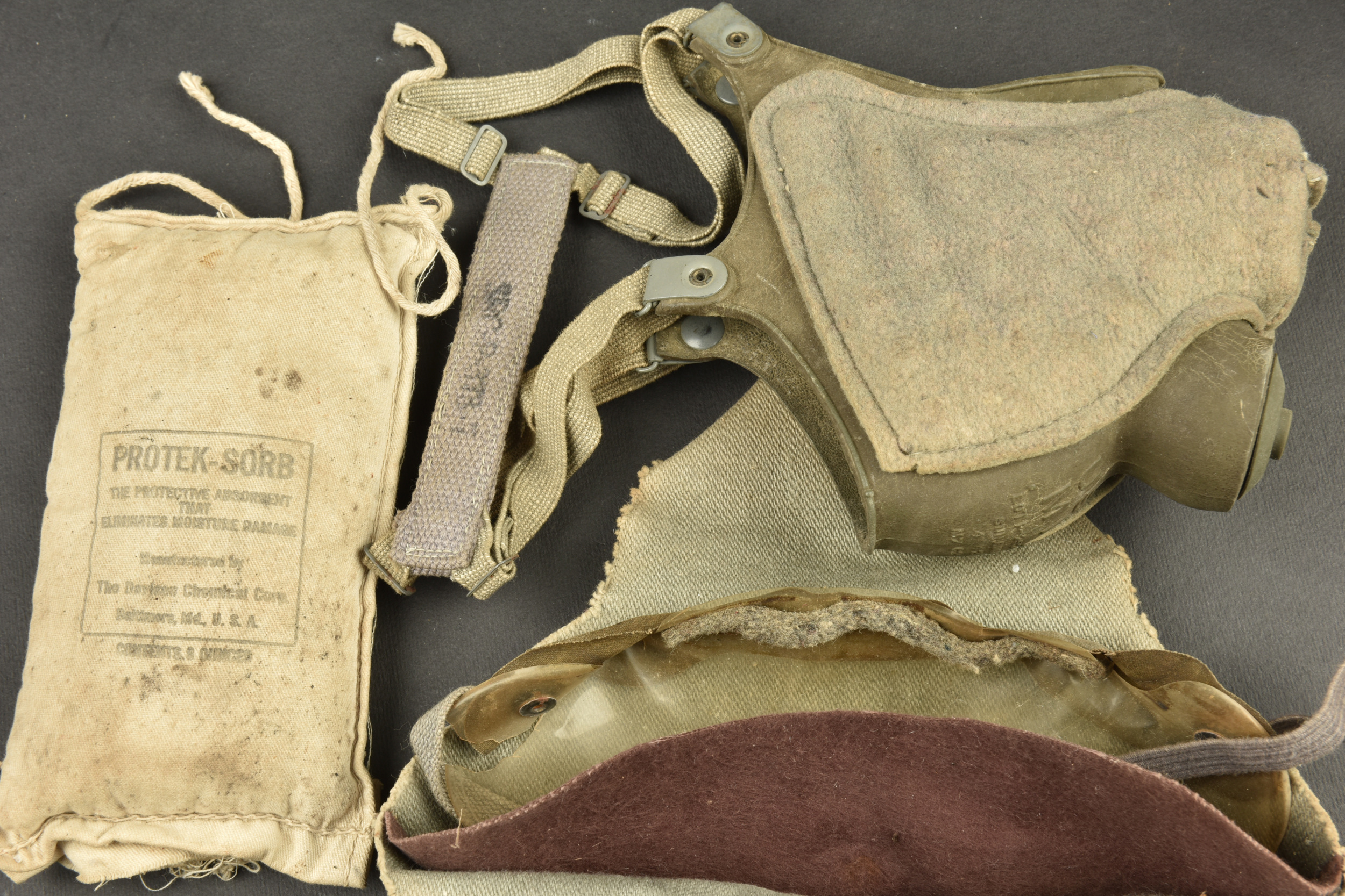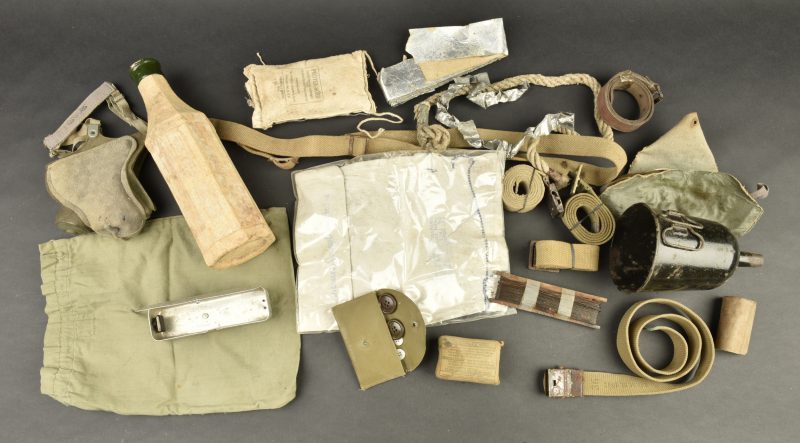 Equipements divers. Comprenant une boite vide en aluminium, sans marquages visibles. Un petit sac en tissu HBT, le cordon de serrage est complet. Un pansement britannique, daté 1943. Une sangle américaine, dont les parties métalliques sont oxydées. Une paire de lunette anti-poussière, dans sa housse, fortement abîmée. Une ceinture de pantalon, taille 36, daté 1943. Une bande en aluminium. Une sangle en cuir. Un sac complet, marqué Protek Sorb. Un rouleau de câble métallique sur son support en bois. Un masque anti-poussière M1, fortement mité, toutes les sangles sont présentes. Une bande en aluminium. Un petit sac en toile blanche, marquée MC Cahans Sunny Cane Sugar. Une ceinture de pantalon, sans marquages visibles. Un nécessaire de couture dans sa housse en toile imperméabilisée kaki. Un manchon en cuir, sans marquages. Deux ceintures de pantalon, sans marquages visibles. Une bouteille en carton, vide, bouchon manquant, sans marquages visibles. Un entonnoir en métal émaillé noir, sans marquages visibles. A noter une certaine usure et patine des pièces. Etat II+.
