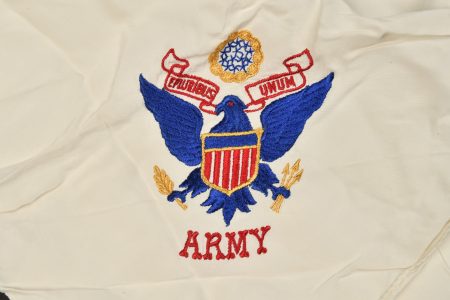 Détails de la vente >Foulard Army. En tissu blanc. Broderie représentant l’aigle américain et la mention Army. Dimensions 75 x 75 cm. A noter une légère usure et patine de la pièce. Etat I-.