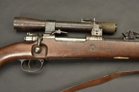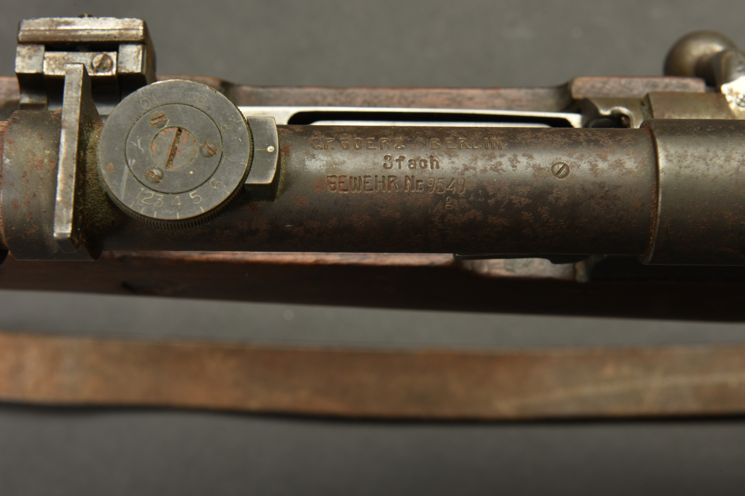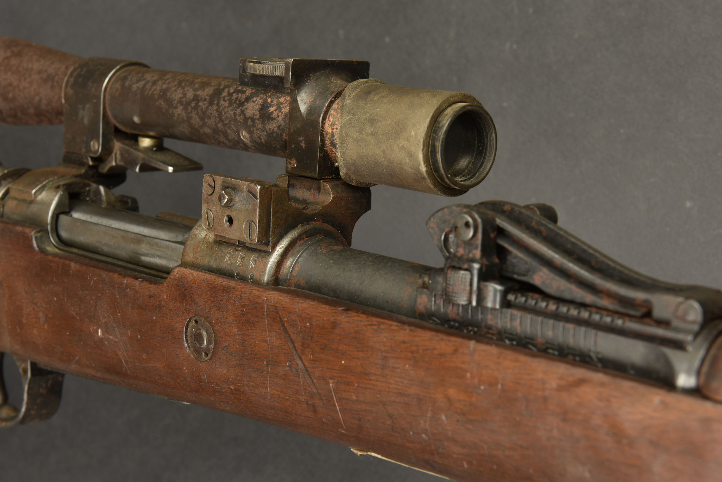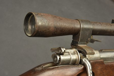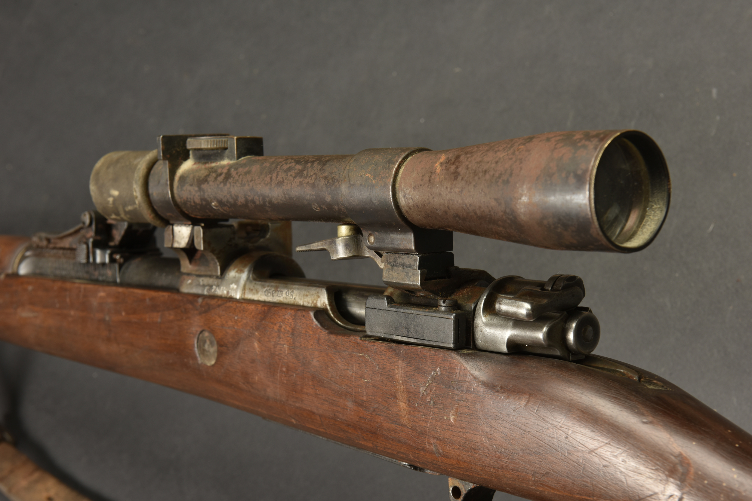Fusil à répétition G98 avec lunette. Les parties métalliques présentes une certaine oxydation. Baguette de nettoyage complète. Numéro 8904G. Daté 1915. Le marquage fabricant est non visible car recouvert par la lunette de visée. Arme visiblement au numéro . Belle crosse en bois disposant du marquages B sous couronne. Lunette en métal partiellement oxydée. Marquages CE Goerz Berlin 31 ACH Gewehr Nr 9540. Optique en parfait état. Bretelle en cuir complète. Culasse bloquée par la neutralisation. Quelques réparations d’origine sur la crosse. A noter une certaine usure et patine de la pièce. Etat II+. Catégorie C9. Arme neutralisée aux nouvelles normes européenne par le Banc d’épreuve de Saint Etienne. Cette arme doit être déclarée avec Cerfa et certificat médical de moins de 1 mois ou licence de tir tamponnée ou permis de chasse valide (art R312-56). La délivrance de l’arme n’aura lieu qu’après consultation du fichier Finadia. L’inscription de l’acheteur sur ce fichier entrainera automatiquement la nullité de la vente. A noter une certaine usure et patine de la pièce. Etat II+.