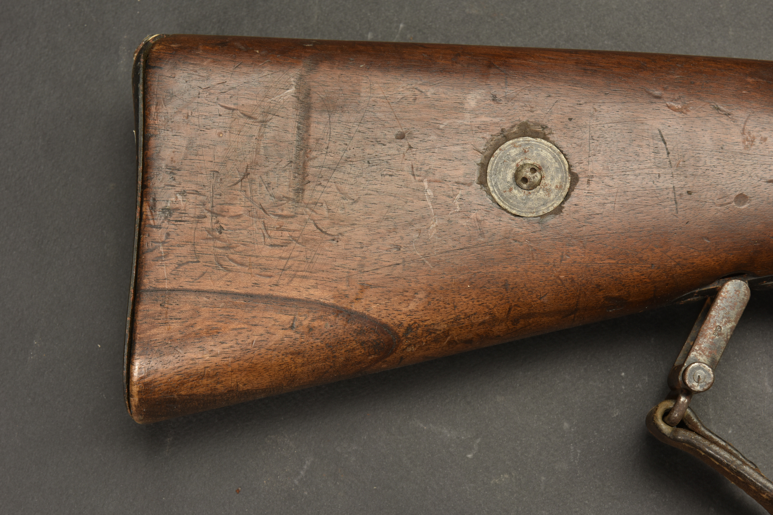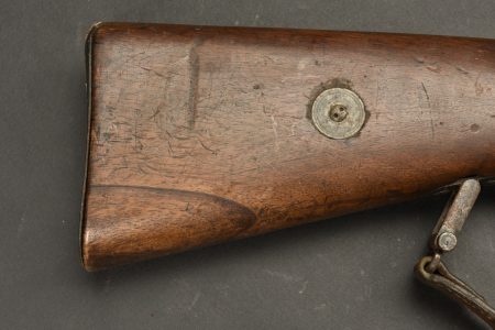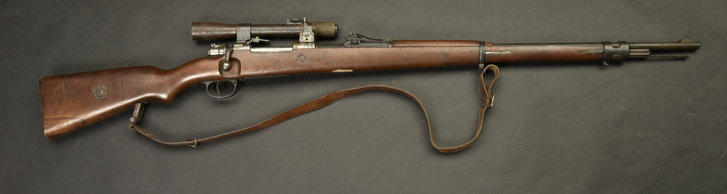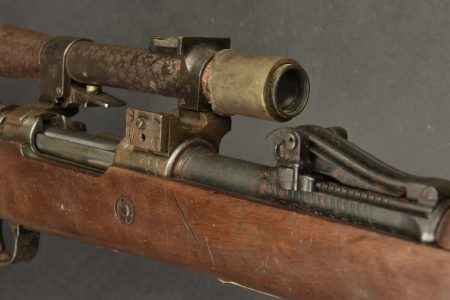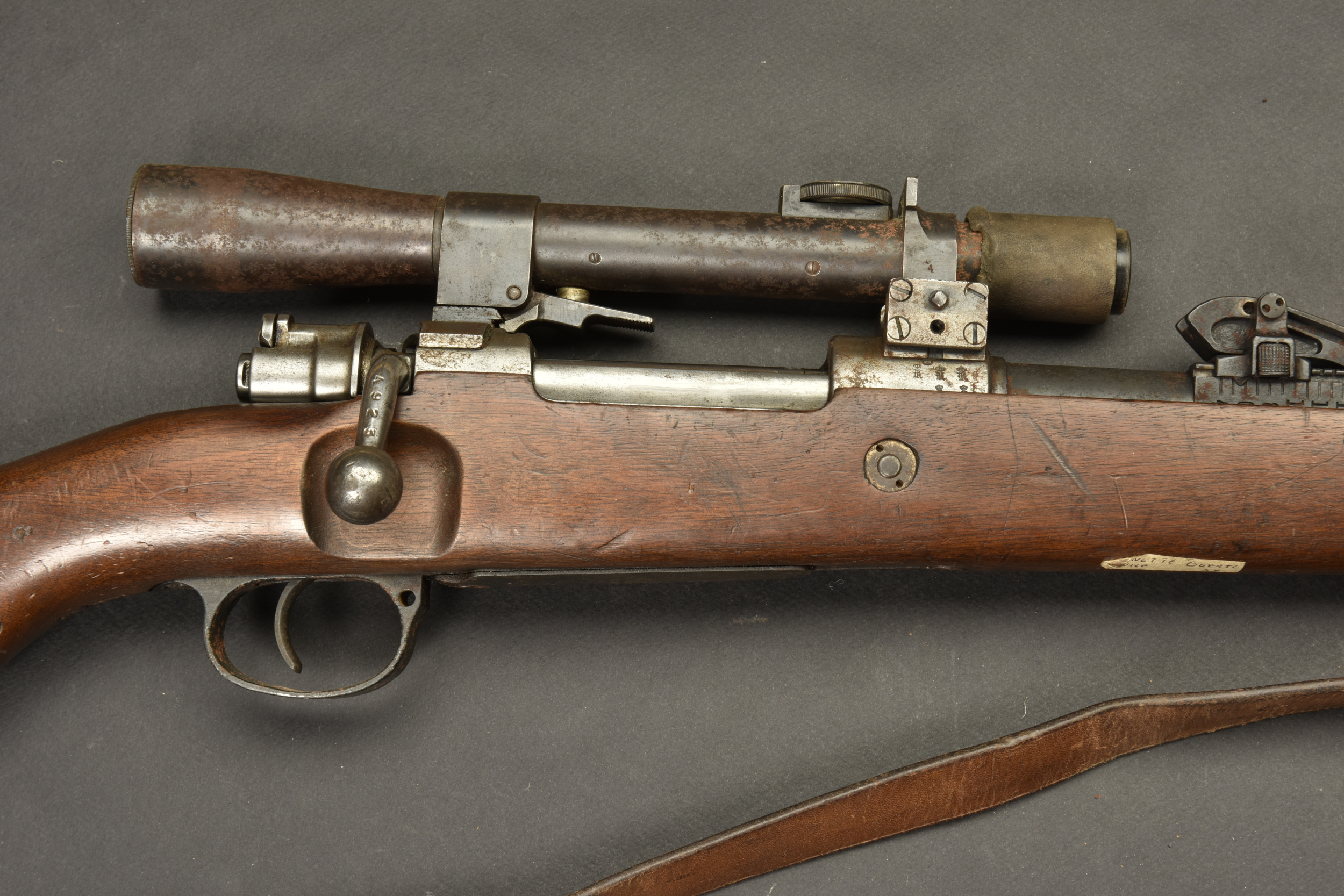 Fusil à répétition G98 avec lunette. Les parties métalliques présentes une certaine oxydation. Baguette de nettoyage complète. Numéro 8904G. Daté 1915. Le marquage fabricant est non visible car recouvert par la lunette de visée. Arme visiblement au numéro . Belle crosse en bois disposant du marquages B sous couronne. Lunette en métal partiellement oxydée. Marquages CE Goerz Berlin 31 ACH Gewehr Nr 9540. Optique en parfait état. Bretelle en cuir complète. Culasse bloquée par la neutralisation. Quelques réparations d’origine sur la crosse. A noter une certaine usure et patine de la pièce. Etat II+. Catégorie C9. Arme neutralisée aux nouvelles normes européenne par le Banc d’épreuve de Saint Etienne. Cette arme doit être déclarée avec Cerfa et certificat médical de moins de 1 mois ou licence de tir tamponnée ou permis de chasse valide (art R312-56). La délivrance de l’arme n’aura lieu qu’après consultation du fichier Finadia. L’inscription de l’acheteur sur ce fichier entrainera automatiquement la nullité de la vente. A noter une certaine usure et patine de la pièce. Etat II+.
