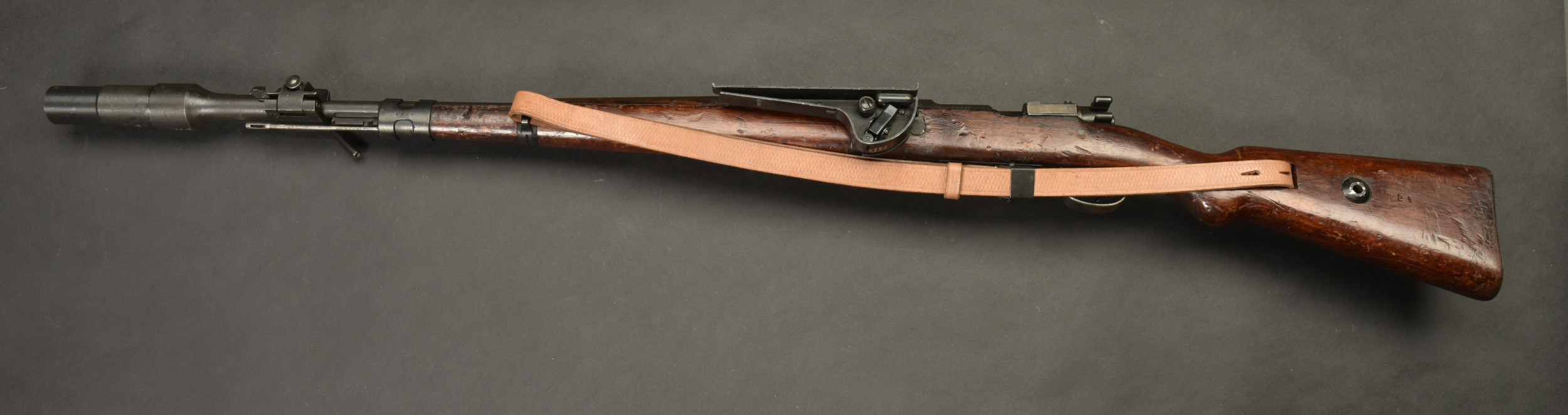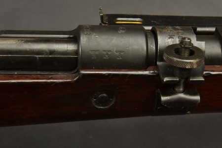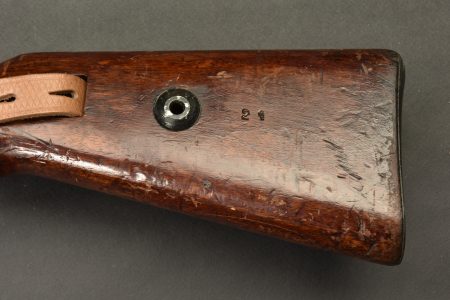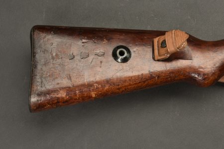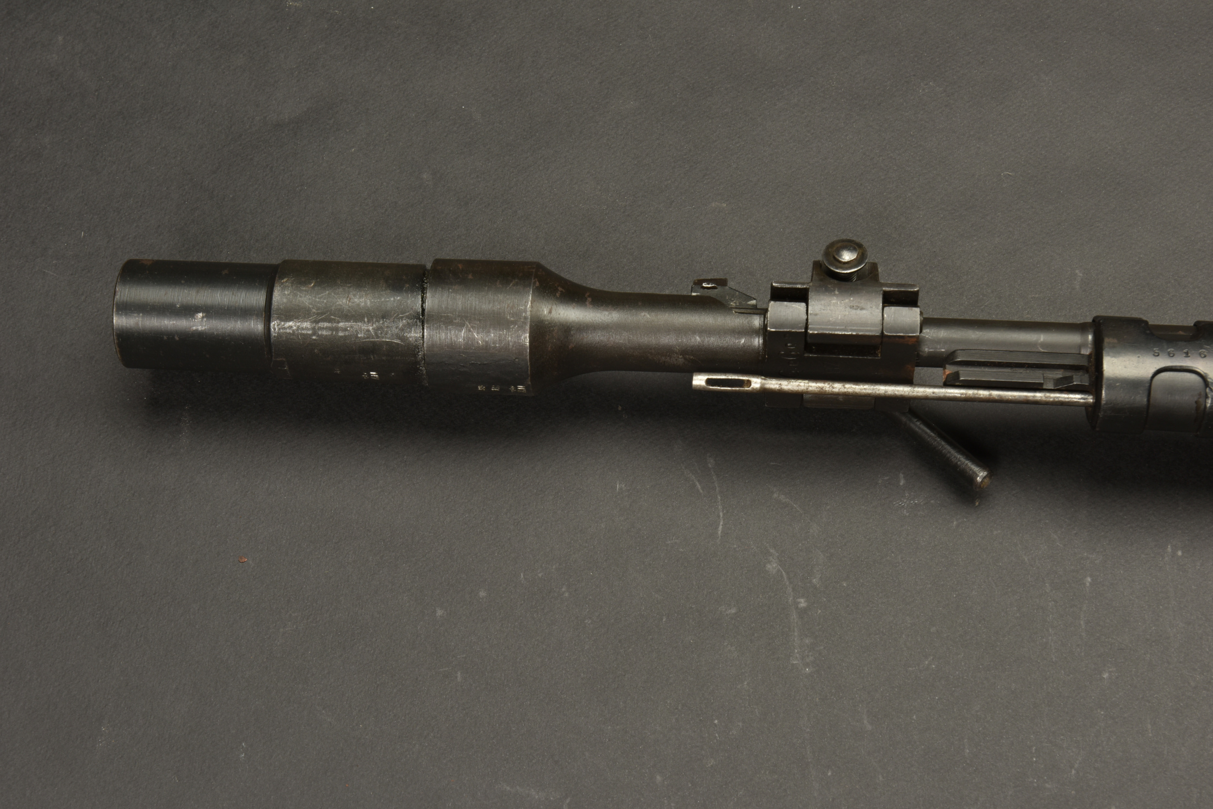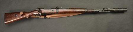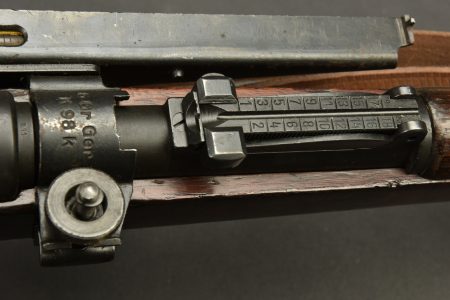 Fusil à répétition Mauser Mod 98. Les parties métalliques sont dans leur bronzage d’origine à 90%. Nombreux aigles Waa. Numéro 2410Q. Code fabricant 42 1938. L’arme n’est pas au numéro. Belle crosse en bois verni, quelques marques visibles. Nombreux marquages du Reichsamt. Culasse mobile grâce à une neutralisation +. Baguette de nettoyage complète. Bretelle en cuir postérieure. Alidade de visée pour lance grenade N2599, bien marquée G GR GER K 98K. Tromblon complet, marqué G GR GER HH7. Le tromblon est neutralisé. A noter une certaine usure et patine de la pièce. Etat II+. Catégorie C9. Arme neutralisée aux nouvelles normes européenne par le Banc d’épreuve de Saint Etienne. Cette arme doit être déclarée avec Cerfa et certificat médical de moins de 1 mois ou licence de tir tamponnée ou permis de chasse valide (art R312-56). La délivrance de l’arme n’aura lieu qu’après consultation du fichier Finadia. L’inscription de l’acheteur sur ce fichier entrainera automatiquement la nullité de la vente. A noter une certaine usure et patine de la pièce. Etat II+.