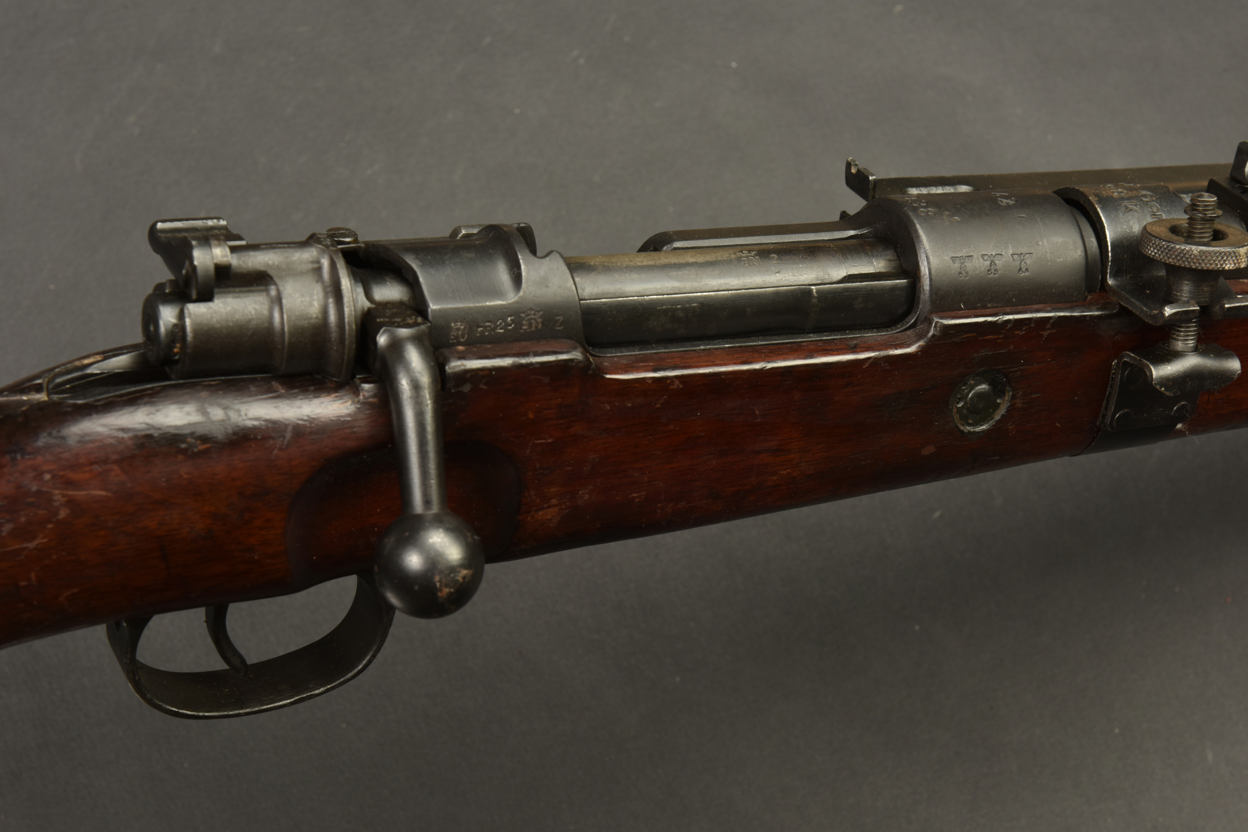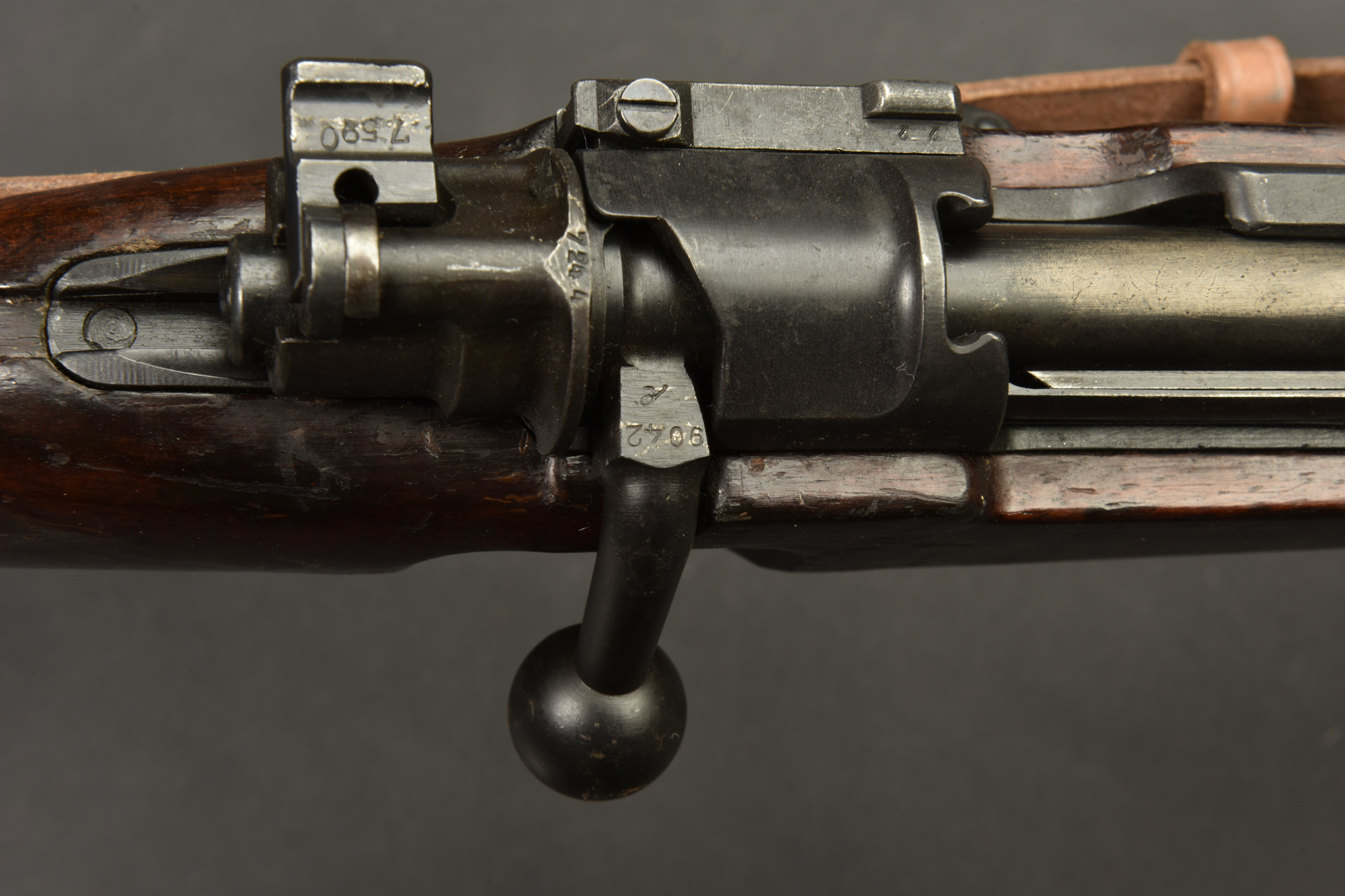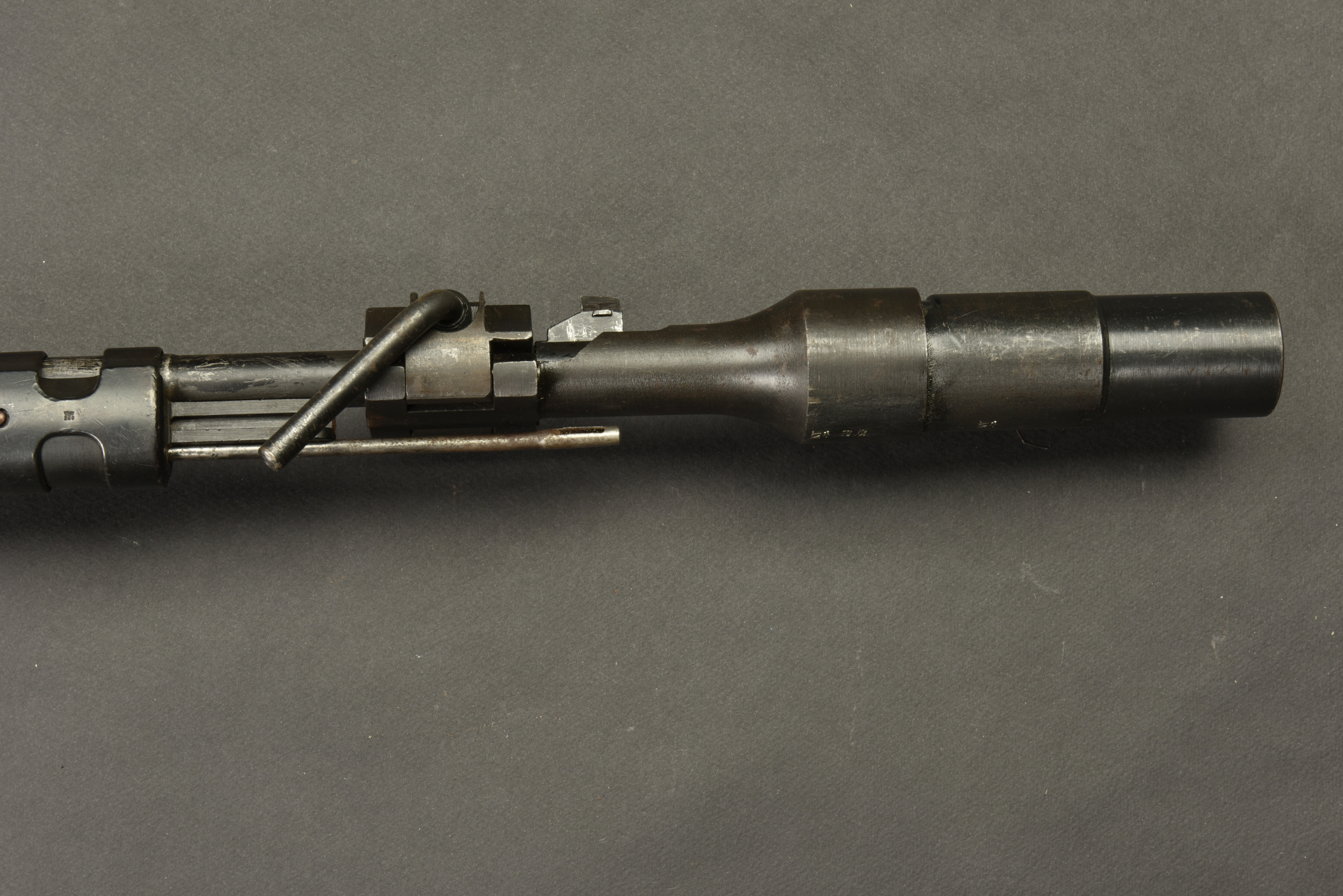 Fusil à répétition Mauser Mod 98. Les parties métalliques sont dans leur bronzage d’origine à 90%. Nombreux aigles Waa. Numéro 2410Q. Code fabricant 42 1938. L’arme n’est pas au numéro. Belle crosse en bois verni, quelques marques visibles. Nombreux marquages du Reichsamt. Culasse mobile grâce à une neutralisation +. Baguette de nettoyage complète. Bretelle en cuir postérieure. Alidade de visée pour lance grenade N2599, bien marquée G GR GER K 98K. Tromblon complet, marqué G GR GER HH7. Le tromblon est neutralisé. A noter une certaine usure et patine de la pièce. Etat II+. Catégorie C9. Arme neutralisée aux nouvelles normes européenne par le Banc d’épreuve de Saint Etienne. Cette arme doit être déclarée avec Cerfa et certificat médical de moins de 1 mois ou licence de tir tamponnée ou permis de chasse valide (art R312-56). La délivrance de l’arme n’aura lieu qu’après consultation du fichier Finadia. L’inscription de l’acheteur sur ce fichier entrainera automatiquement la nullité de la vente. A noter une certaine usure et patine de la pièce. Etat II+.