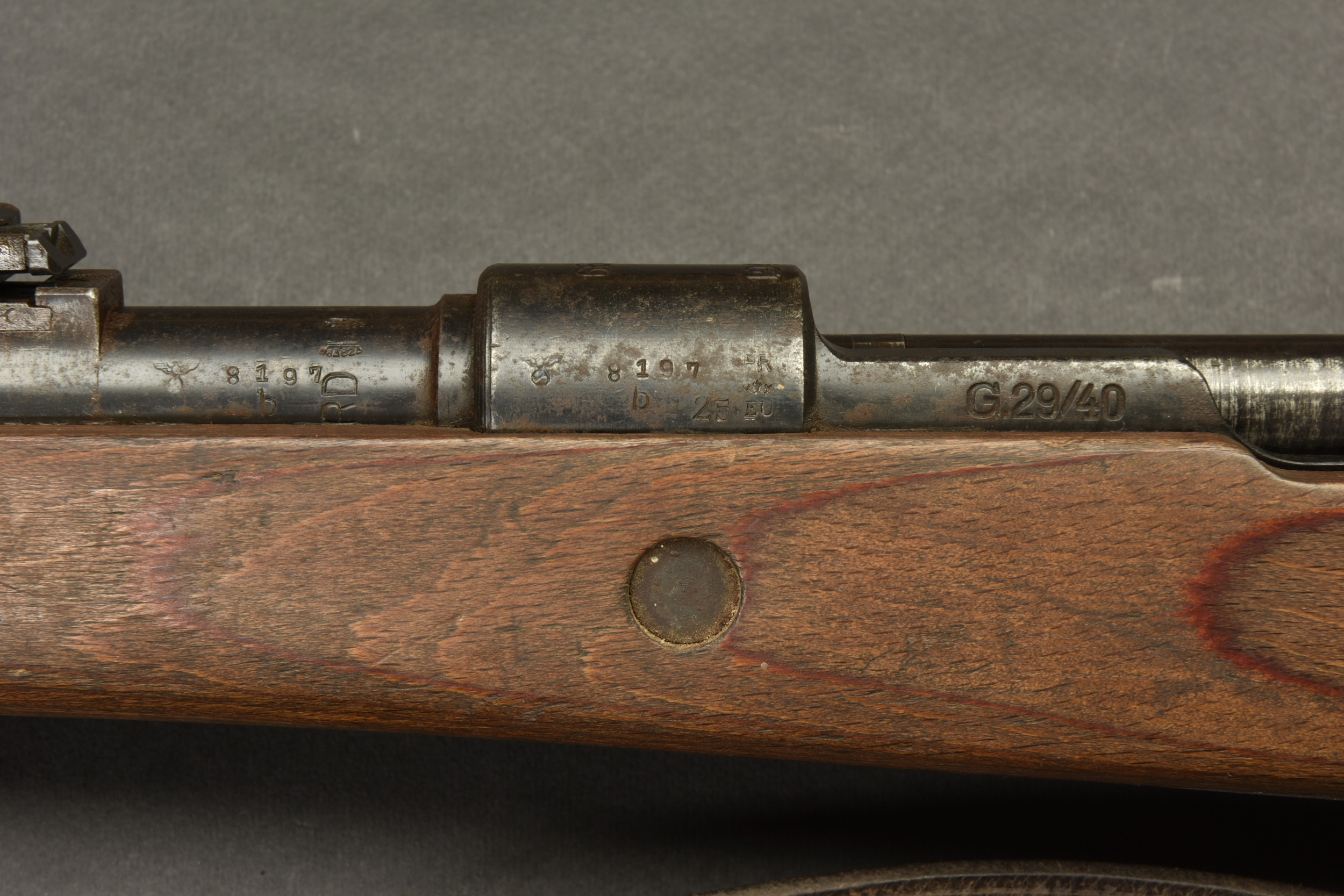 Détails de la vente >Fusil G29/40. Garnitures métalliques présentant une légère oxydation. Marquages G29/40. Numéro 8197B. L’arme n’est pas au même numéro. Baguette de nettoyage complète.... en savoir plus