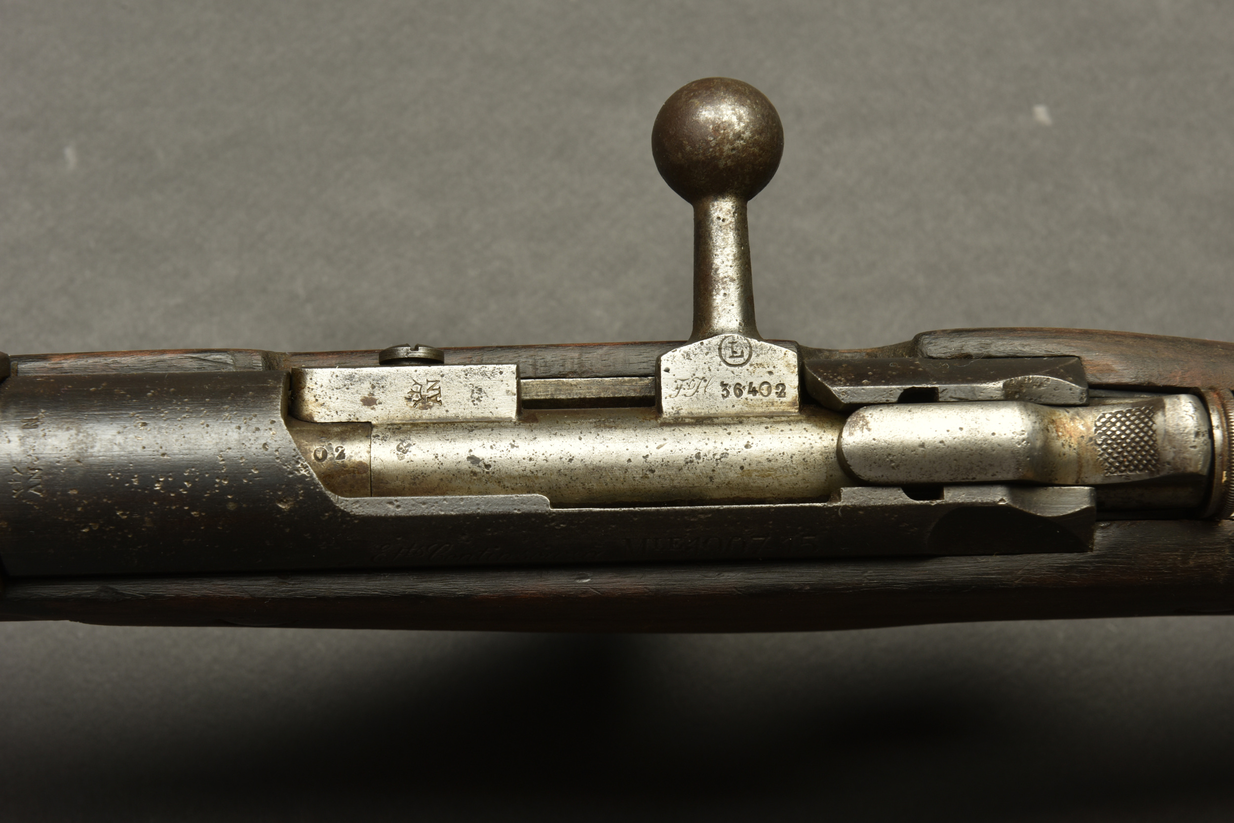 Fusil à répétition manuelle Mle 1907-15. Les garnitures métalliques sont oxydées. Fabrication des Ets Continsouza. Numéro FH36402. Belle crosse en bois, portant le même numéro que le... en savoir plus