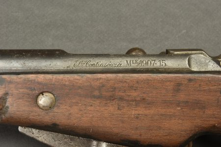 Détails de la vente >Fusil à répétition manuelle Mle 1907-15. Les garnitures métalliques sont oxydées. Fabrication des Ets Continsouza. Numéro FH36402. Belle crosse en bois, portant le même numéro que le... en savoir plus