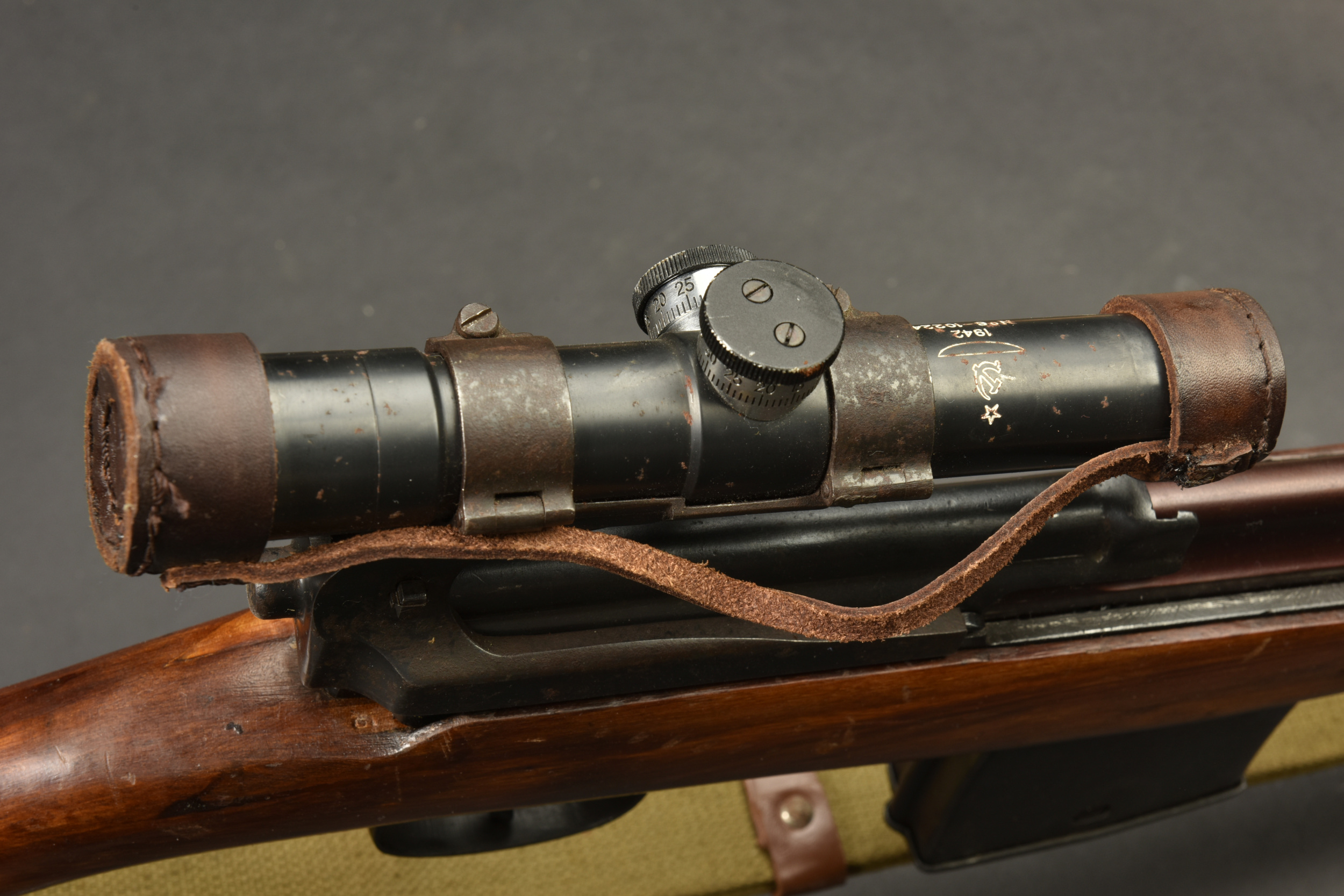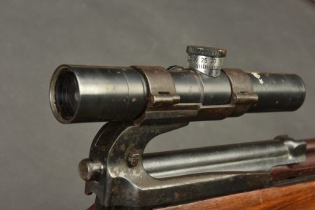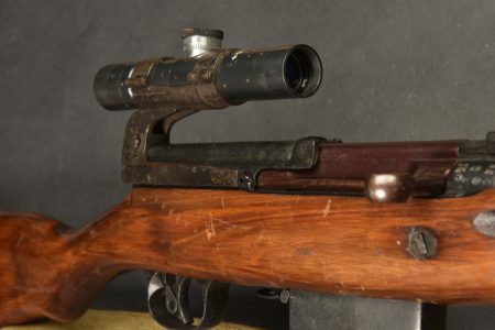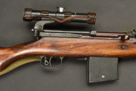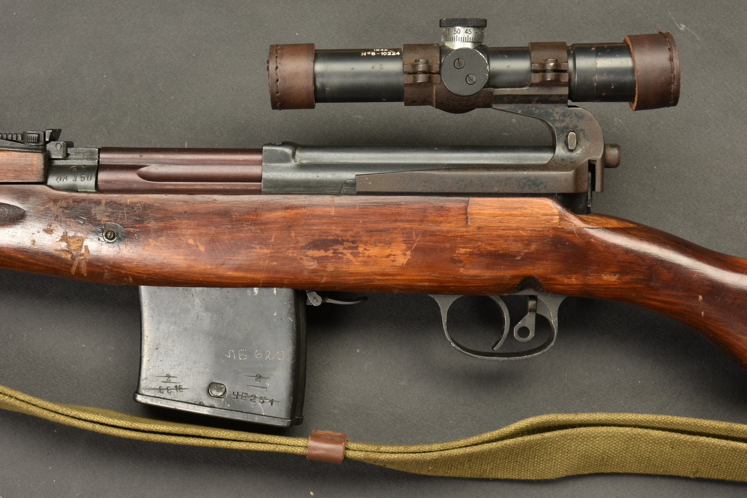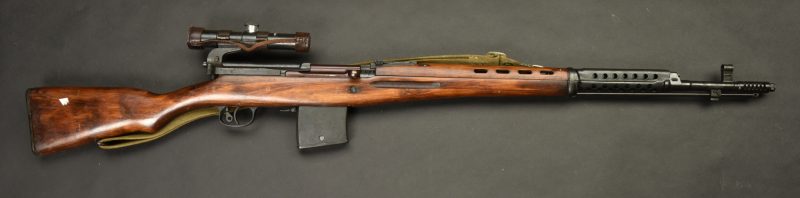 Fusil semi automatique SVT 40 Tokarev. Garnitures métalliques en couleur d’origine à 90%. Baguette de nettoyage complète. Chargeur et culasse bloqués par la neutralisation. Daté 1941. Numéro HA150. Bretelle en toile complète. Lunette complète avec ses protections en cuir marron. Marquée 1942 N6-10224. Optique claire présentant quelques tâches. Support de lunette portant le numéro HB 1548. Catégorie C9. Arme neutralisée aux nouvelles normes européenne par le Banc d’épreuve de Saint Etienne. Cette arme doit être déclarée avec Cerfa et certificat médical de moins de 1 mois ou licence de tir tamponnée ou permis de chasse valide (art R312-56). La délivrance de l’arme n’aura lieu qu’après consultation du fichier Finadia. L’inscription de l’acheteur sur ce fichier entrainera automatiquement la nullité de la vente. A noter une certaine usure et patine de la pièce. Etat II+.