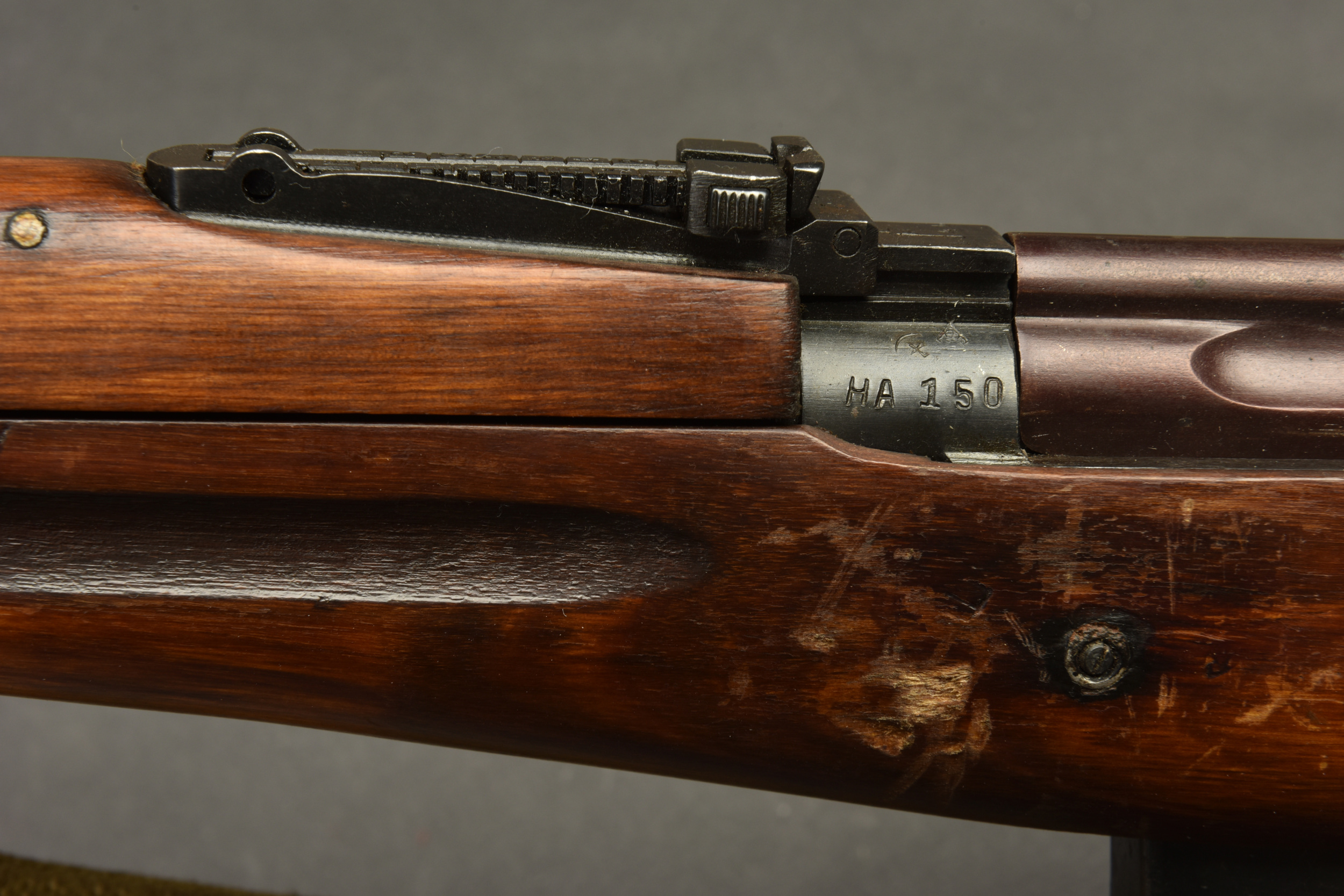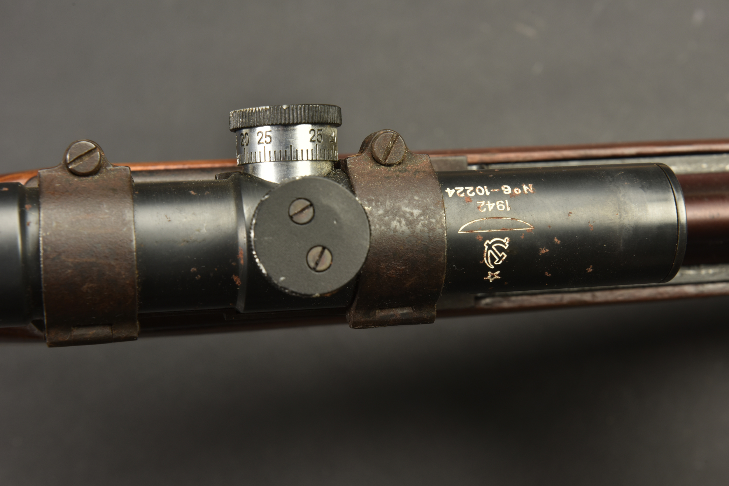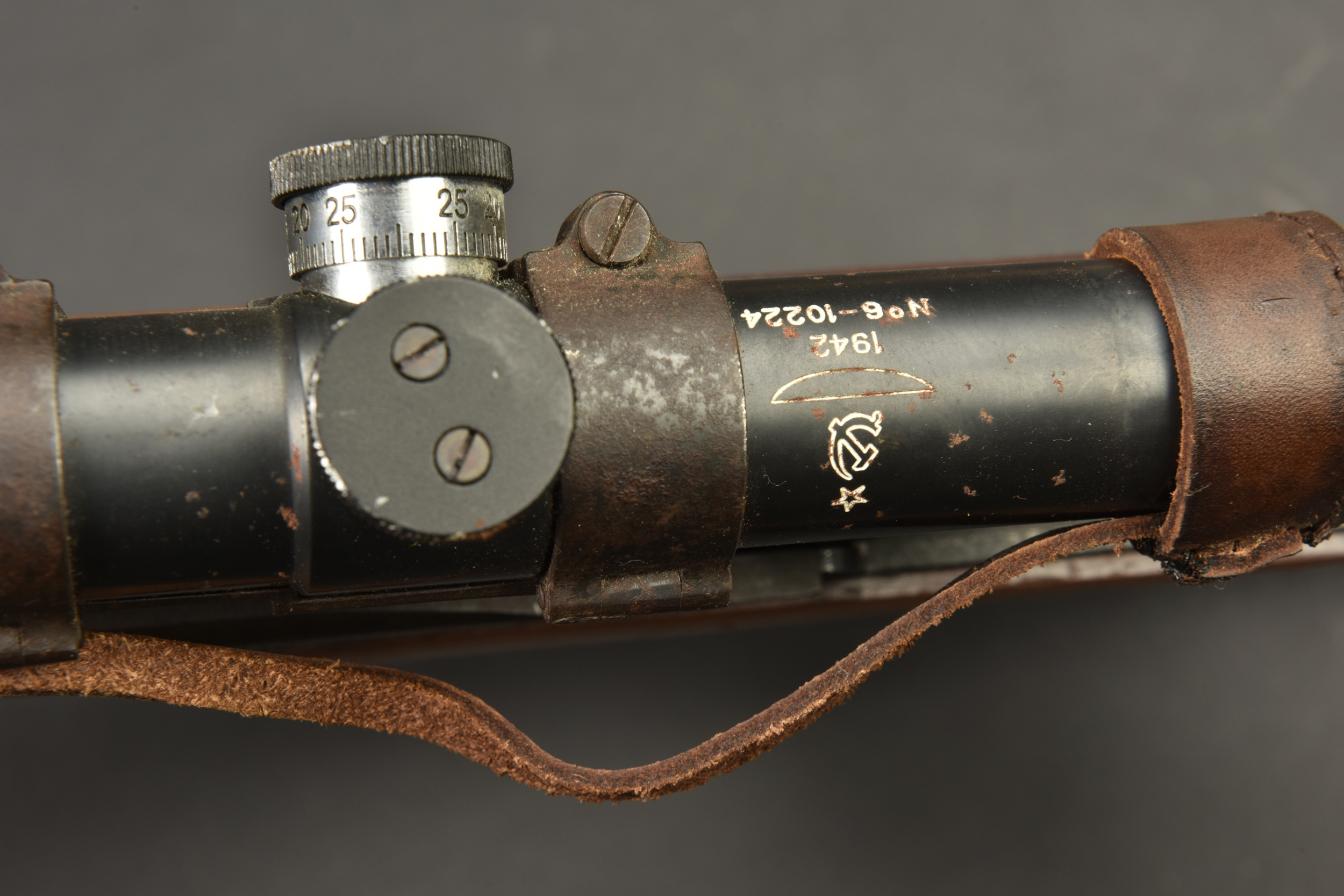 Fusil semi automatique SVT 40 Tokarev. Garnitures métalliques en couleur d’origine à 90%. Baguette de nettoyage complète. Chargeur et culasse bloqués par la neutralisation. Daté 1941. Numéro HA150. Bretelle en toile complète. Lunette complète avec ses protections en cuir marron. Marquée 1942 N6-10224. Optique claire présentant quelques tâches. Support de lunette portant le numéro HB 1548. Catégorie C9. Arme neutralisée aux nouvelles normes européenne par le Banc d’épreuve de Saint Etienne. Cette arme doit être déclarée avec Cerfa et certificat médical de moins de 1 mois ou licence de tir tamponnée ou permis de chasse valide (art R312-56). La délivrance de l’arme n’aura lieu qu’après consultation du fichier Finadia. L’inscription de l’acheteur sur ce fichier entrainera automatiquement la nullité de la vente. A noter une certaine usure et patine de la pièce. Etat II+.